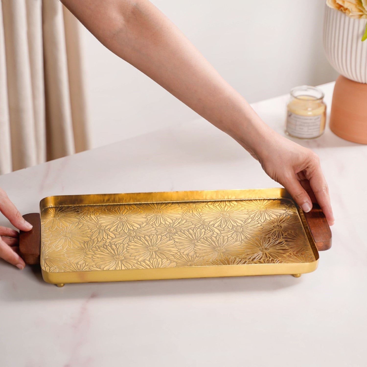 Design: Finished in gold, this metal tray features an etched daisy design, adding a touch of artistry to its clean, sleek surface. The mango wood handles offer a warm contrast, providing both style and ease of use. Additionally, the tray features metal legs, giving it added stability and creating a gap between the surface and the tray to protect your table from heat.