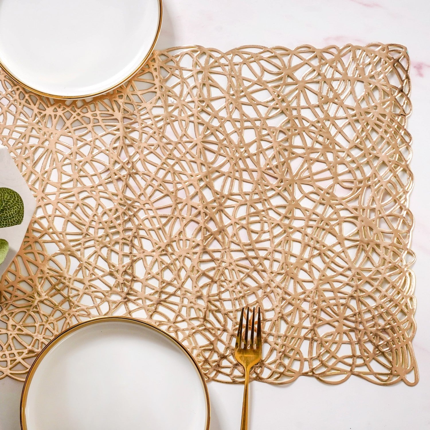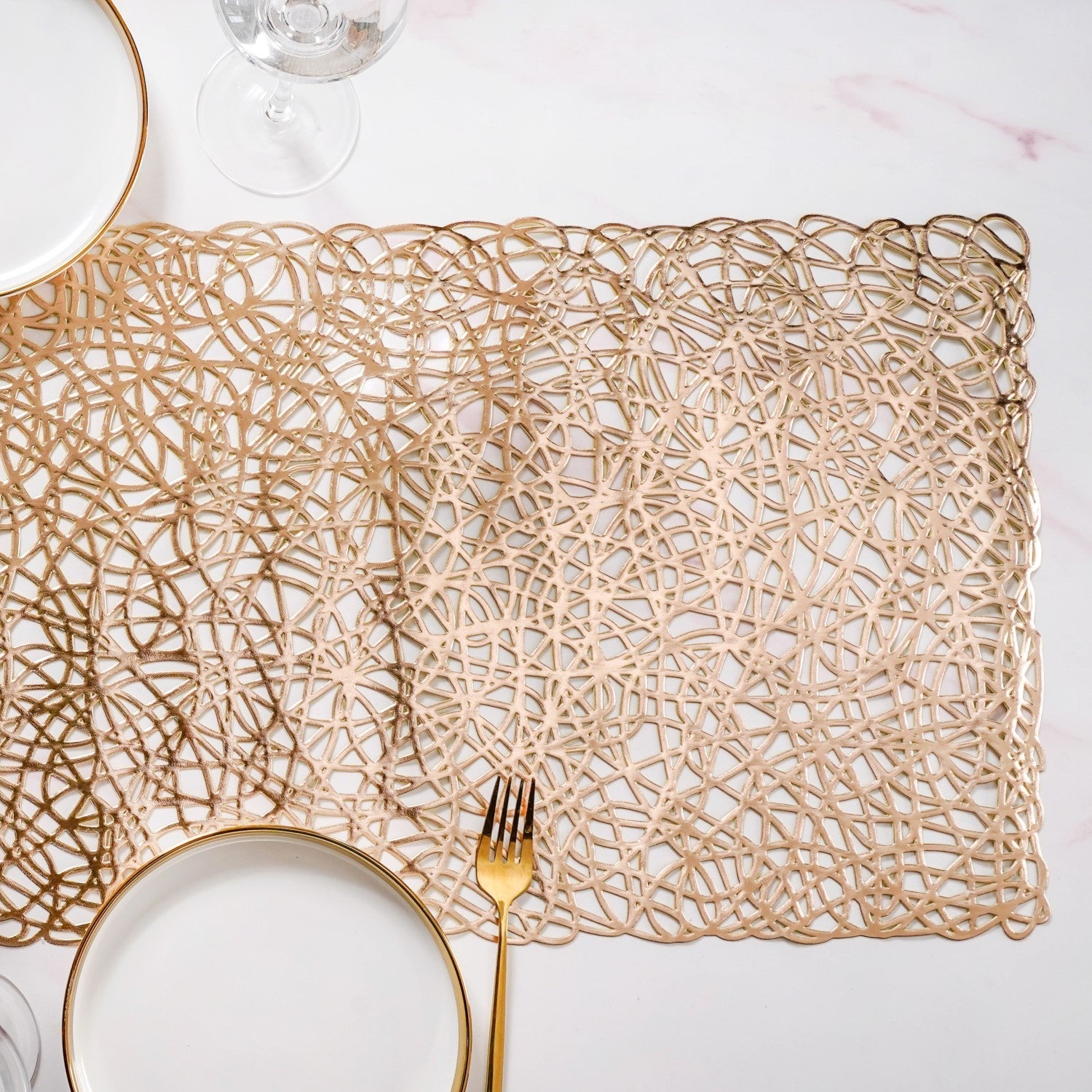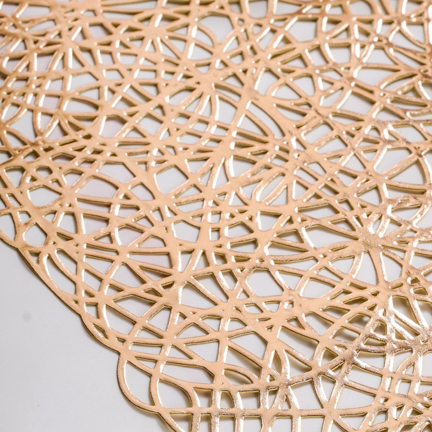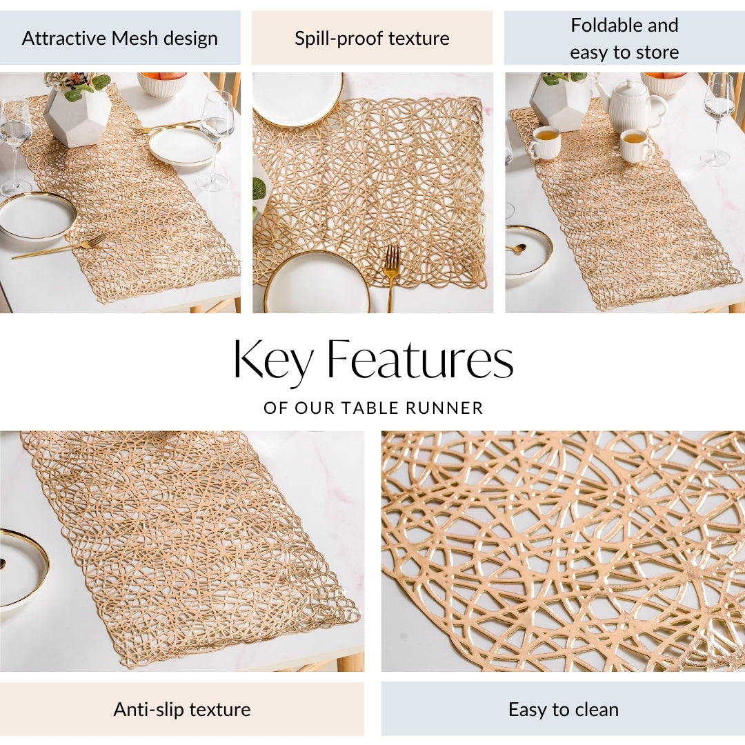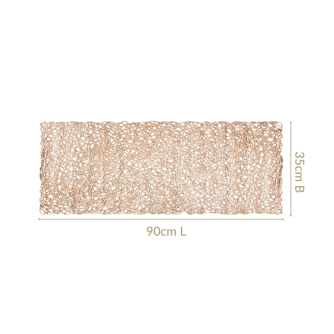 Design: This spectacular dining table runner showcases a mesmerising, openwork design that’s pure artistry in gold. Its intricate pattern forms an organic network of interconnected lines, reminiscent of a beautifully tangled branch system or delicate, abstract lace. The sophisticated golden hue gleams with every shift of light, enhancing the detailed cut-out work. This airy structure allows the underlying table surface or tablecloth to peek through, creating a dynamic visual interplay.
