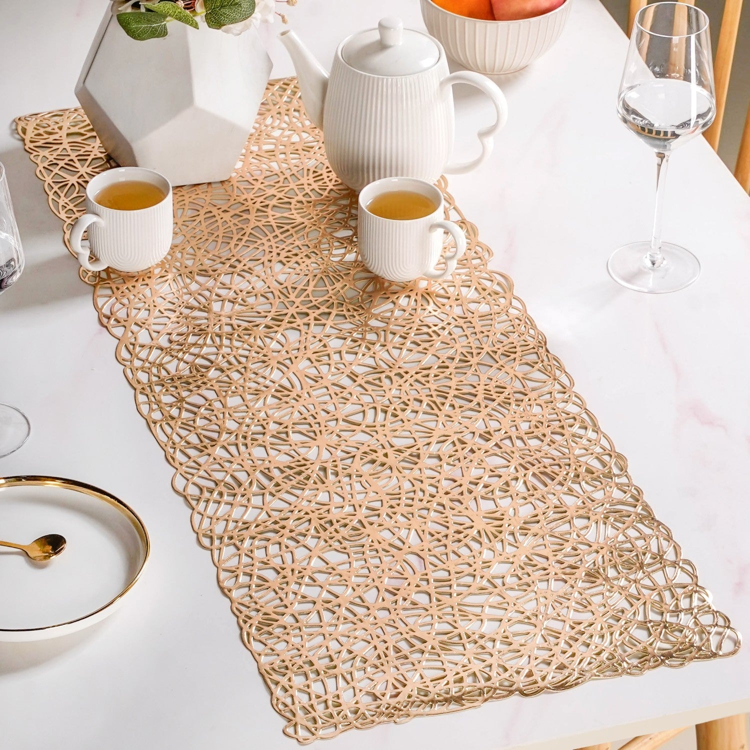 Turn everyday dining into a visual delight with this sculptural dining table runner! Their airy, cut-out design and golden sheen bring texture, light, and effortless drama to your dining room table decor ideas.
