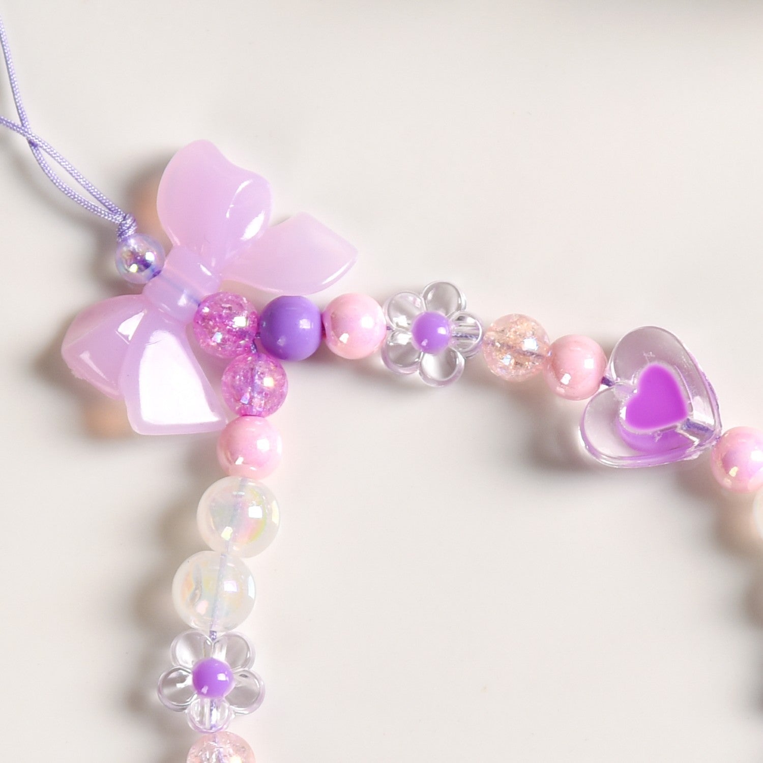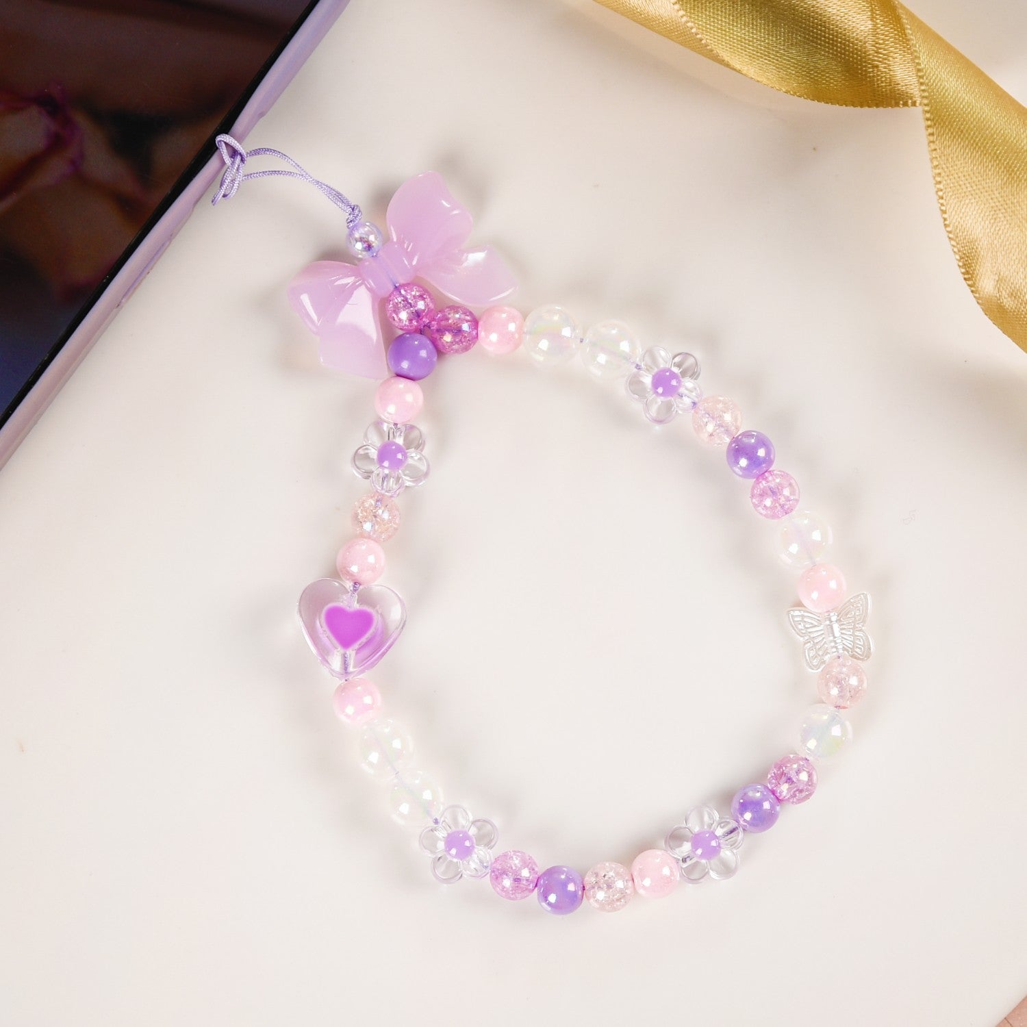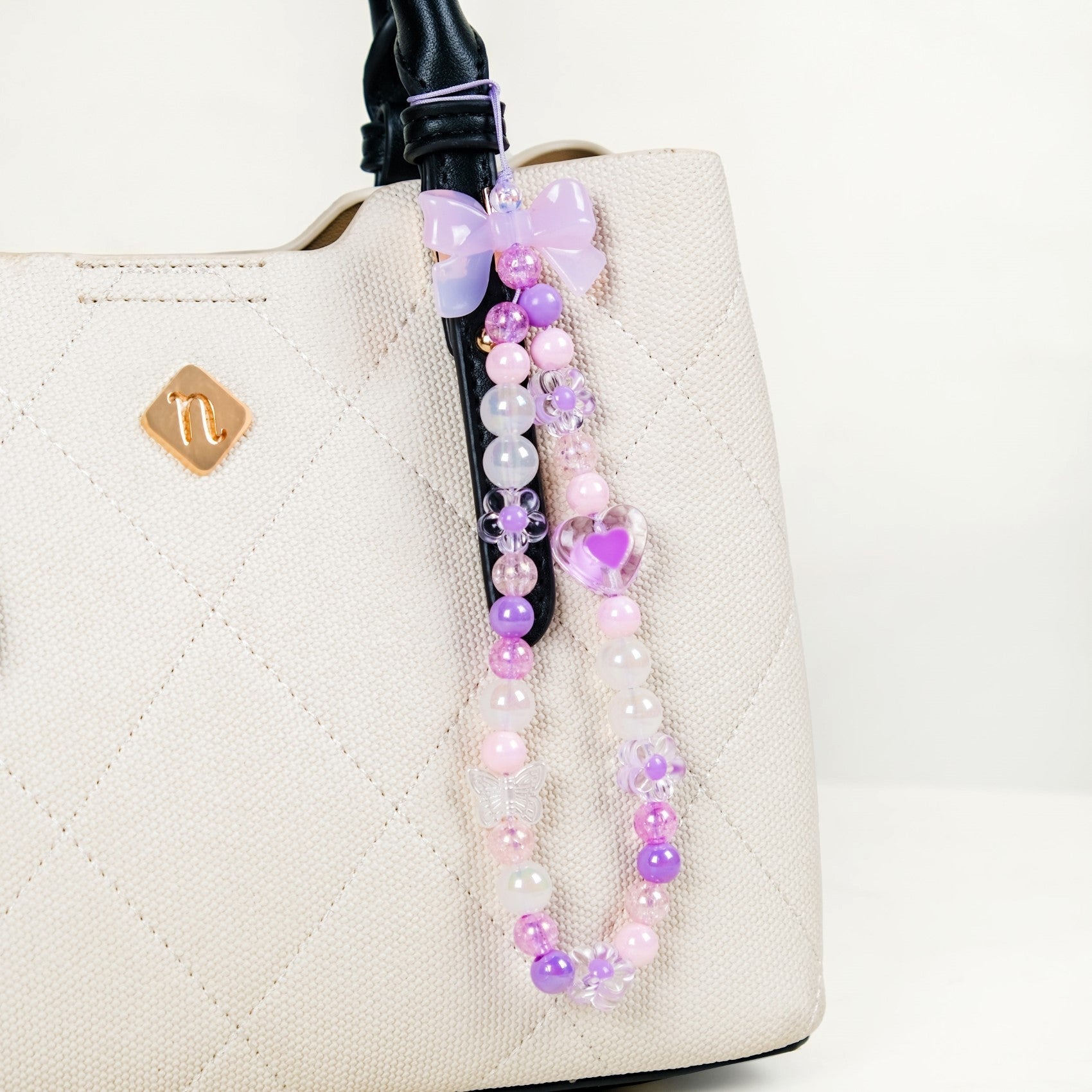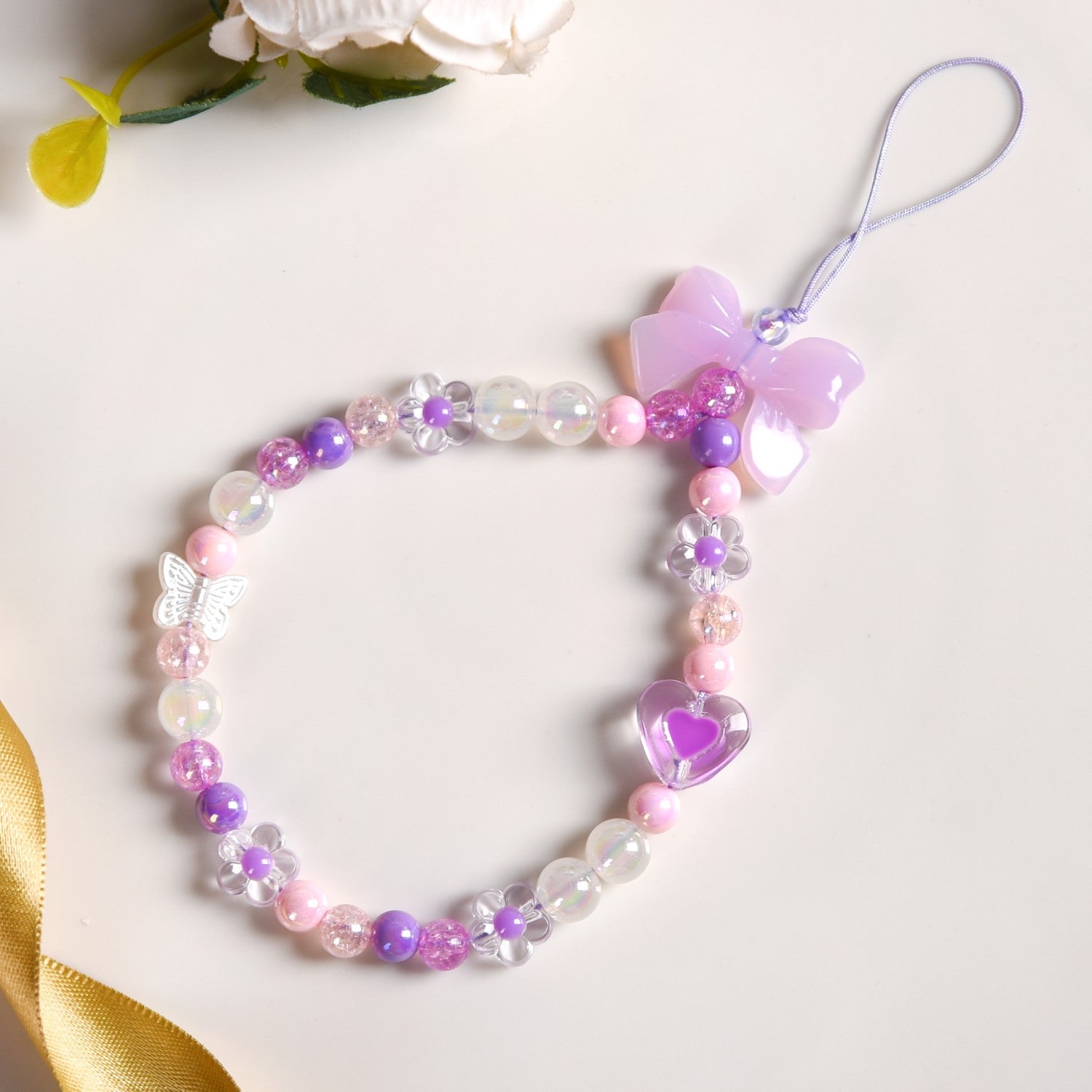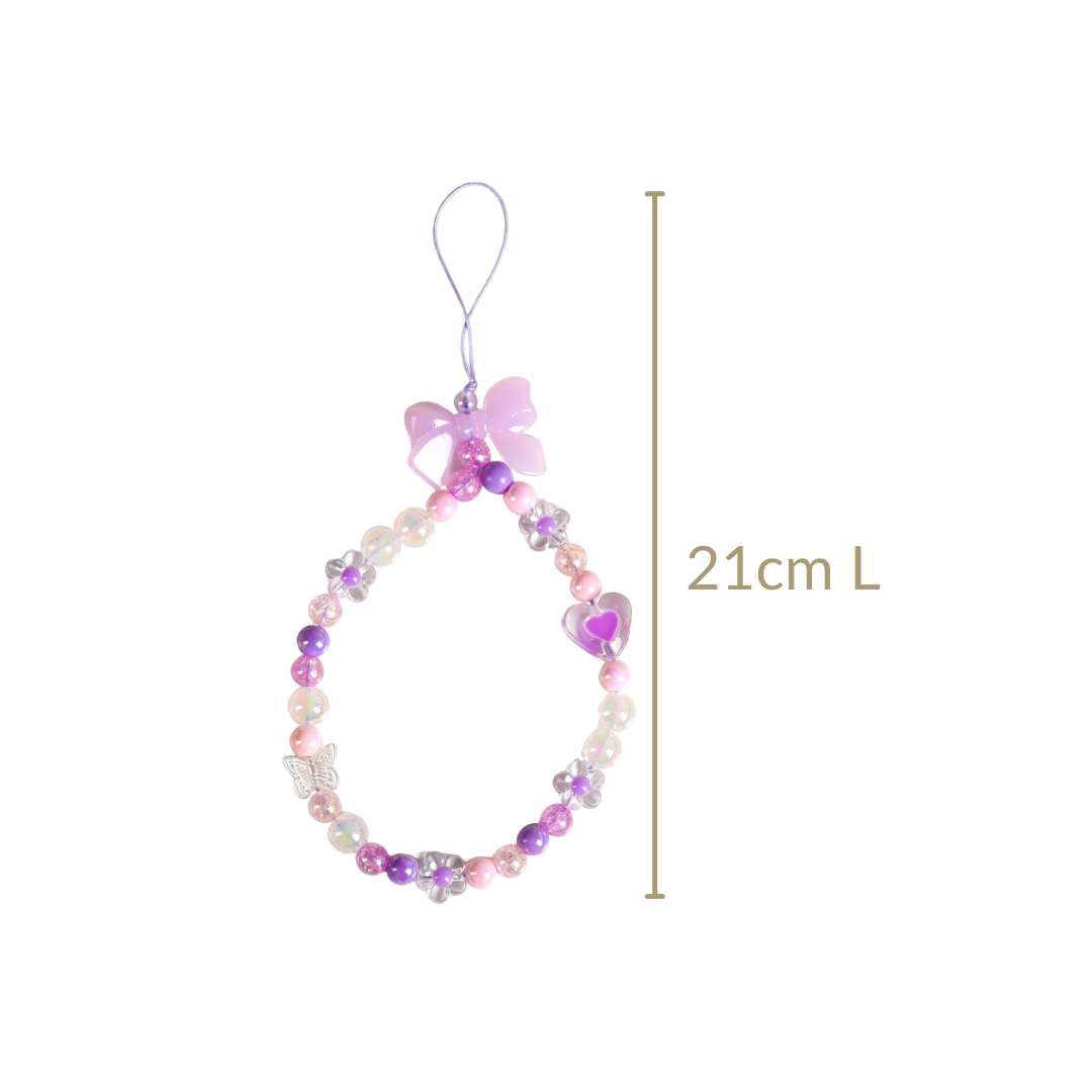 Bring a burst of colour and charm to your phone with this whimsically chic phone charm. Designed to add sparkle to your day, this phone accessory is made from high-quality PVC, offering exceptional durability and a playful, vibrant look. The soft lavender bow at the top is surrounded by shimmering iridescent beads in hues of purple, pink, and white. The sparkling purple and pink beads add a touch of magic, while the flower-shaped beads accompanied by a butterfly and heart charm bring the perfect finishing touch. Ideal for adding personality and flair, this phone charm effortlessly combines style and fun, making it the perfect accessory to brighten up your device.