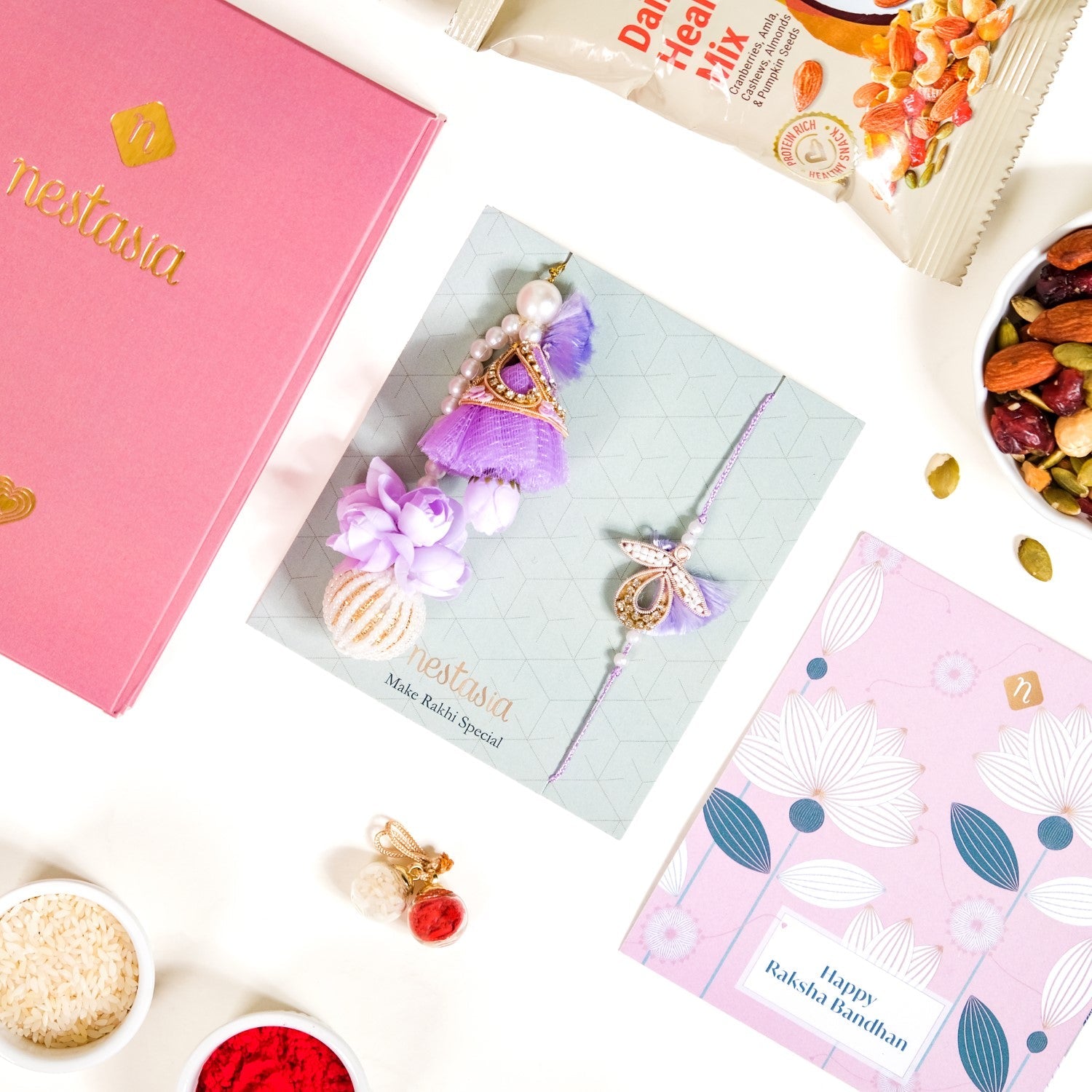 Let heartfelt sentiments meet artisanal delights with our curated Rakhi gift box. The hamper includes 1 gorgeous Rakhi band, 1 Lumba, a roli-chawal set, and a pack of mixed dry fruits. Handcrafted meticulously with precision and attention to detail, the Rakhi band has been adorned with gorgeous motifs, glitzy stones, and mini pearl embellishments. The eye-catching Lumba features a silky purple tassel adorned with sequins, stones, and golden accents, with a golden moti ball dangling gracefully from it. The roli-chawal set comes in handy for rituals, while the delightful medley of mixed fruits adds a special touch to your celebration.