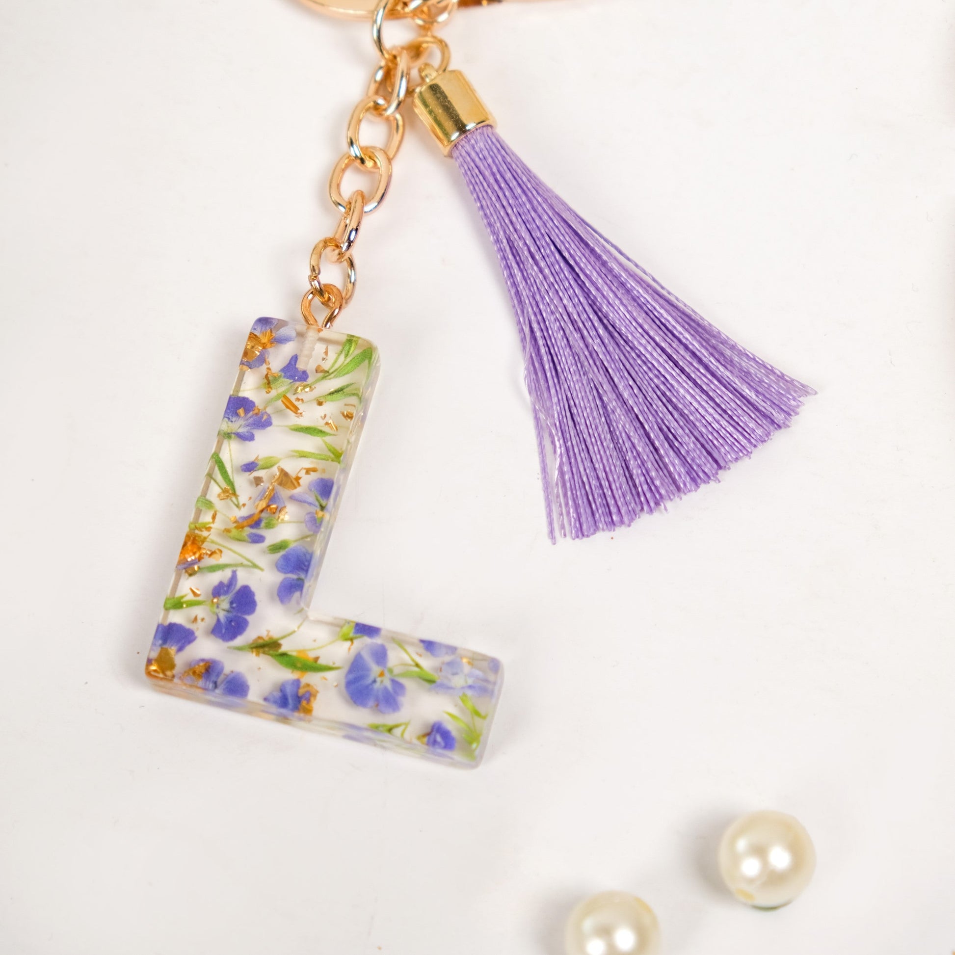 Upgrade your glam quotient with our elegant "L" resin keychain. This exquisite key ring features delicately pressed lavender forget-me-nots, also known as scorpion grass, that are paired with shimmering golden flecks. All of these come encased in the L-shaped transparent resin base.
