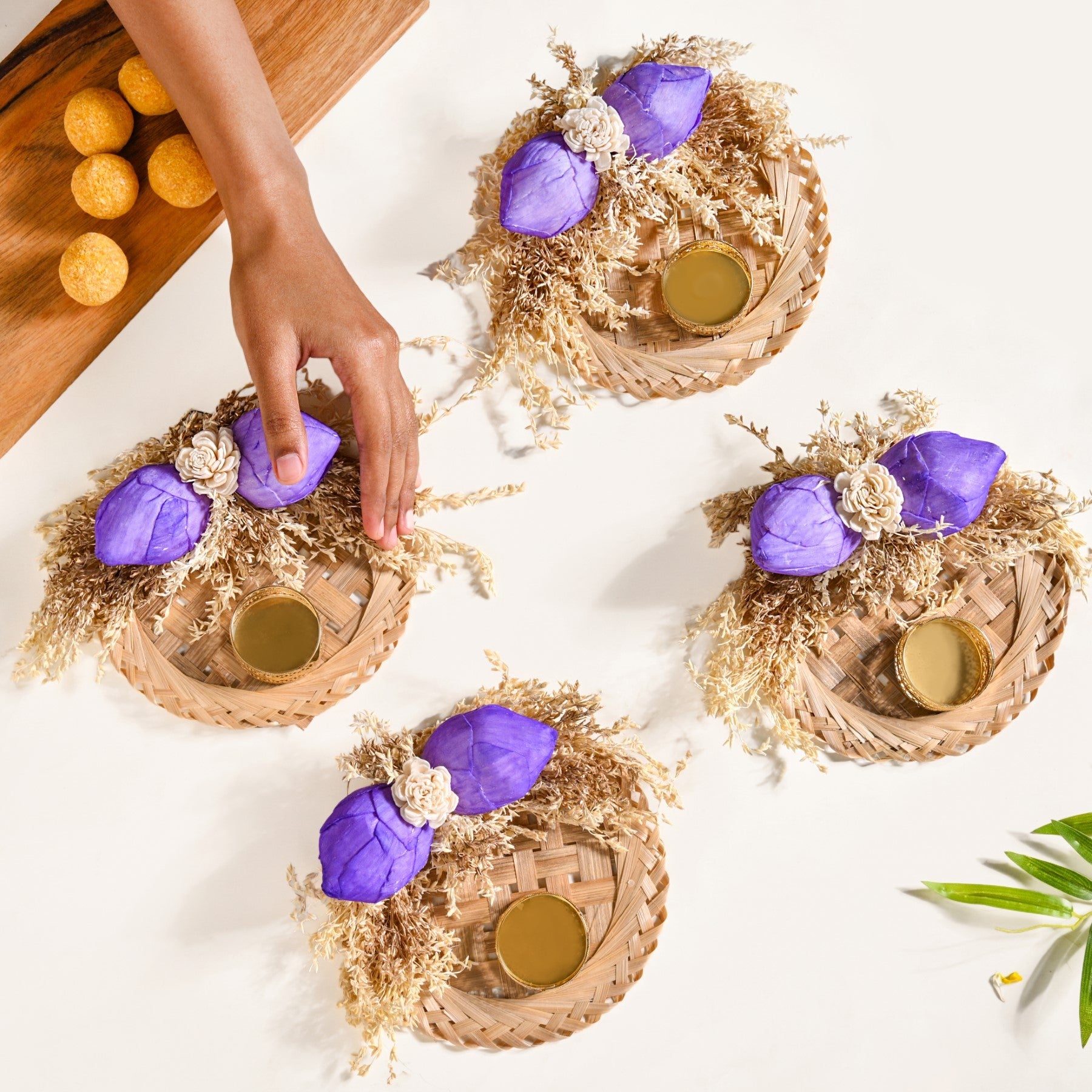 Design: Turn every celebration into a mindful moment with our organic tea light holder. Designed to bring a rustic yet elegant glow to your festive spaces, each tea light holder is a blend of sustainable materials and intricate detailing. Handwoven with palm leaf, accented with dried flowers, and crowned with a pastel sola wood bloom, this set creates a visual harmony of colour and texture. Crafted using biodegradable sola wood flowers, dried grass, palm leaf base, and a golden-finished metal insert, this set combines traditional craftsmanship with sustainable materials.