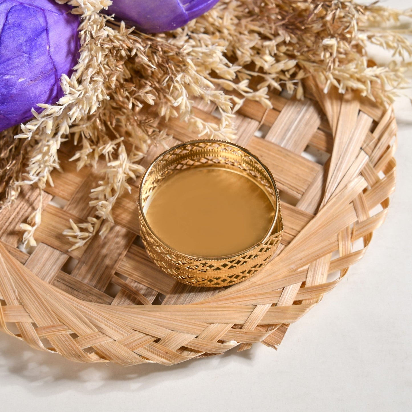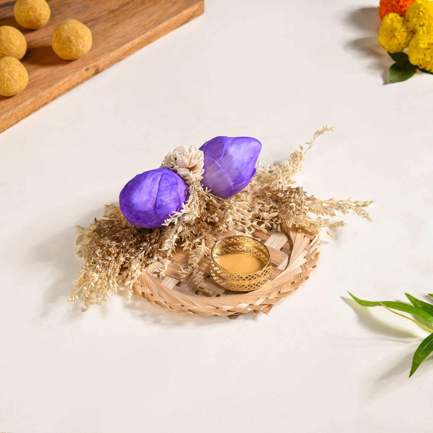 Benefit: This set is reusable, biodegradable, and easy to maintain - perfect for eco-conscious celebrations. The lightweight build makes it easy to move and style, while the golden insert ensures your candles stay safe and stable. Whether you use real tea lights or LED versions, the holders bring a warm, calming ambience. Ideal for poojas, dinner parties, and gifting, these dried flower accents help create thoughtful decor that celebrates both tradition and nature.