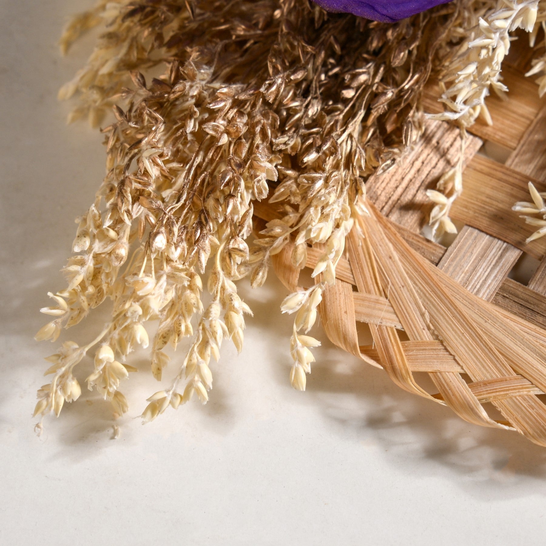 The oval purple dried florals add a pop of pastel charm, while the neutral base of soft beige and wheat tones keeps the look grounded and organic.