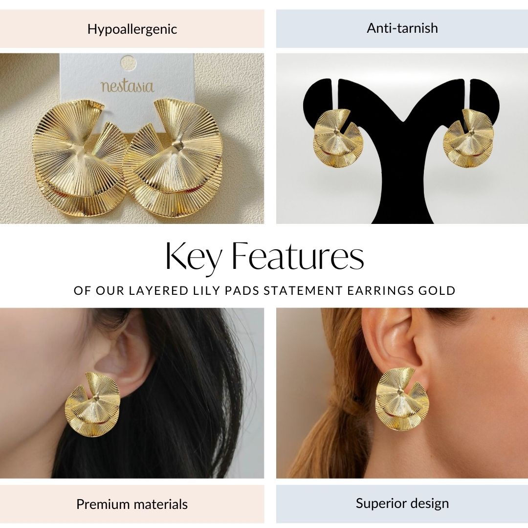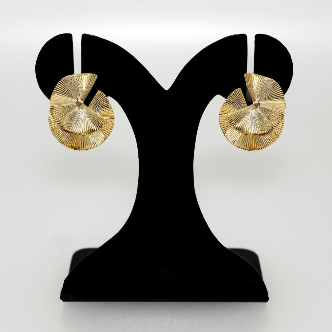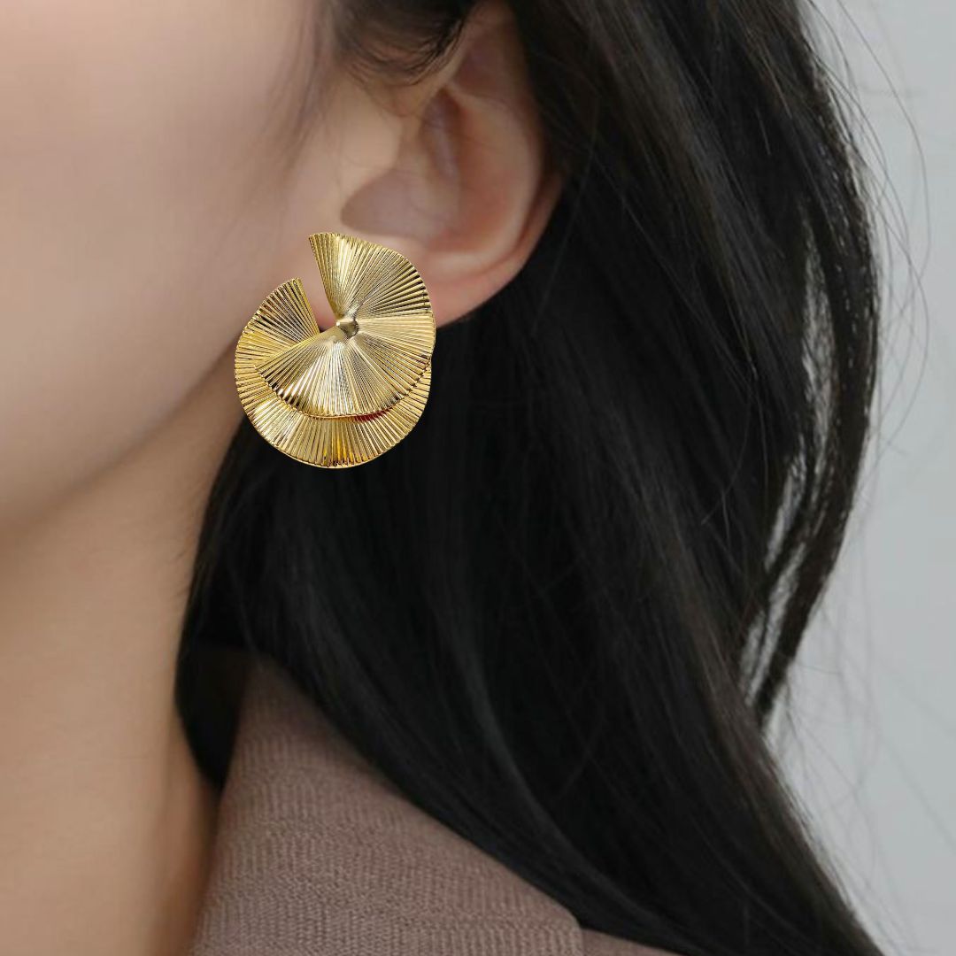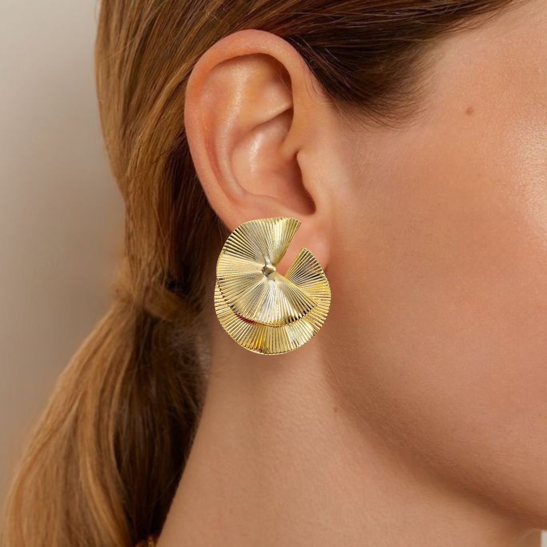 These striking statement earrings radiate a refined charm with their intricate details and bold angles. Drawing inspiration from the beauty of contemporary design, the earrings reimagine the natural geometry of shapes in a luxurious gold finish. The delicate textures and layered design create a striking depth, reflecting light with every movement. Perfect for those who appreciate timeless elegance, these earrings are a versatile piece that seamlessly enhances both day and evening looks.