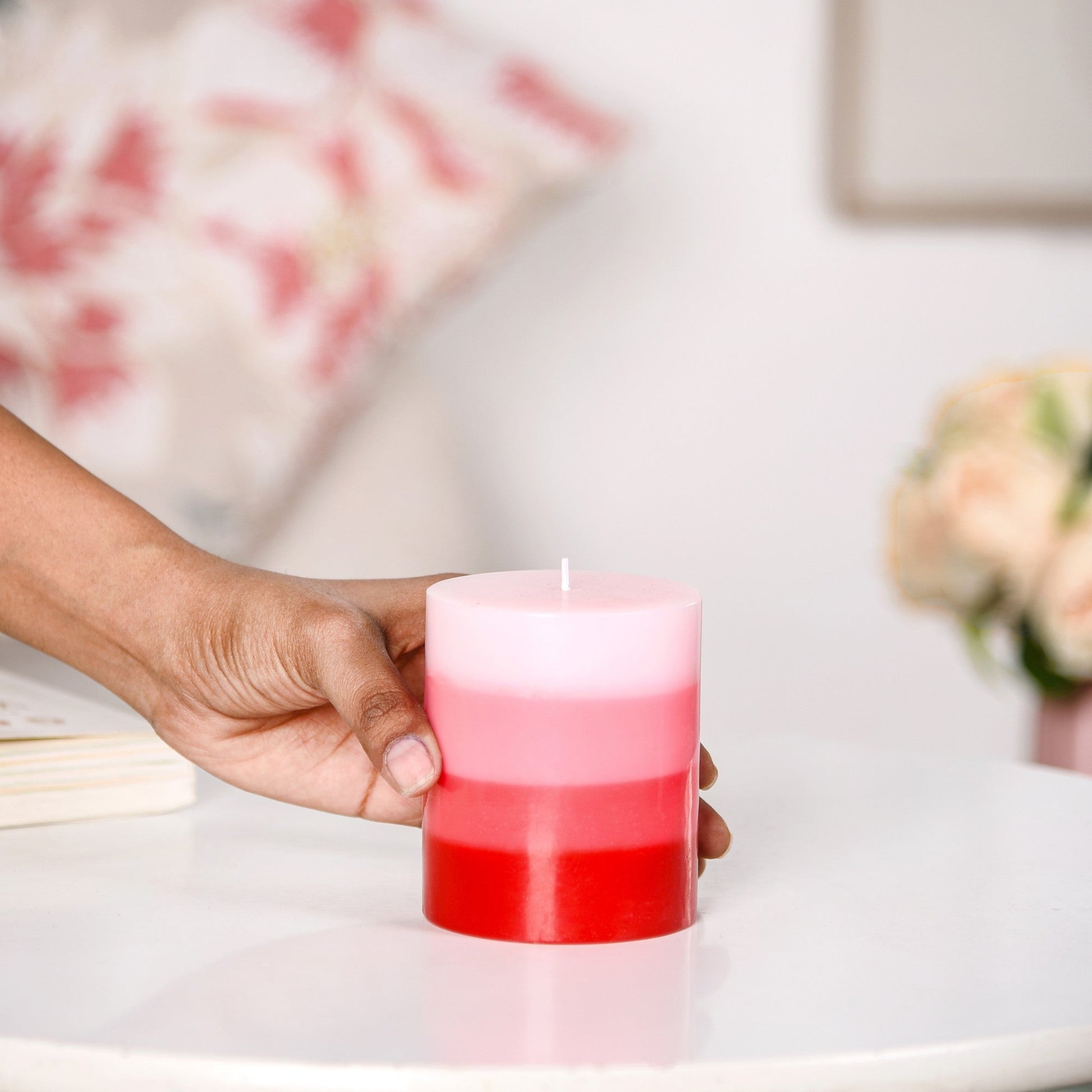 Design: A visual delight, this pillar candle features a mesmerising layered ombre effect, blending seamlessly from soft pastel pink at the top to a deep, passionate red at the base. The candle's gradual shift in tones creates a striking, modern look that catches the eye and adds a pop of style to any space.