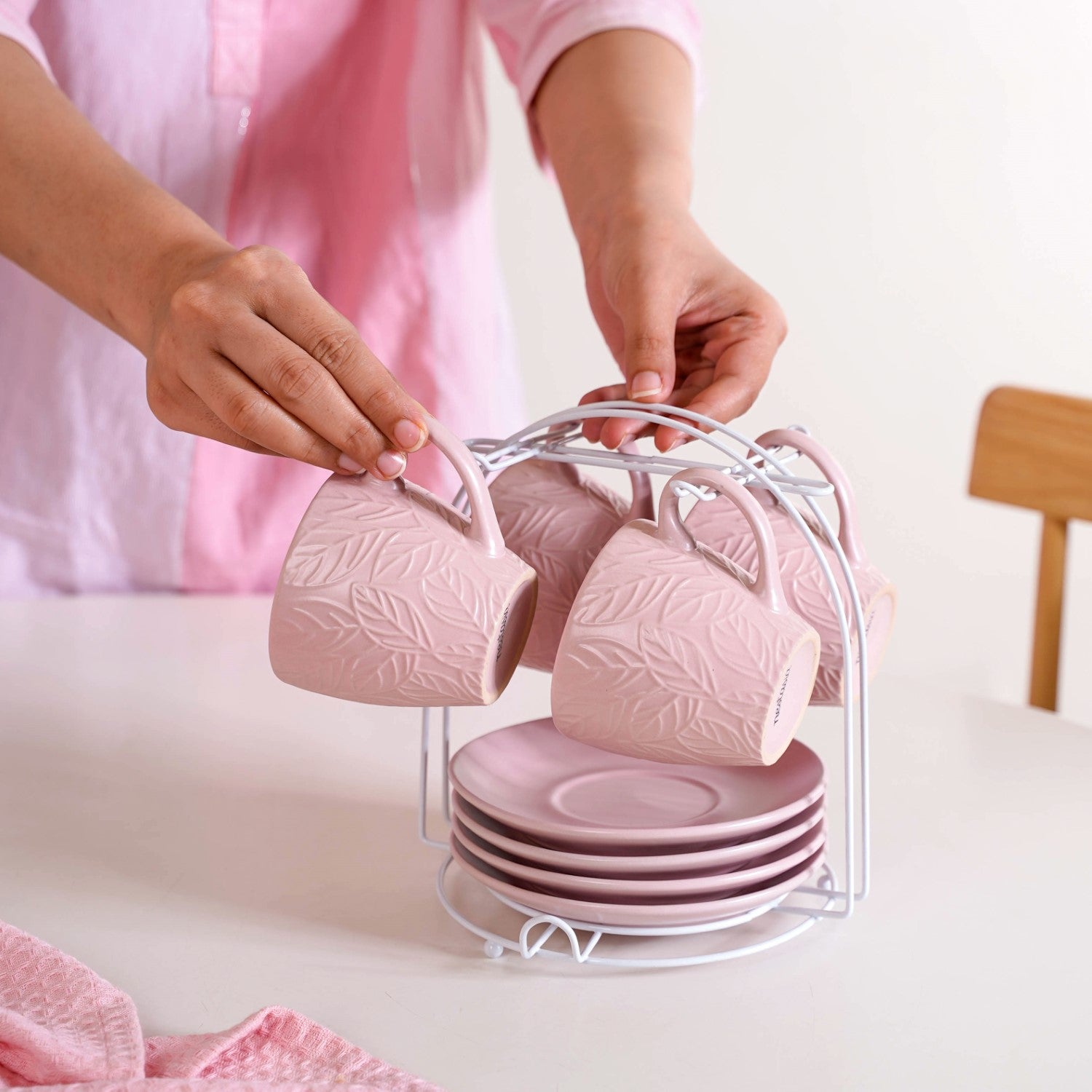 Design: Washed in a pastel pink shade for a soft yet elegant look, these tea mugs bring a fresh feel to your daily routine and gatherings alike. Complemented by strikingly beautiful embossed leaf motifs, these tea mugs highlight precise craftsmanship. Complete with colour-matched saucers for unified style and practicality, the tea cup and saucer set covers the whole nine yards when it comes to your tea customs. Also included in the ensemble is a sturdy stand which aids in effortless organisation and provides a streamlined look.