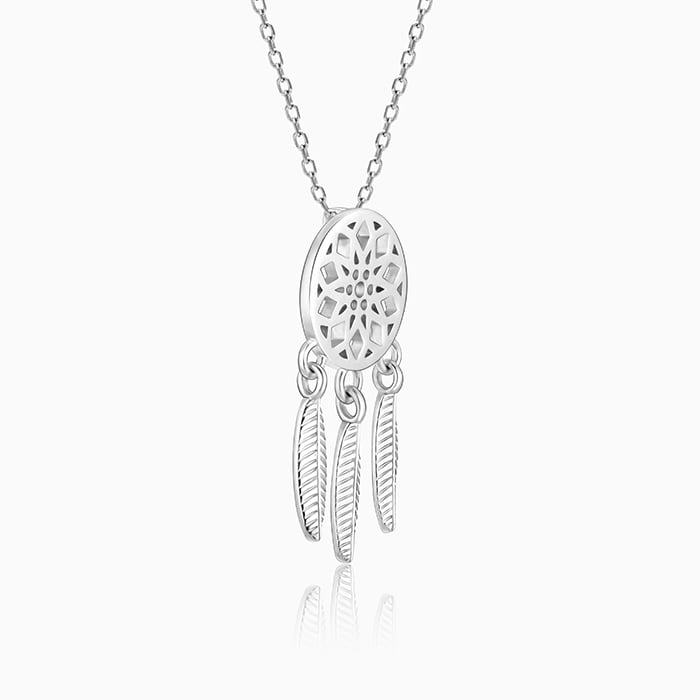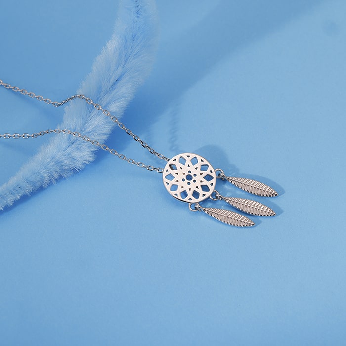 The silver necklace has a dreamcatcher design with feather-like shapes dangling from it.