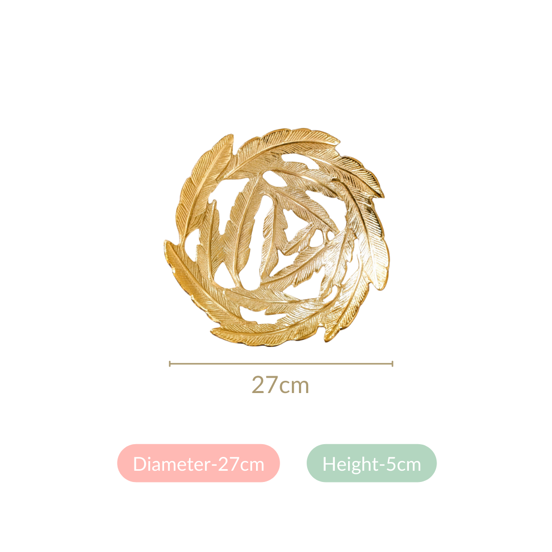 Turn your humble abode into a luxurious haven with our decorative tray, a statement piece designed to captivate. Made from rust-resistant aluminium, its radiant metallic gold hue promises enduring allure. Mimicking the natural beauty of a leaf cluster, intricate veins detailing adorn its surface, exuding sophistication. Supported by sturdy stands, it offers stability for displaying or serving with confidence. The tray is perfect for adding a touch of nature-inspired elegance to any room, whether as a centrepiece or accent piece. Embrace the fusion of functionality and artistry with this exquisite metal tray.