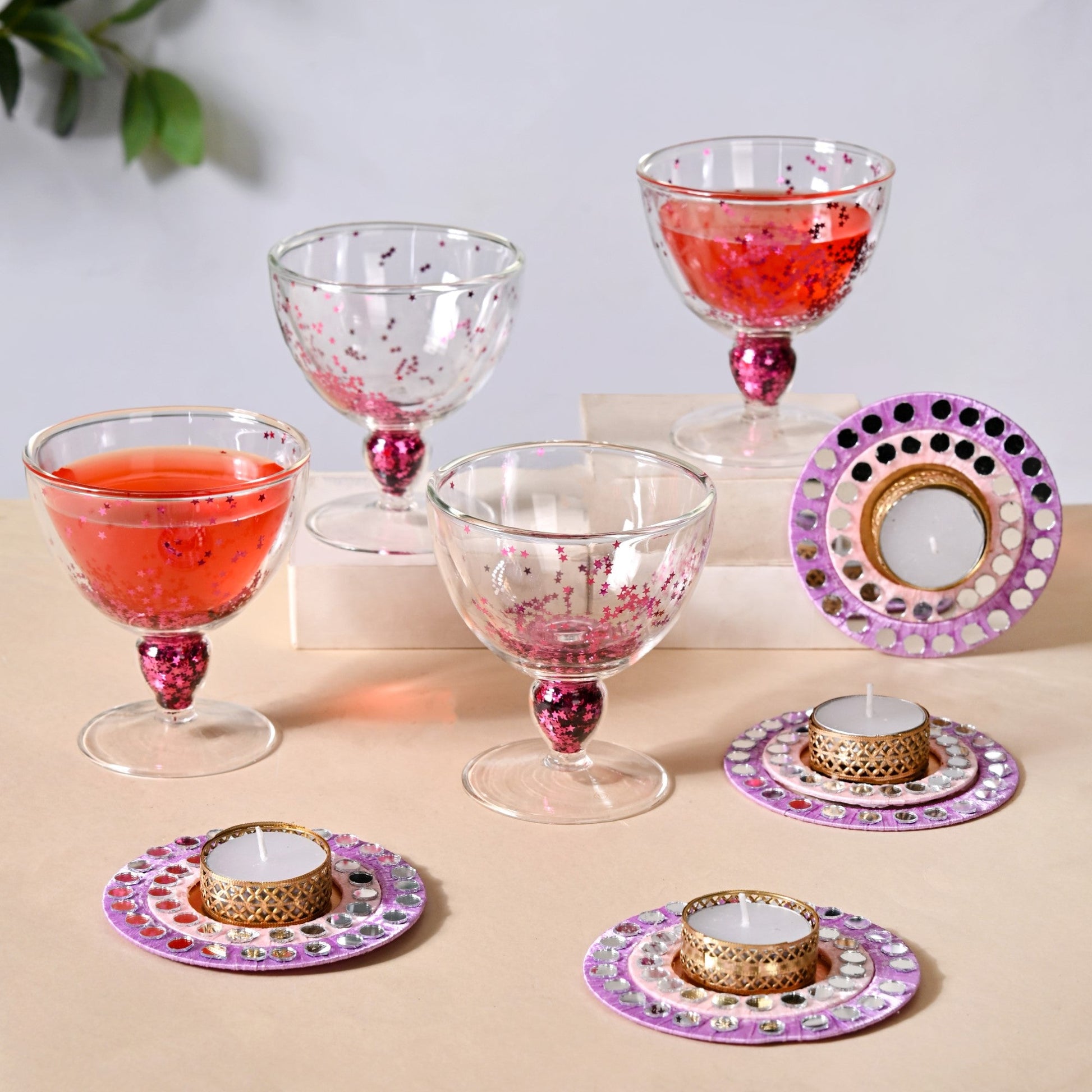 Add a splash of sparkle and shine to your Diwali celebrations with this dazzling gift hamper! Featuring 4 elegant stemmed wine glasses, each with double-walled insulation and filled with pink star-shaped sequins, these glasses bring a playful shimmer to every sip.