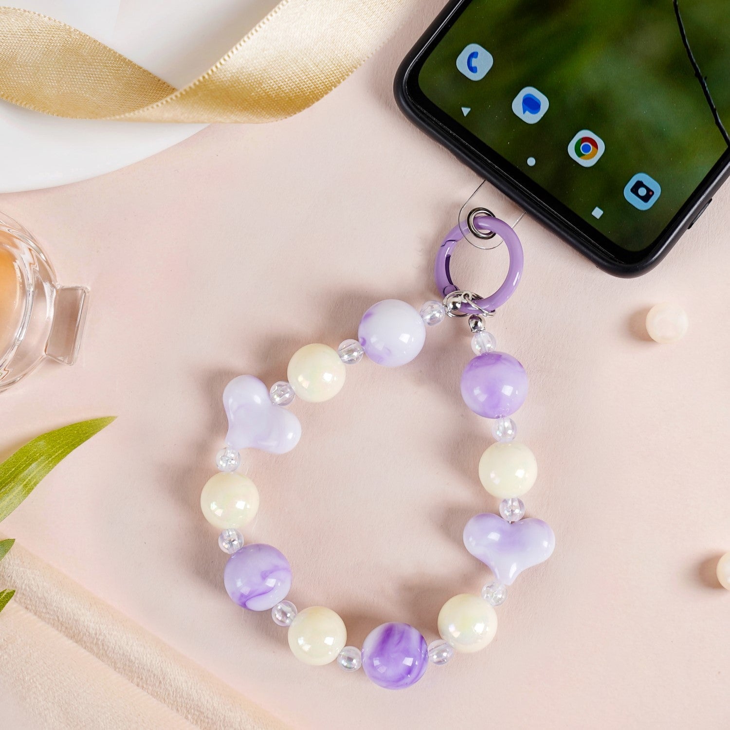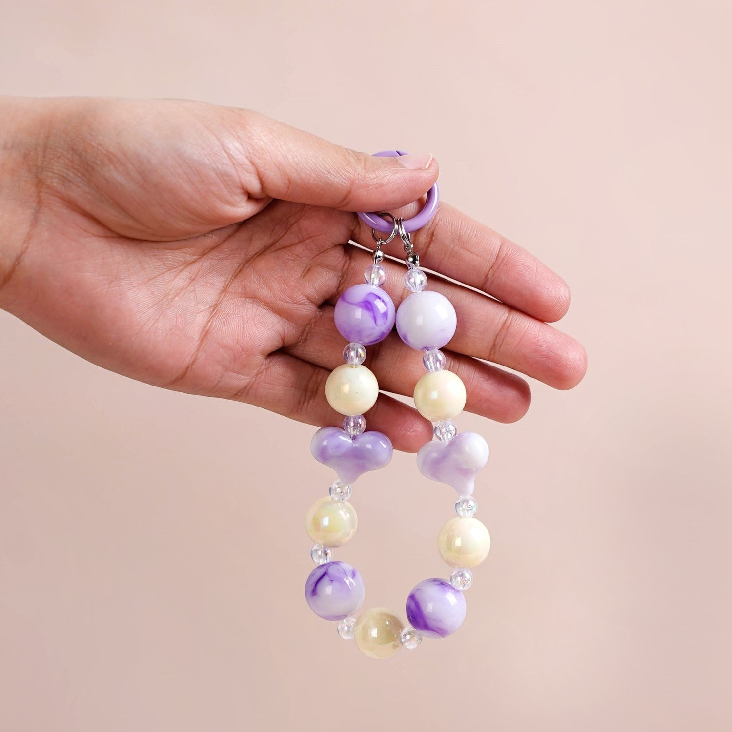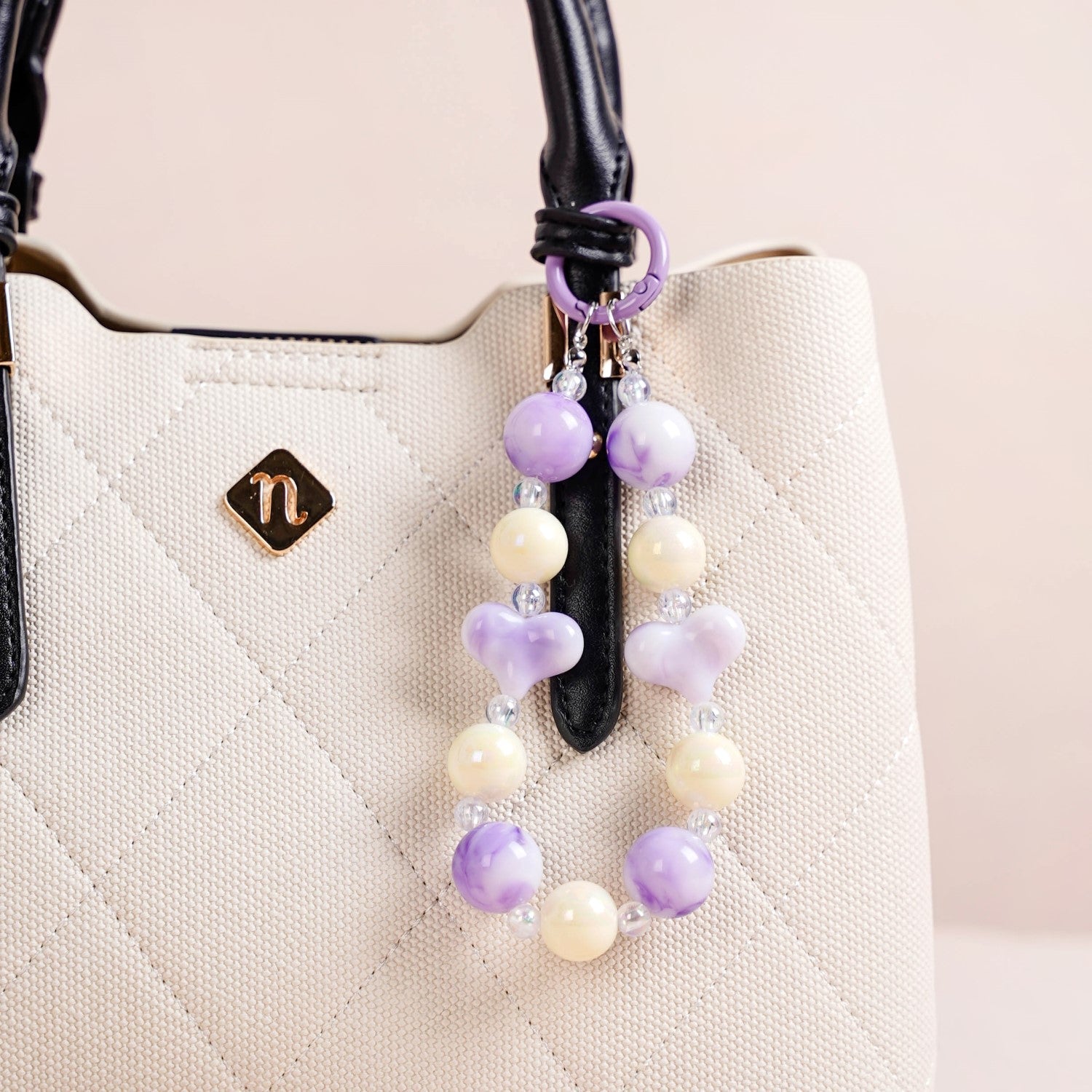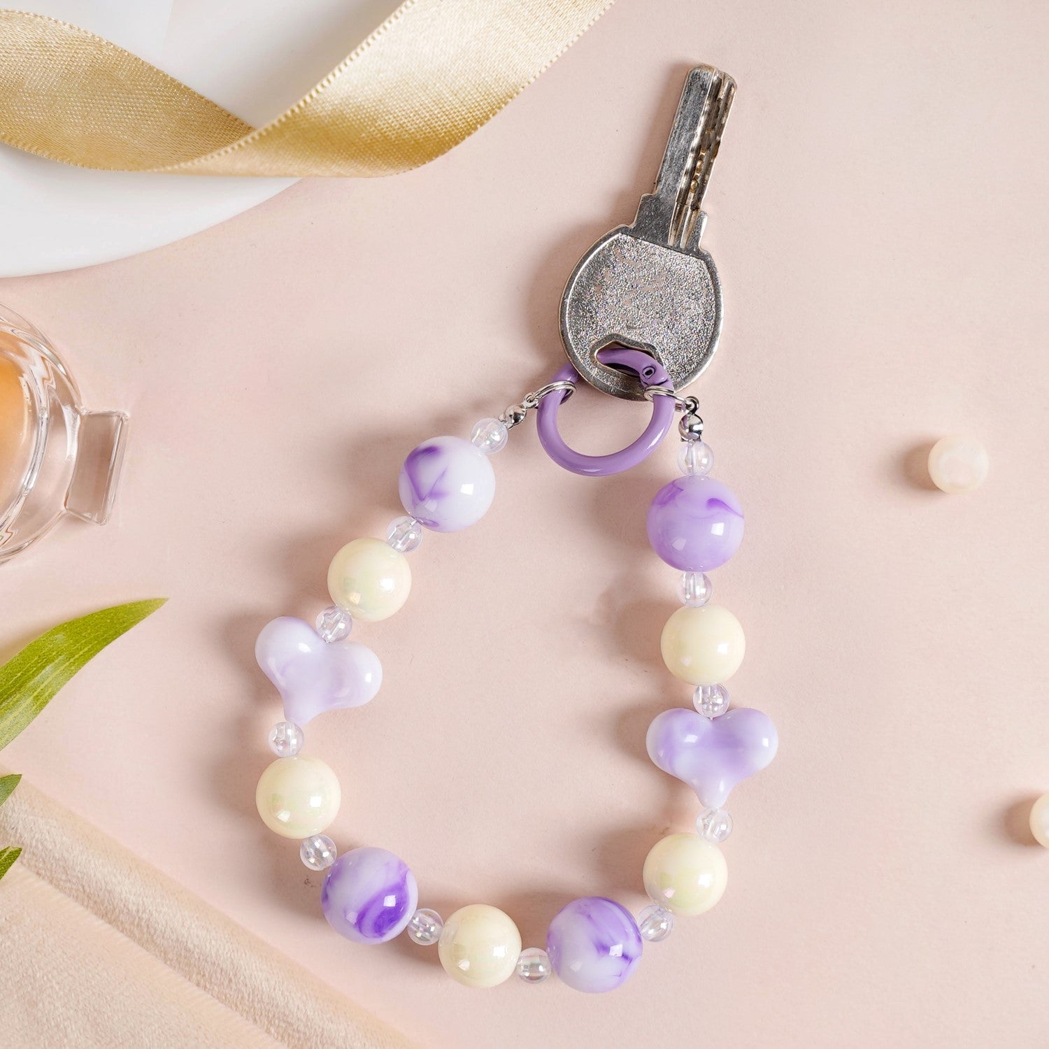 This lavender keychain combines elegance and versatility, featuring a round metal lobster clasp hook in charming lavender. Transparent beads shimmer with an iridescent glow, complemented by marble-patterned lavender and off-white beads, and a lavender heart adds a delicate touch.