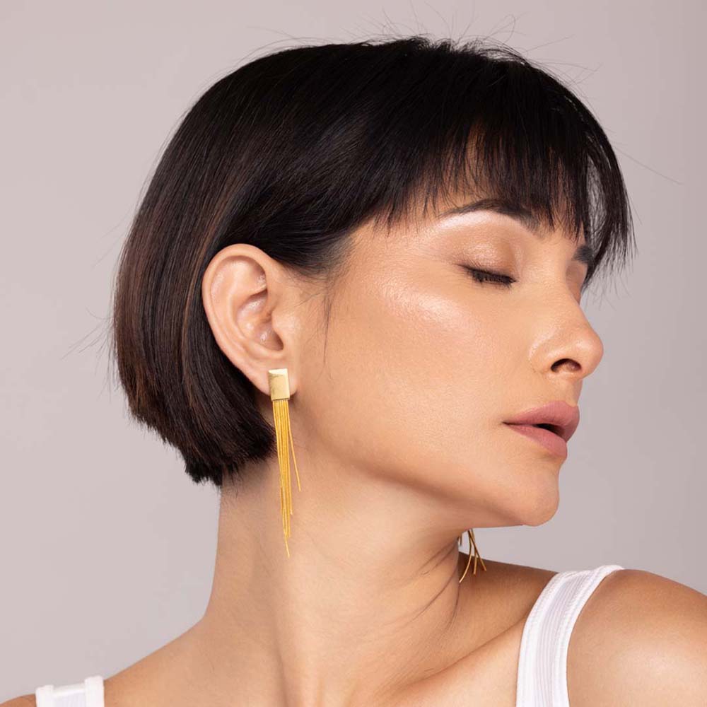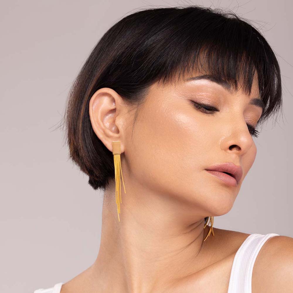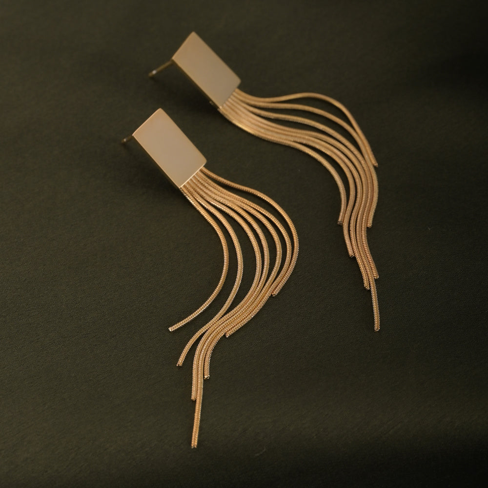 The exquisite Linear Cascade Square Earrings, where modern design meets timeless elegance. Each earring features a sleek square base, suspended from which are long, graceful lines that create a mesmerizing cascade effect. The geometric precision combined with the gentle sway of the elongated lines adds a touch of extra to any ensemble. Look effortlessly stylish with this versatile and chic accessory, perfect for formal and party occasions. Redefine your look with the Linear Cascade Square Earrings, a true statement of contemporary refinement.