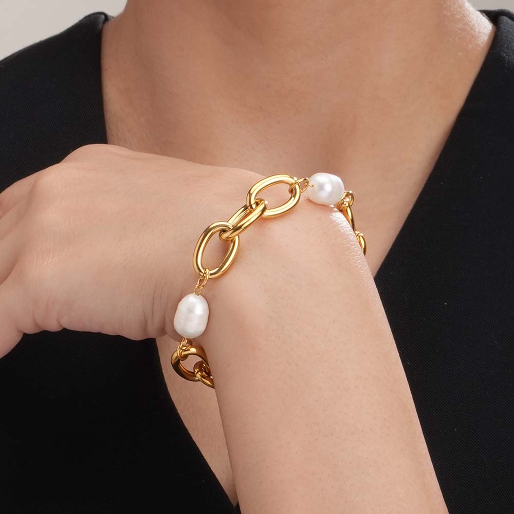 This bracelet features a graceful chain adorned with luminous pearls, symbolizing timeless beauty. Lightweight and secure, it balances elegance with comfort. Crafted in polished finish, it blends the richness of pearls with modern chain design, creating a sophisticated piece for versatile occasions.