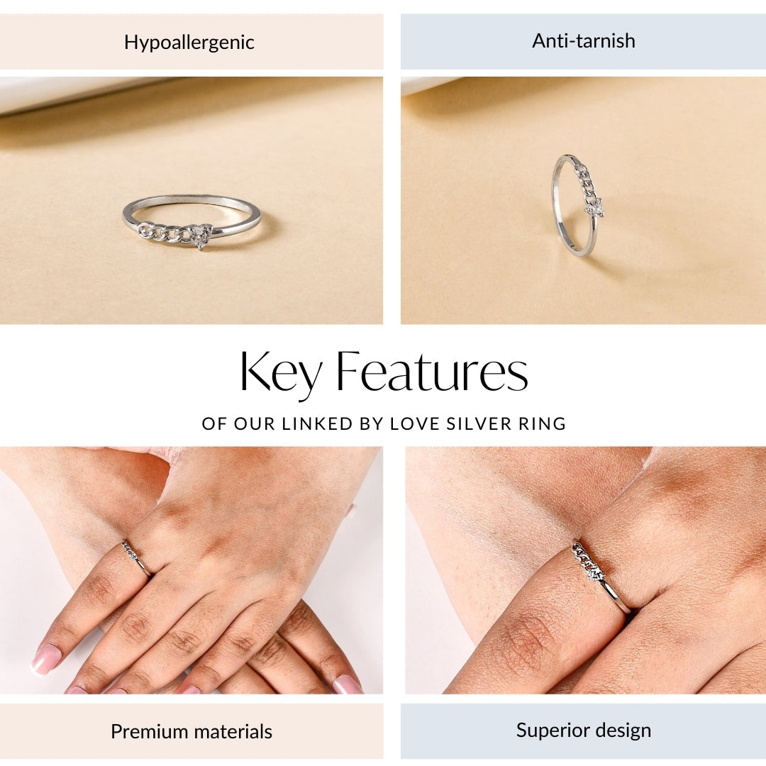 A little edge, a little romance—this silver-toned ring strikes the perfect balance. With a sleek, minimal band featuring a chain-like pattern, it adds just the right amount of texture. And right where the chain ends, a delicate stone heart takes center stage, held securely by a silver clasp. Simple yet full of character, this ring is made to be worn your way—stack it up or let it shine solo.