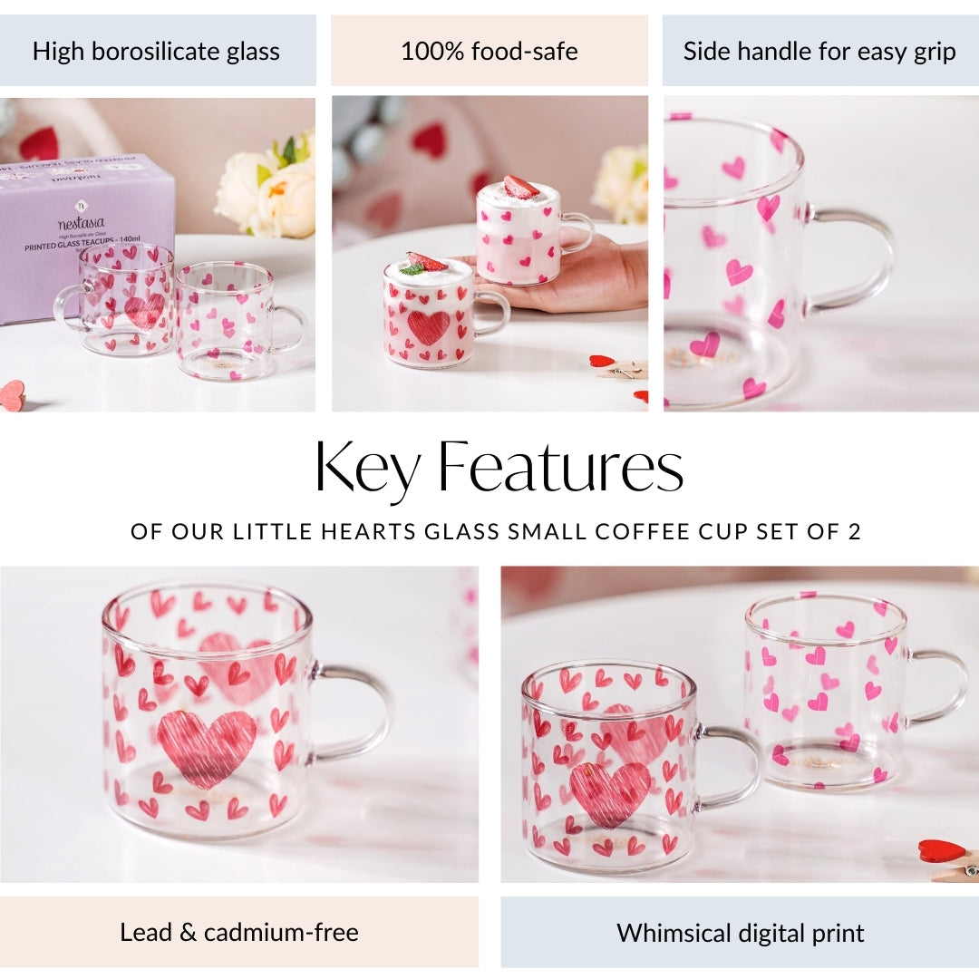 Design: Playful, bold, and artistic, this glass tea cup set is designed to brighten up your drinkware collection. Featuring two different designs, one that showcases delicate dark pink hearts while the other, adorned with vibrant, red hearts, each teacup brings its own flair and charm. Together, they make a perfect pairing for those who appreciate both subtlety and boldness in their drinkware.