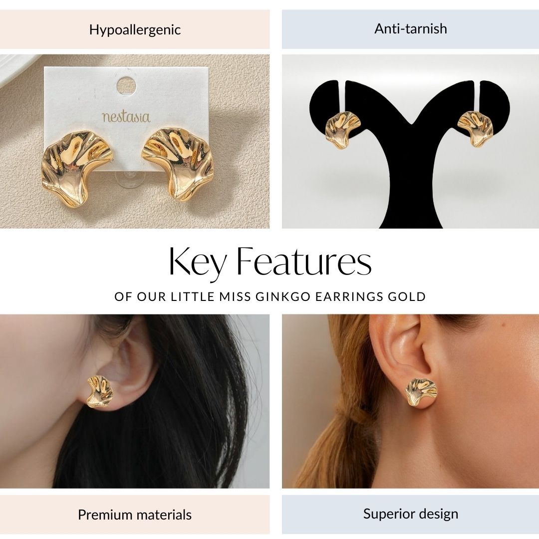 Nestyle: Pair the gold ginkgo leaf studs with a soft beige or cream blouse and a tailored white blazer.