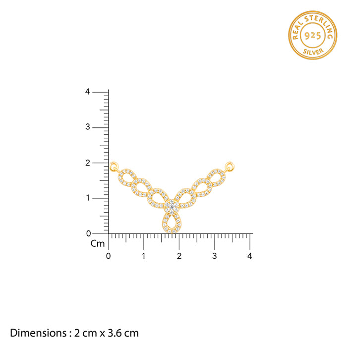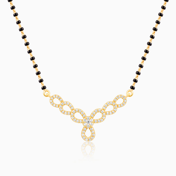 This golden mangalsutra features loop designs making up a V-shape studded with zircons.