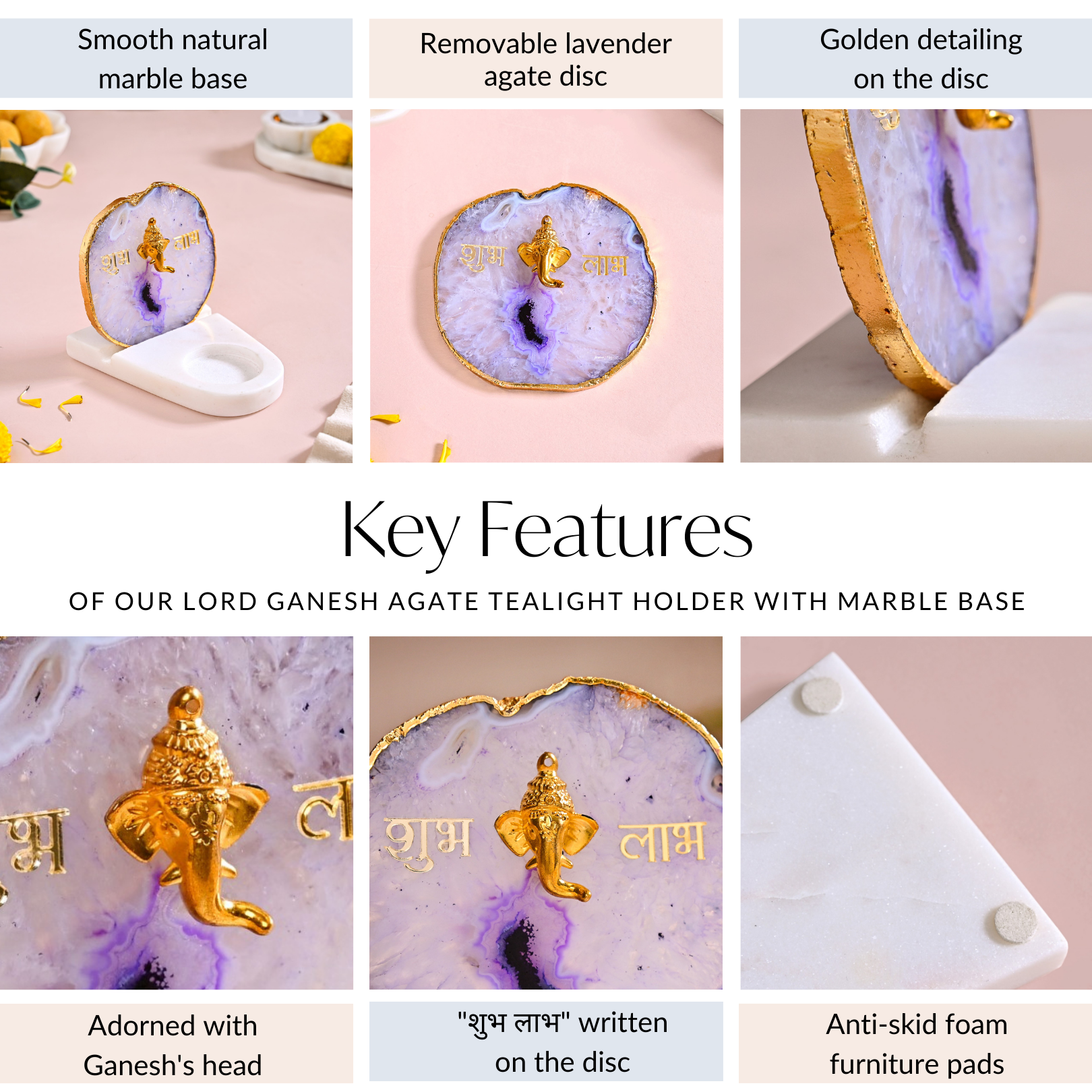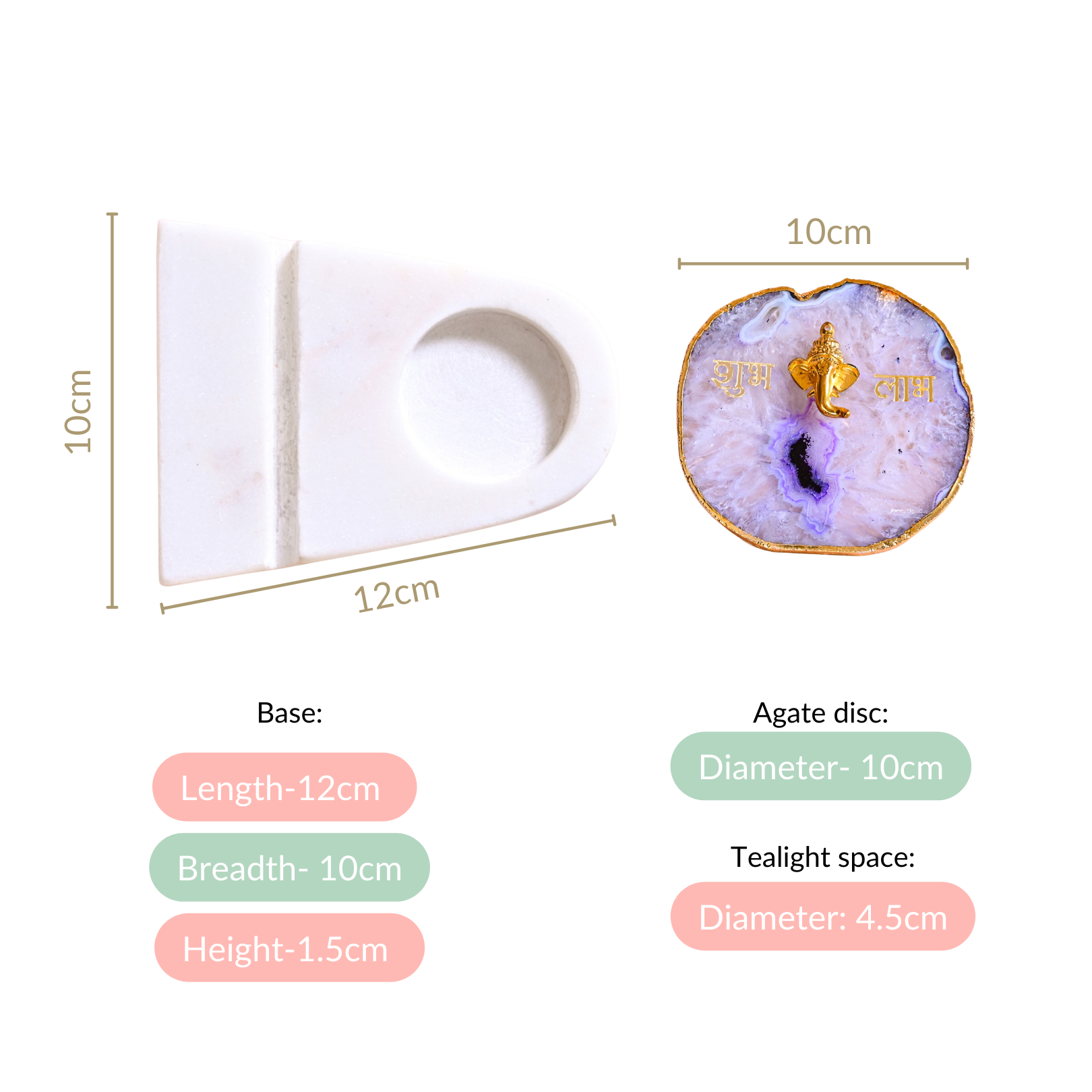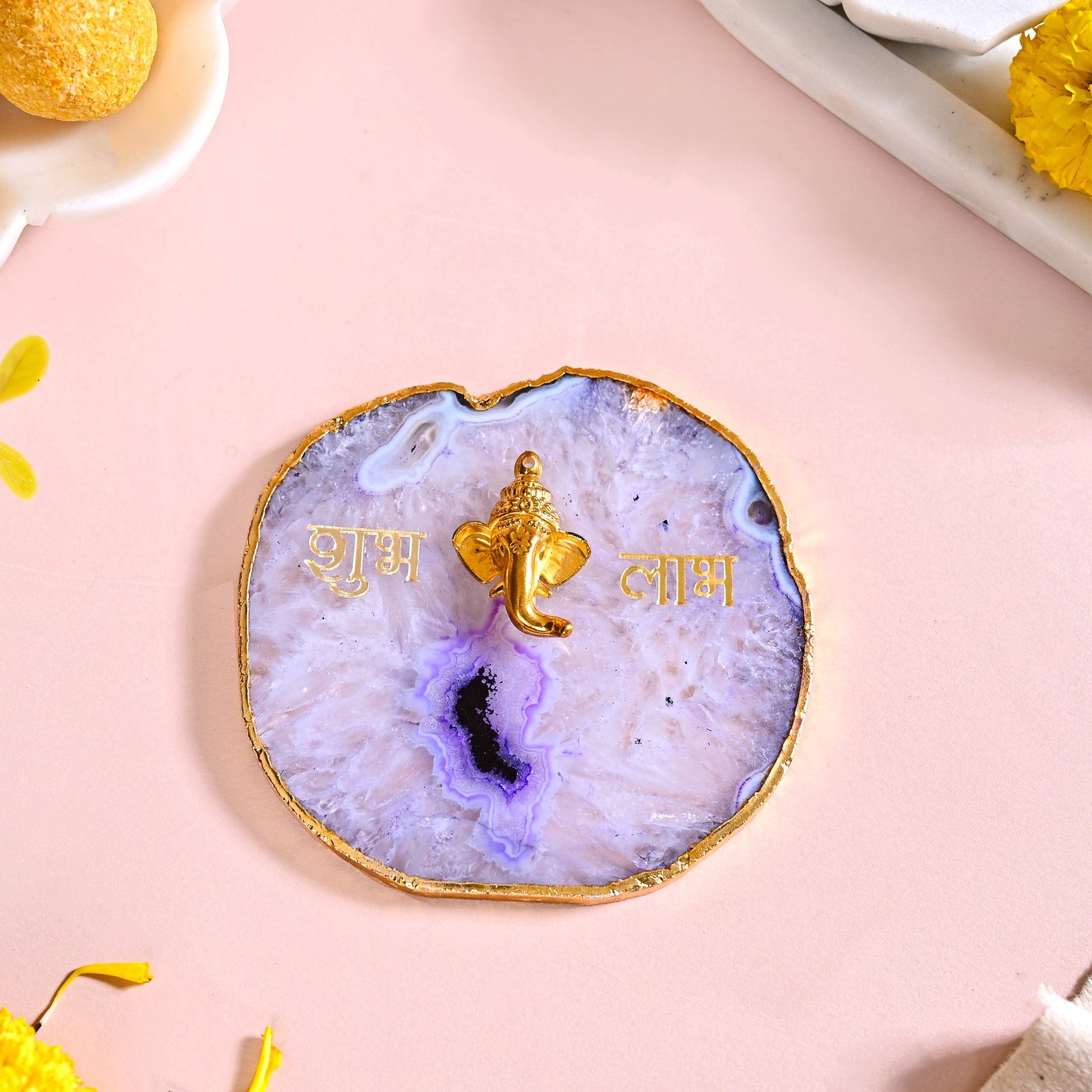 Design: The tealight holder features a smooth, natural marble base that radiates elegance. A removable lavender agate disc adorned with intricate golden detailing adds a regal touch. The disc showcases Lord Ganesh's head and the auspicious words "शुभ लाभ" in gold, symbolising prosperity and good fortune.