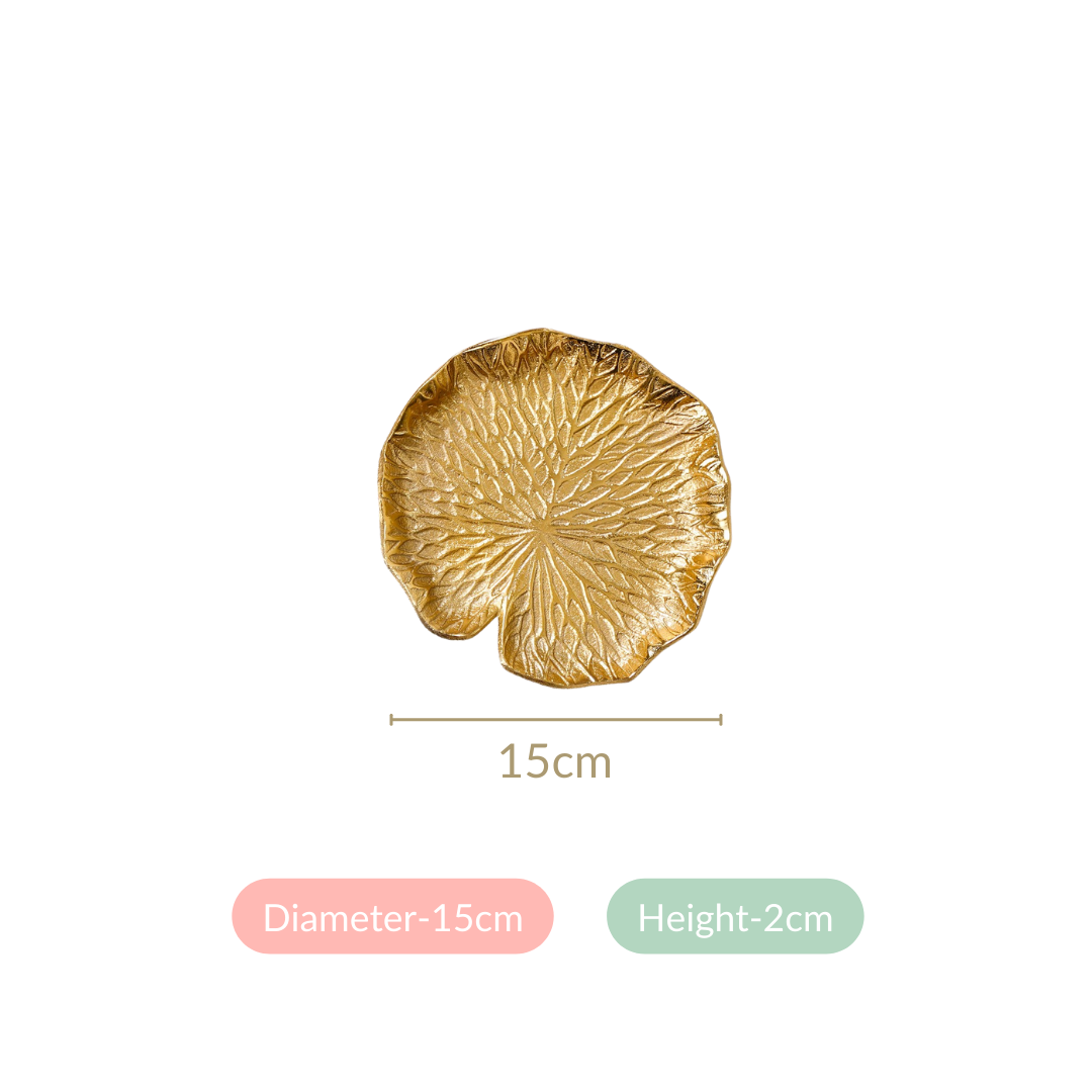 Step into opulence with our set of 2 metal trays. Crafted from rust-resistant aluminium, their high-sheen metallic gold hue adds a touch of luxury to any space. The exquisite lotus leaf shape design, coupled with intricate vein detailing, lends an elegant charm. Perfect for organising jewellery, spare changes, keys, or small trinkets, these decorative trays also come with foam furniture pads for surface protection. Whether adorning a dresser, coffee table, or entryway console, these trinket trays exude sophistication and functionality, making them a must-have addition to your home decor collection.