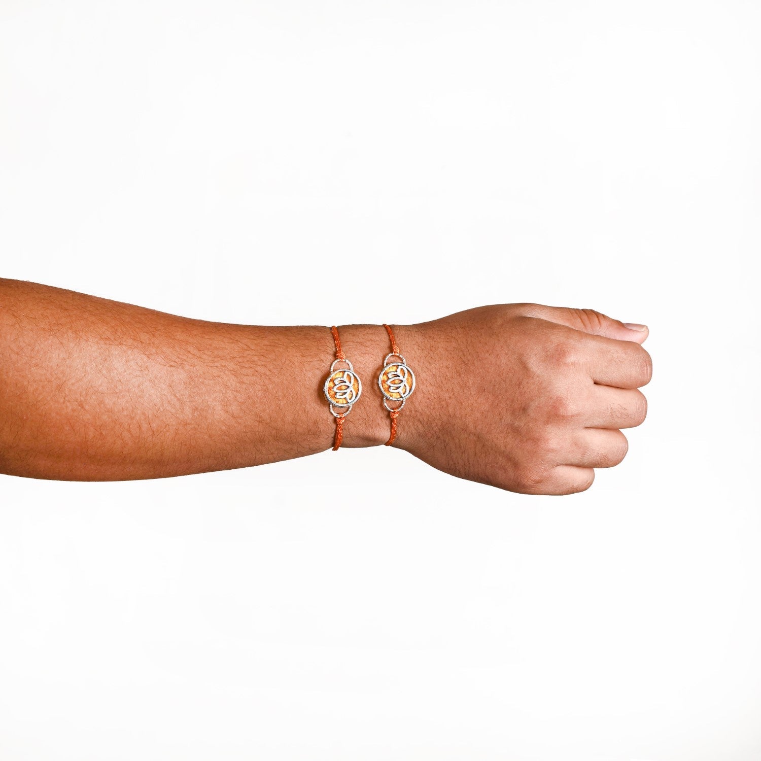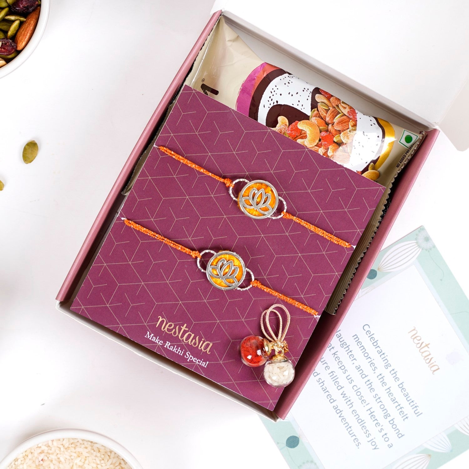 Bring some joy to your beloved brother or sister with our delightful bundle of Rakhi essentials. Inside the gift box awaits 2 Rakhi bands, 1 roli-chawal set, and 1 pack of flavour-packed and nutrient-dense dry fruits. The warm orange band coupled with the lotus flower charm against a cheery yellow backdrop takes the bands beyond mere Rakhi threads, transforming them into timeless accessories. The mini bottles of roli and chawal let you follow through with traditions, while the irresistible dry fruit blend ends the ceremony on a sweet note.