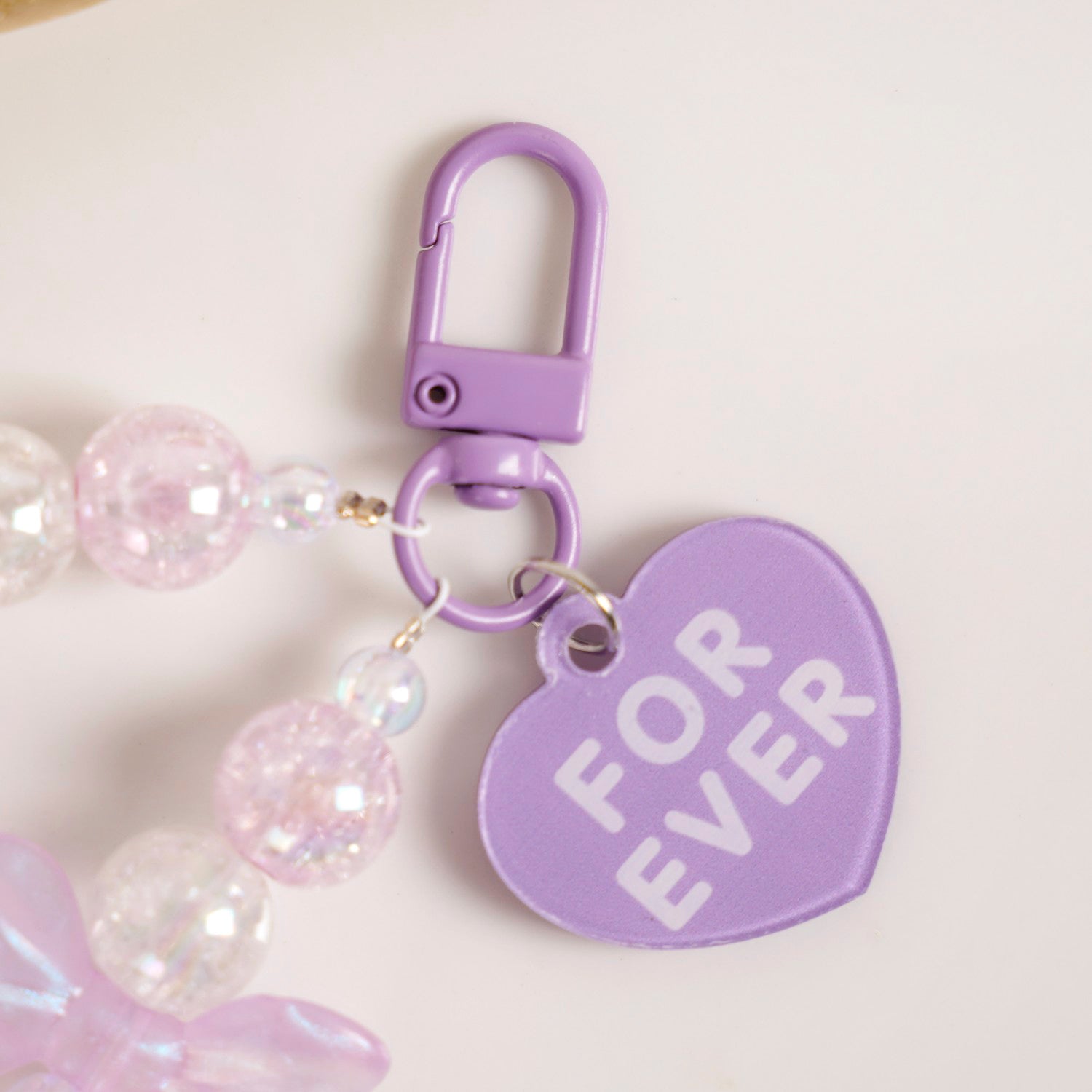 Carry a sprinkle of charm wherever you go with this dazzling keychain! Featuring a sparkling dangler with lavender and transparent beads, its iridescent shimmer catches the light like magic. A lavender heart charm with the message of "Forever" adds a sweet touch of sentiment to your style.