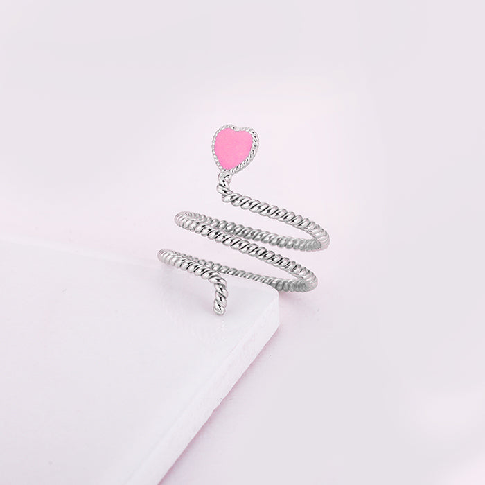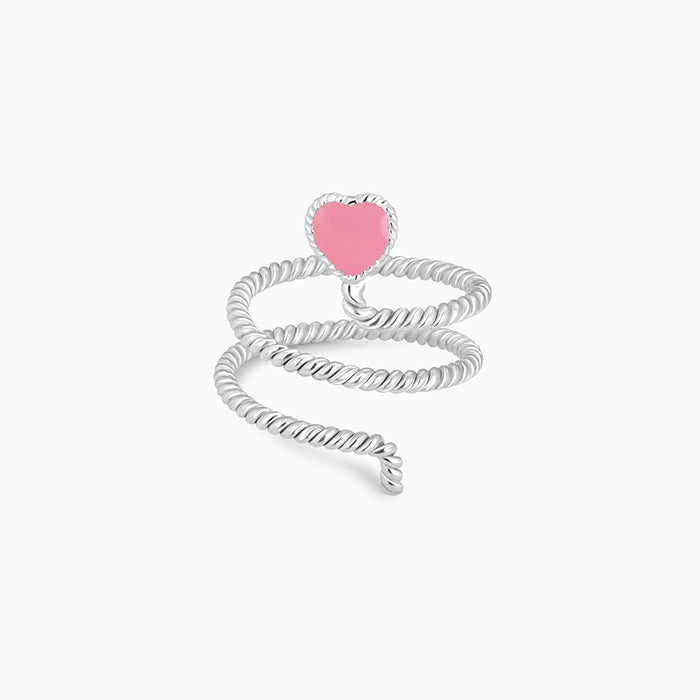 The silver ring features a pink heart on an open-ended spiral silver rim.