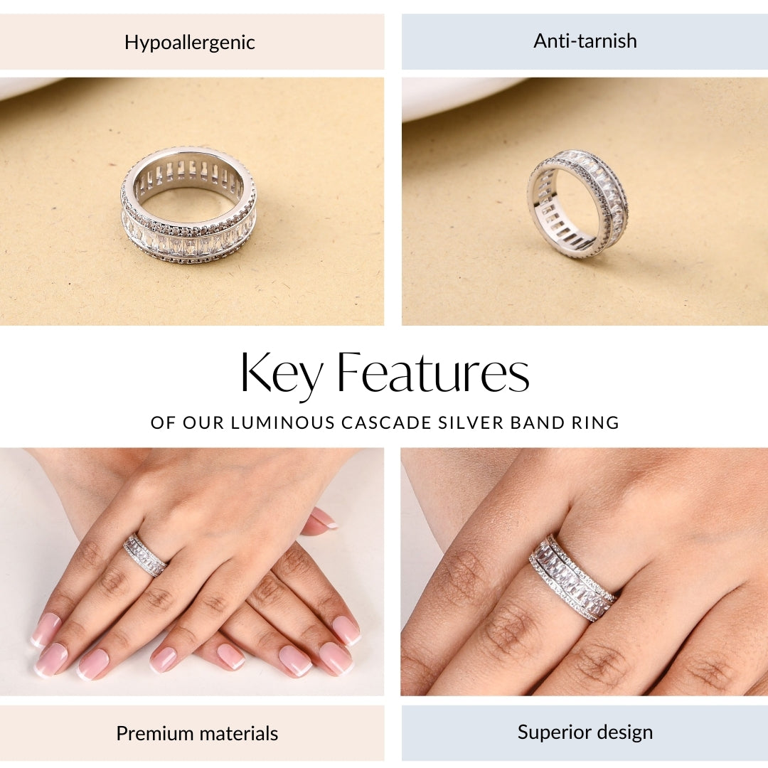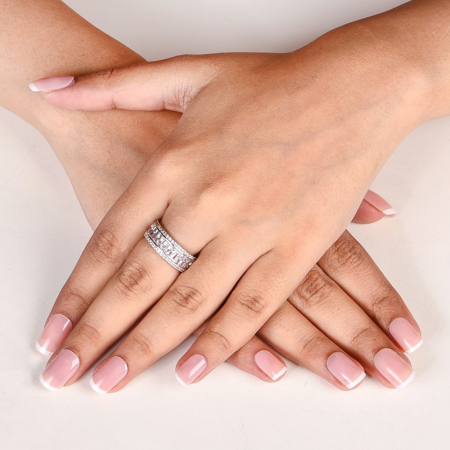 Featuring a round, uniform band, this silver-toned ring is adorned with a continuous series of elegant baguette-cut stones. Tiny round-cut stones delicately line the borders of the band, adding a touch of sparkle and sophistication. The design is inspired by timeless geometric patterns, combining sharp lines with delicate detailing for a refined and contemporary aesthetic. Perfect for those who appreciate subtle luxury, this ring makes an effortlessly stylish addition to any jewellery collection. Ideal for everyday wear or special occasions, it adds a refined, modern touch to your ensemble.