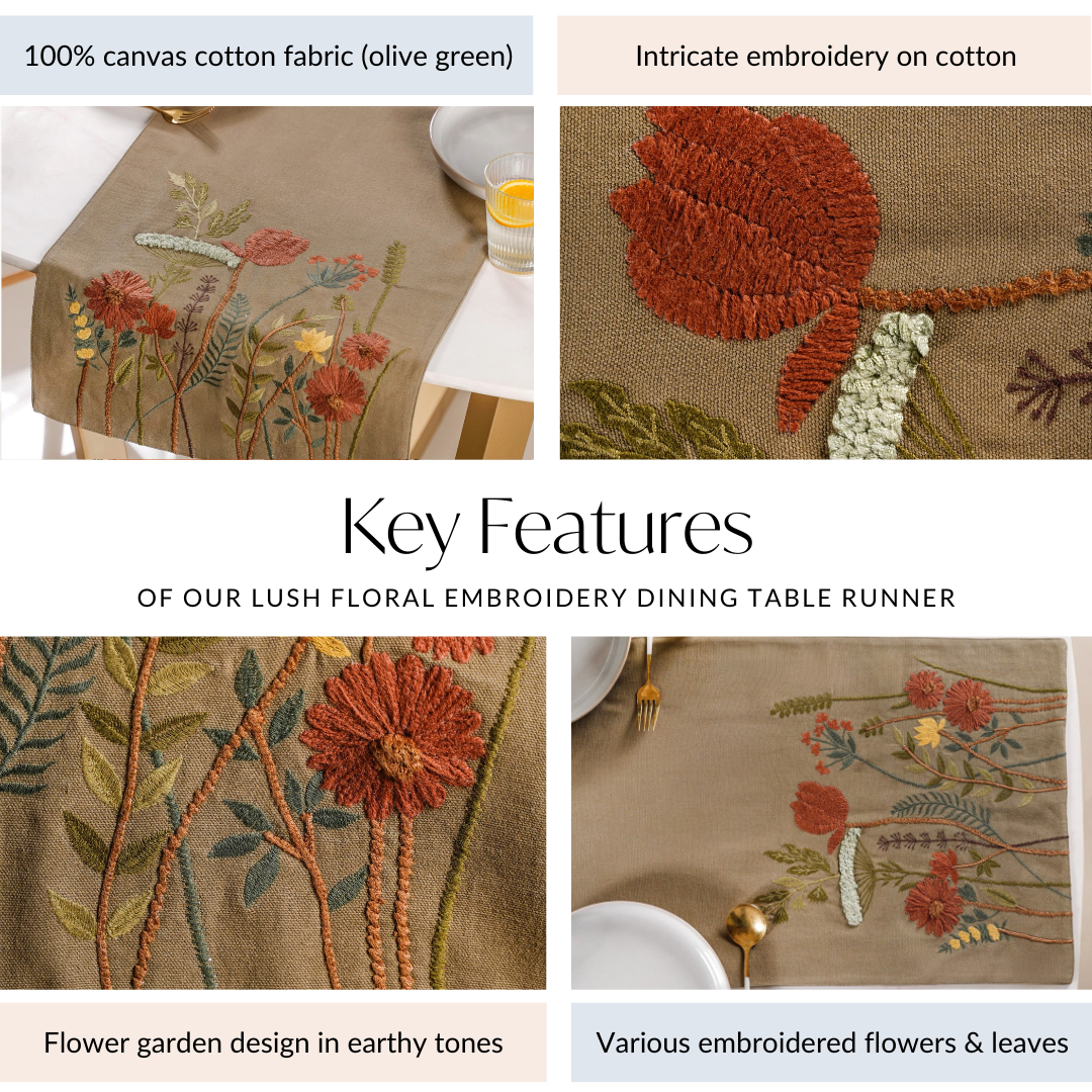 Bring nature's charm to your dining table with a table runner featuring intricate floral embroidery. Crafted from 100% canvas cotton fabric, it introduces an earthy, vibrant feel to your dining space.