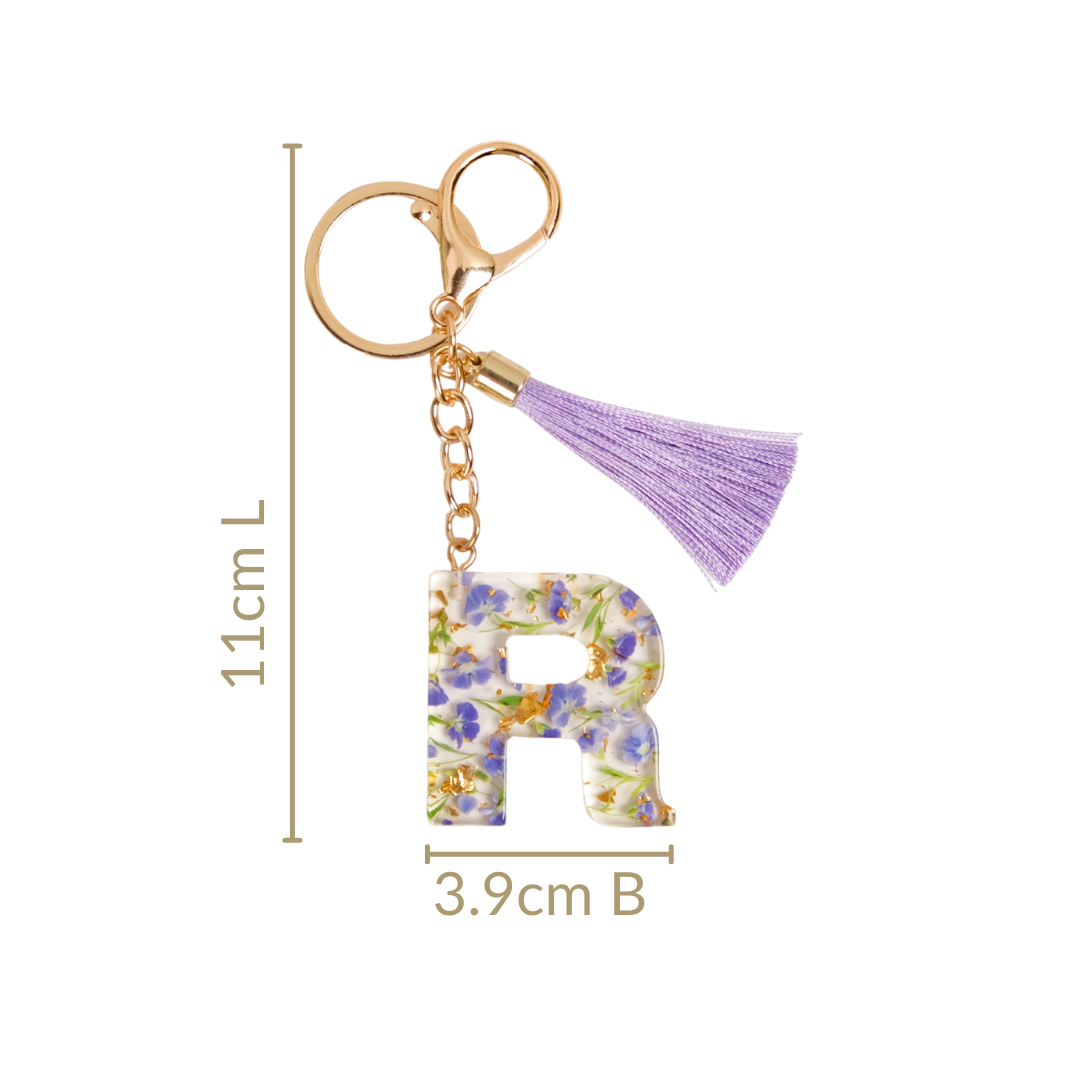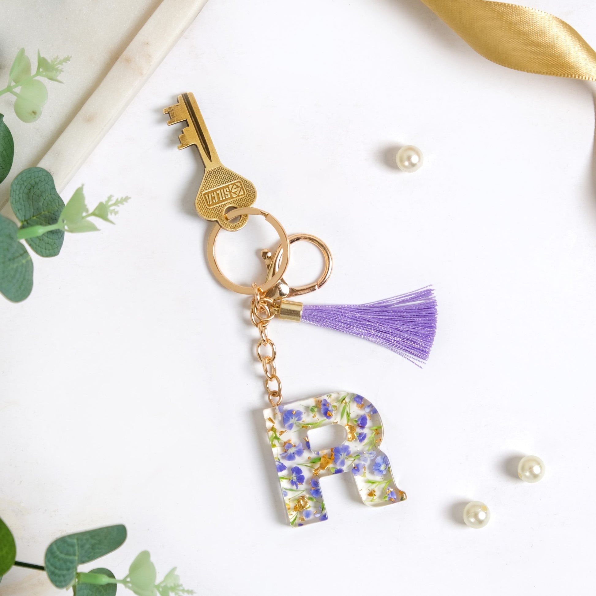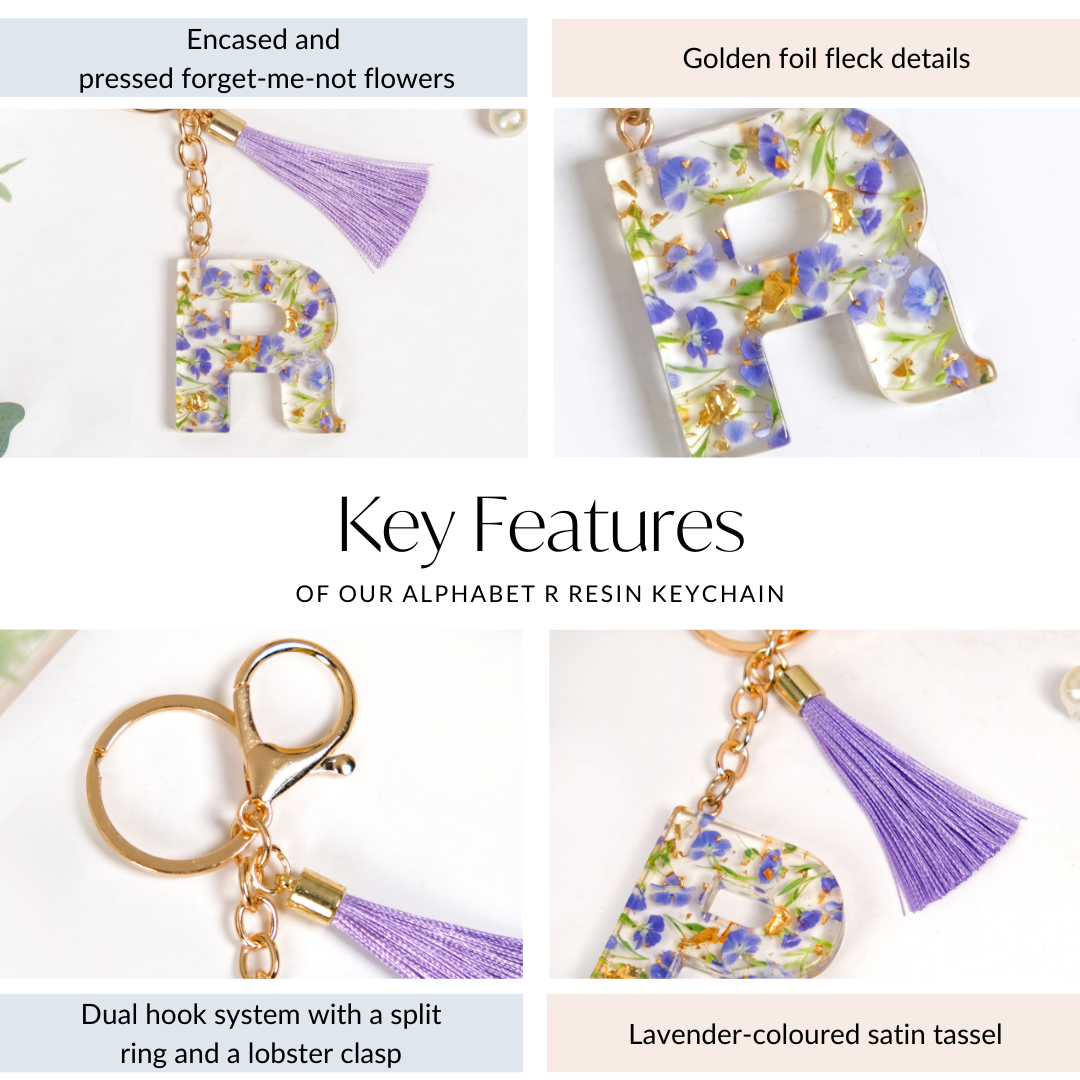 Get your hands on the stunning resin keyring in the shape of the alphabet "R". The keychain features pressed-in lavender forget-me-not flowers and flecks of golden foil paper encased in a transparent resin case.