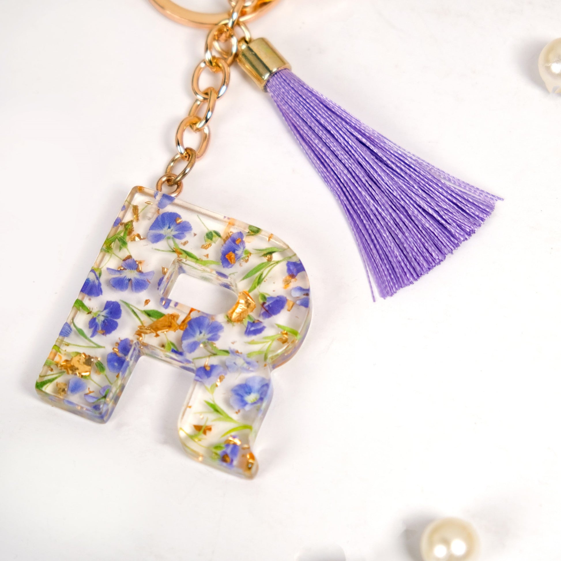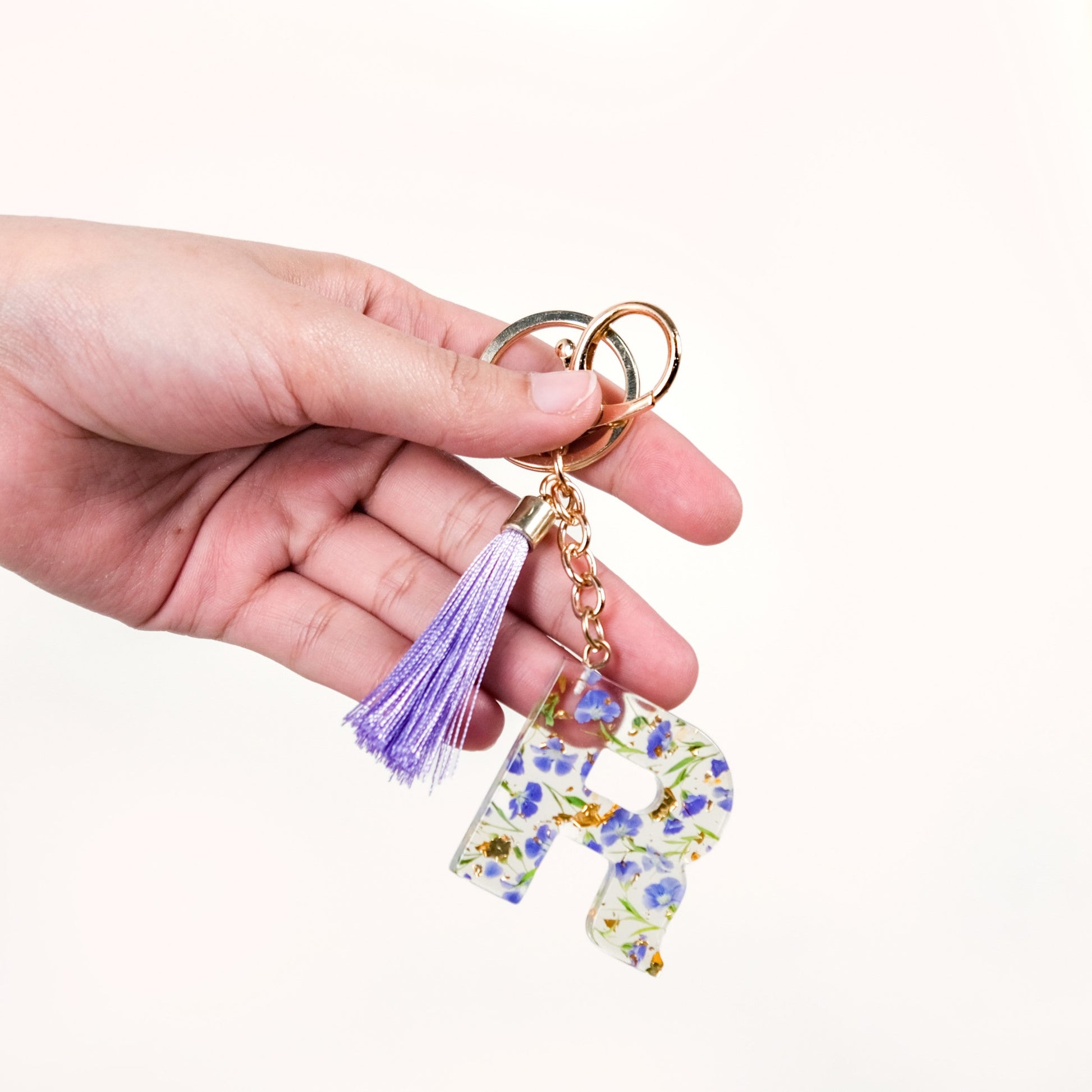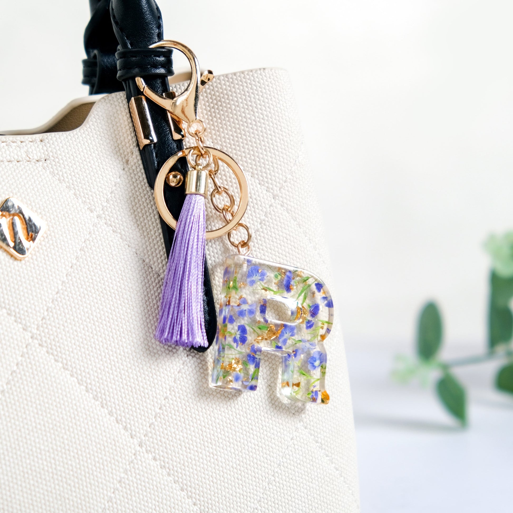 Get your hands on the stunning resin keyring in the shape of the alphabet "R". The keychain features pressed-in lavender forget-me-not flowers and flecks of golden foil paper encased in a transparent resin case.