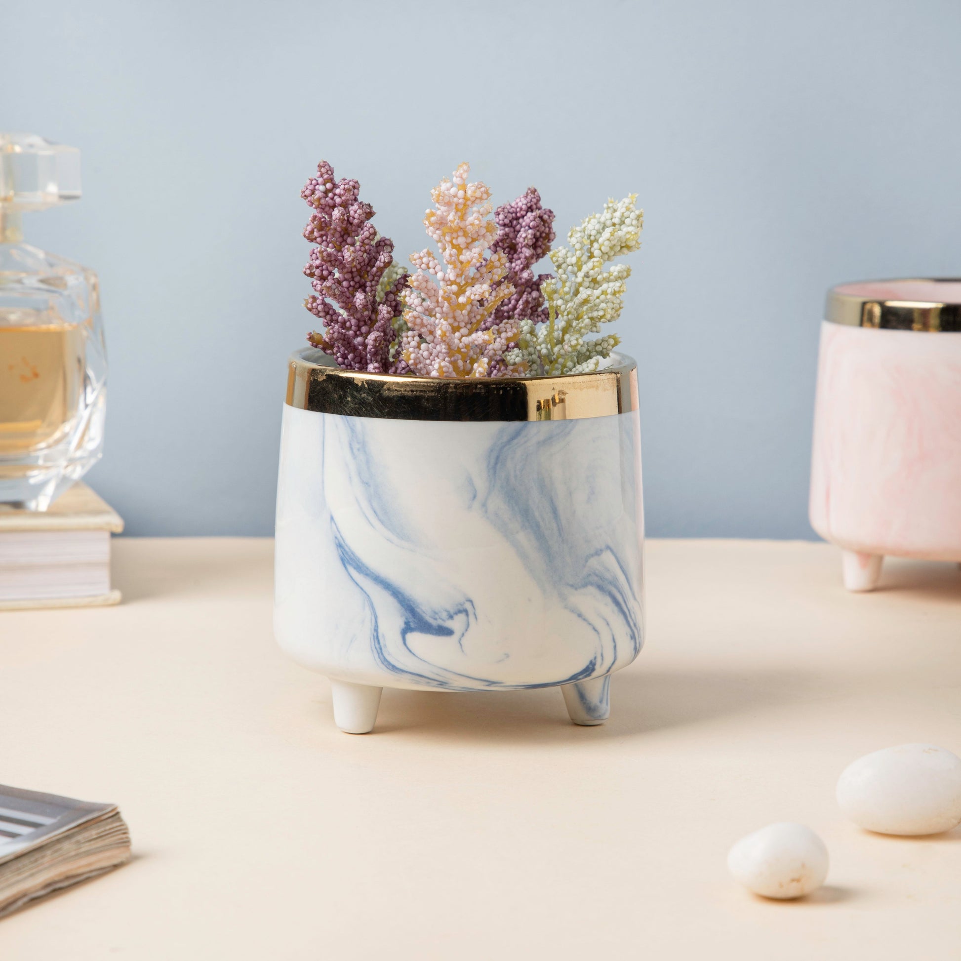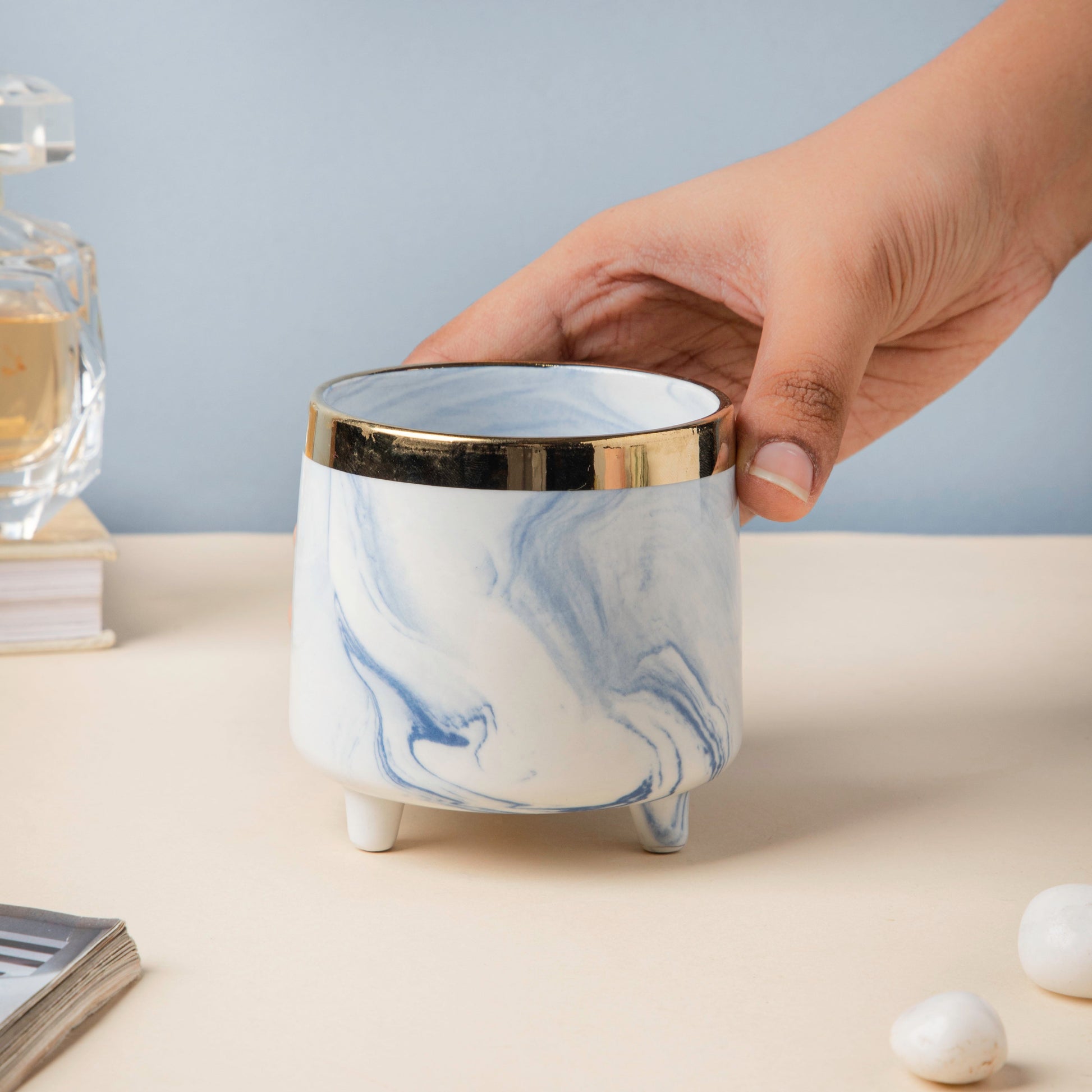 The white ceramic pot with blue abstract patterns has a minimalistic charm and is a lovely way to display natural greens. The charming planter with a raised base will look great on the work or study table and on the shelf. The pot's rim with the gold sheen gives a touch of glitz to the plants. The planter does not have a drainage hole, hence, it's advisable to not pour excess water in the soil while nurturing greens.