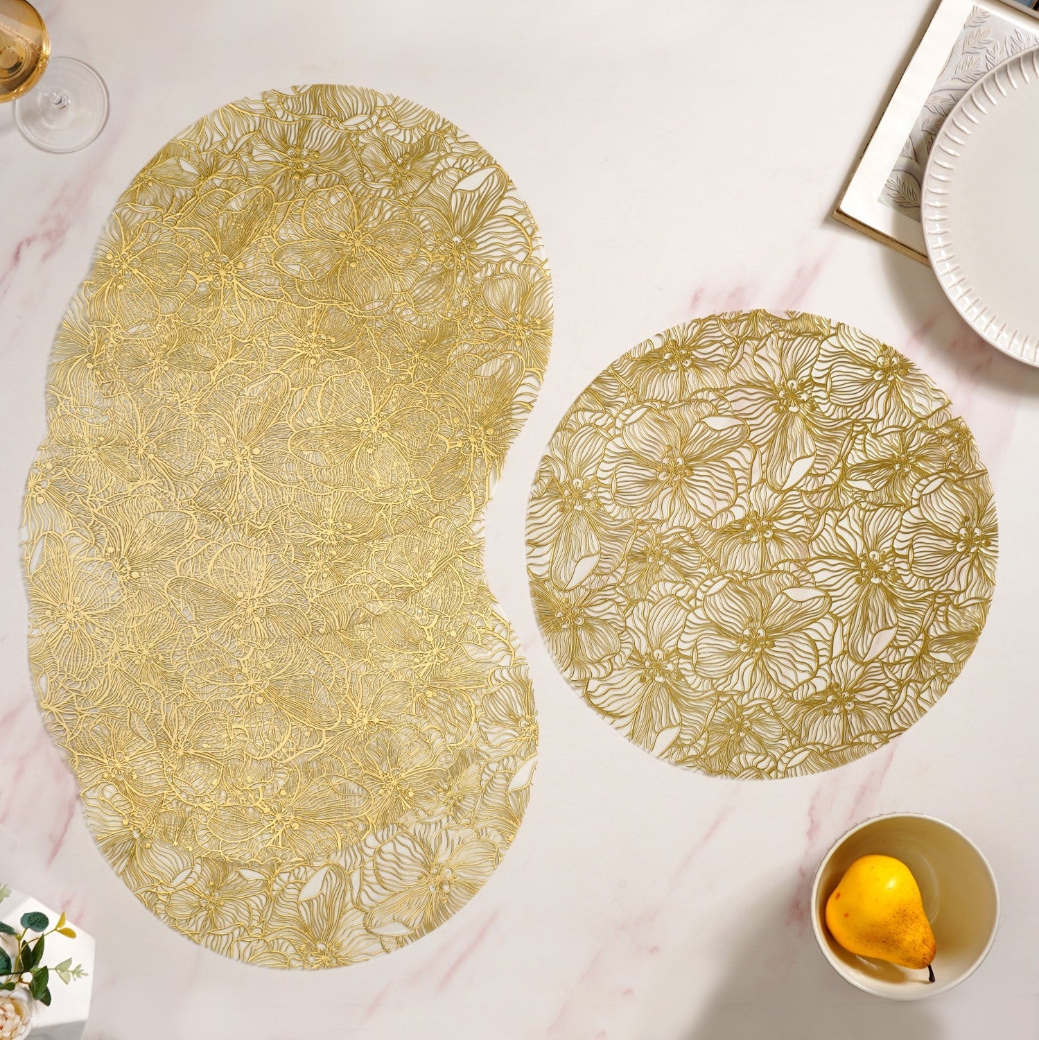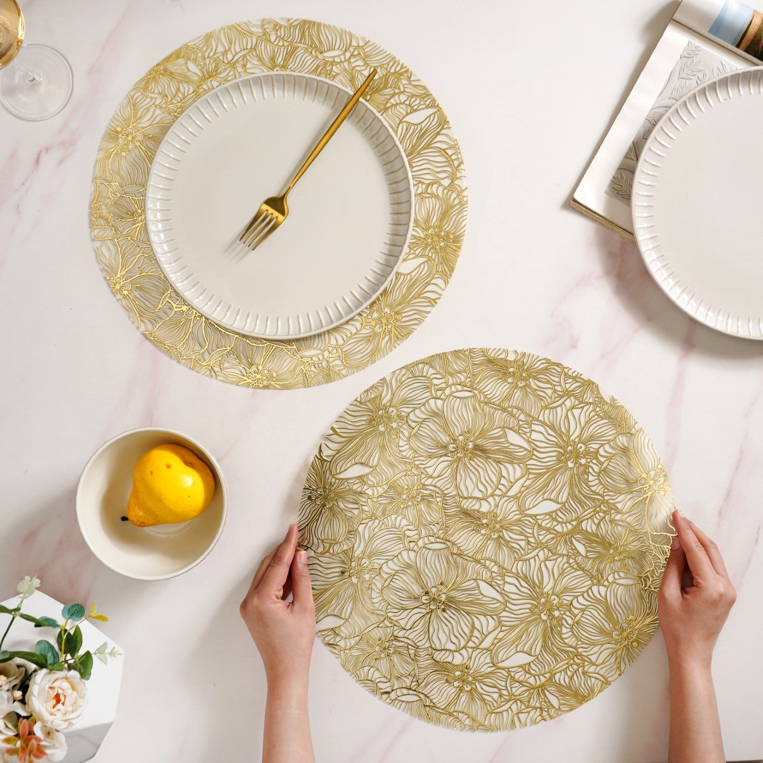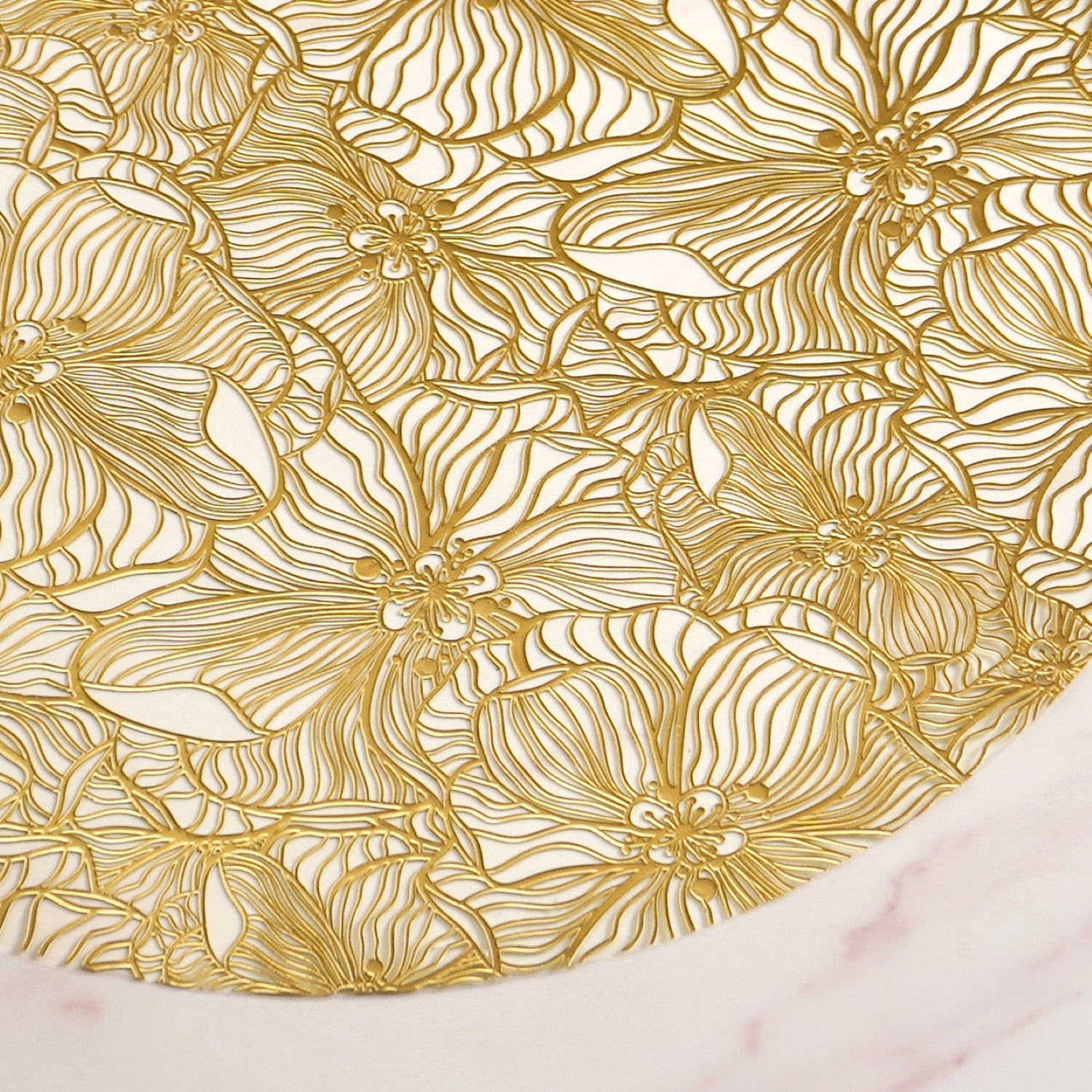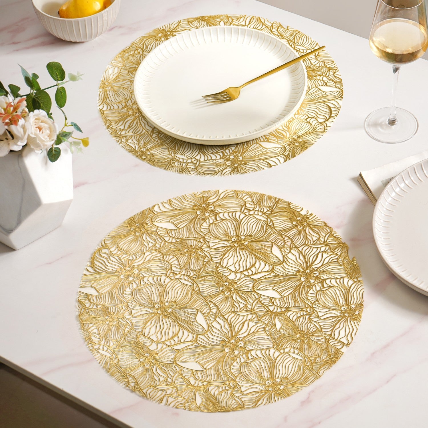 Design: These exquisite round table mats are designed to complement both everyday dining and festive decorations. The surface details an intricate floral etching in a shimmering golden hue, lending a regal finish. The floral motifs are thoughtfully spread across the mat, adding a graceful sense of depth and musical flow. The luminous gold against the translucent backdrop ensures these mats pop on any surface. Its see-through base helps your tablecloth peek, adding to the visual charm.