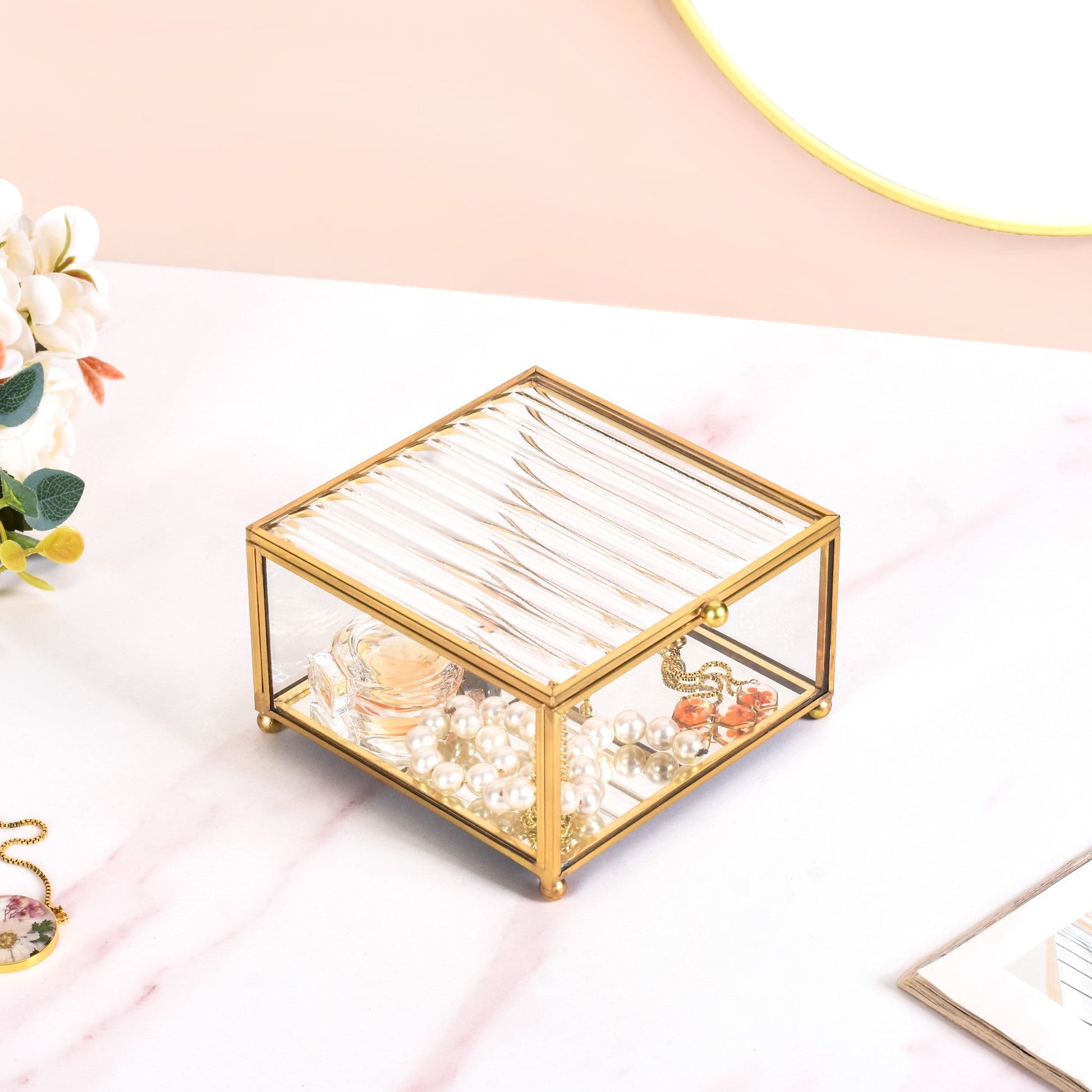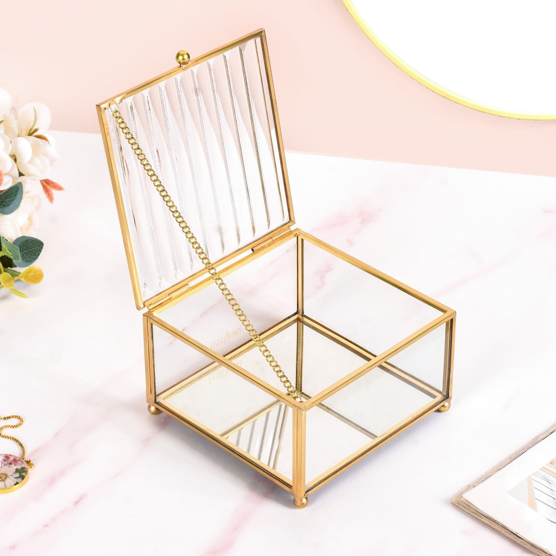 Design: The square-shaped jewellery case features a transparent tempered glass body with golden metal borders that are framed by hand. Bearing a fluted top-down lid for an artistic flair and an anti-glare mirrored base, the vanity box is a must-have for all the divas out there! The opulent gold link-chain lid hinge supports the lid when opened, while the anti-skid base and raised legs provide extra structural support.