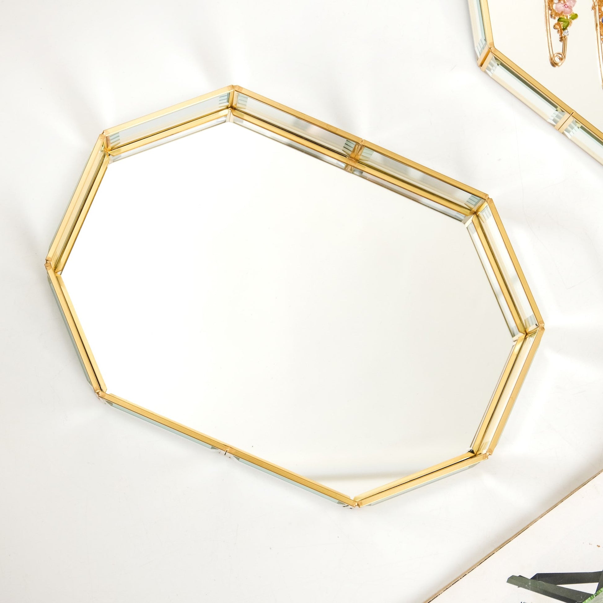 Design: Constructed from high-quality tempered glass with gold-tinted rust-resistant metal borders that are skillfully set by hand, this octagon-shaped decorative tray is a sight for sore eyes. Adorned with expertly cut bevelled glass on all sides and furnished with an anti-glare mirrored base for a crystal-clear reflection, the trinket tray effortlessly combines form and function. Complete with a protective anti-skid foam padding at the base, this vanity tray is perfect for adding a glam look to your dress-up routine.