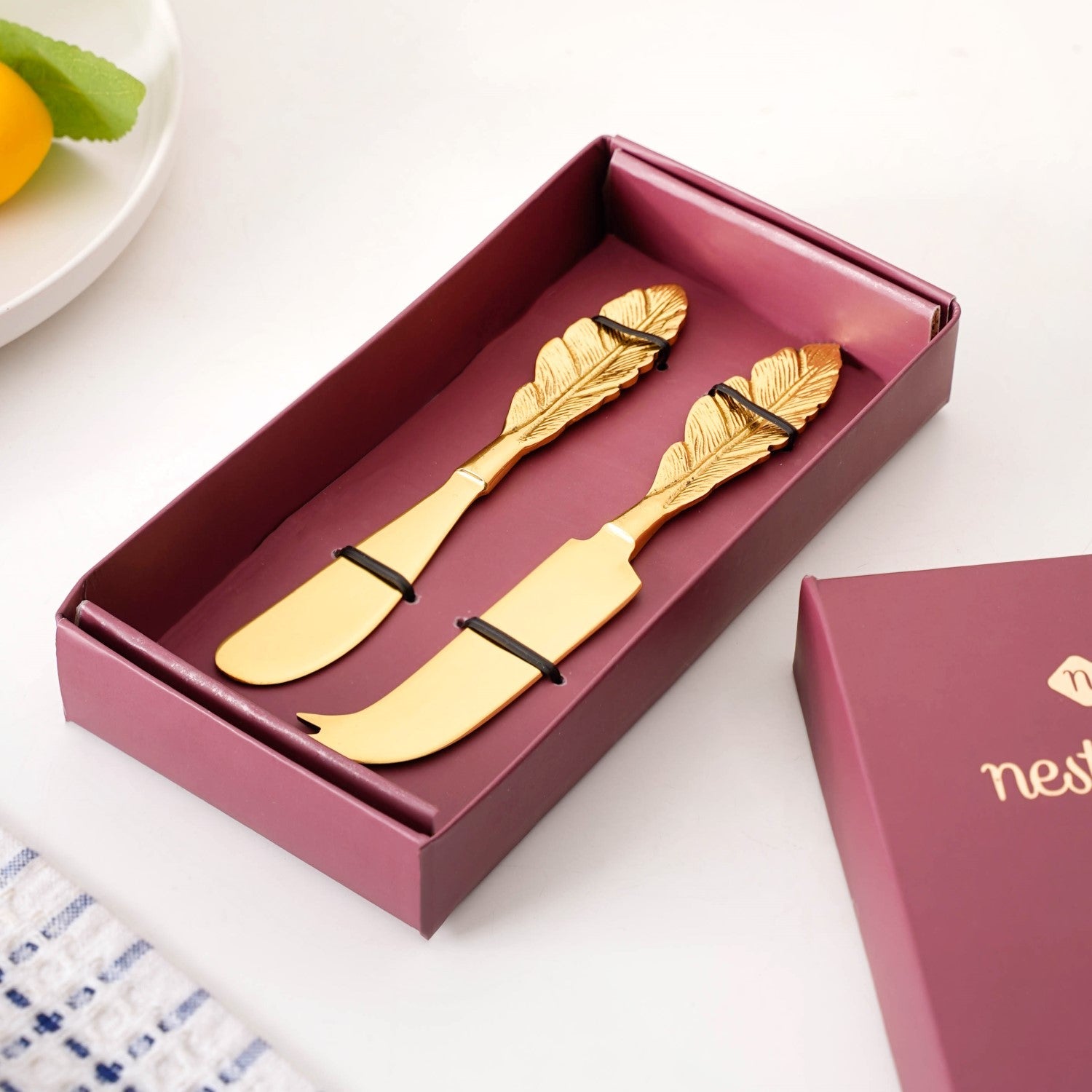 Transform your dining moments with this exquisite cutlery set of 1 butter knife and 1 pronged cheese knife. Fashioned from 304-grade stainless steel, these utensils guarantee durability and a sleek look. Non-toxic and BPA-free, they adhere to international food-grade standards, ensuring safe and healthy use. The PVD-coated metallic gold finish adds a touch of luxury to your table setting. Featuring a unique leaf-shaped handle design, this set combines elegance and functionality, making it perfect for any occasion. Ideal for spreading butter and slicing cheese, this metal cutlery knife set is a must-have for discerning hosts and food enthusiasts alike. The products come neatly packed in a gift box.