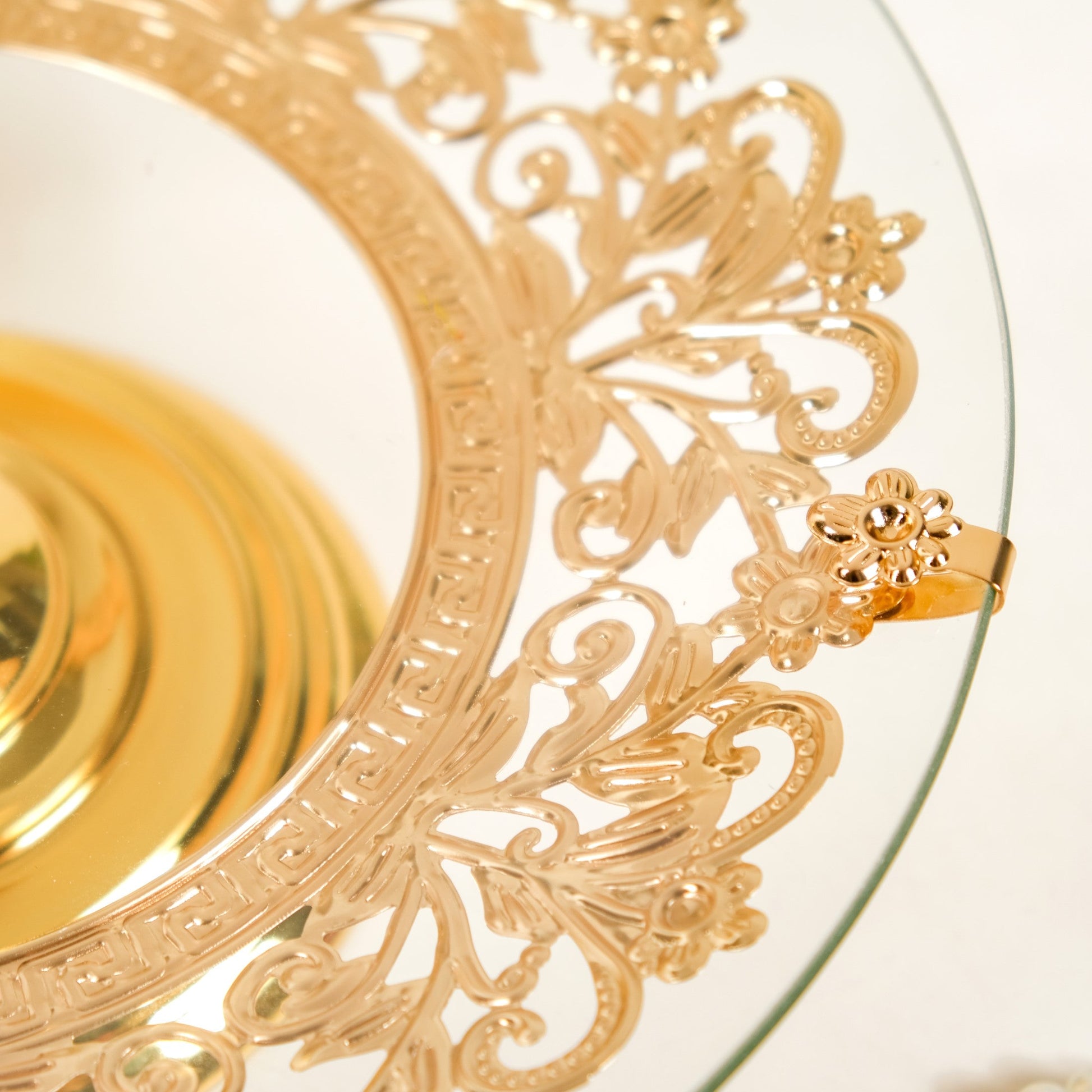 Design: This decorative tray is crafted with a clear round glass surface, making it versatile for displaying and serving. The tray is adorned with intricate gold-toned detailing in an ornate floral pattern that highlights its artistic appeal. Its raised pedestal base not only provides height and stability but also enhances the overall presence of the tray on any tabletop. The smooth glass finish reflects light beautifully, while the metallic detailing adds a rich texture that contrasts elegantly with the transparency of the glass. With a wide serving area, sturdy weighted structure, and compact yet statement-making design, the tray merges functionality with ornamental style.