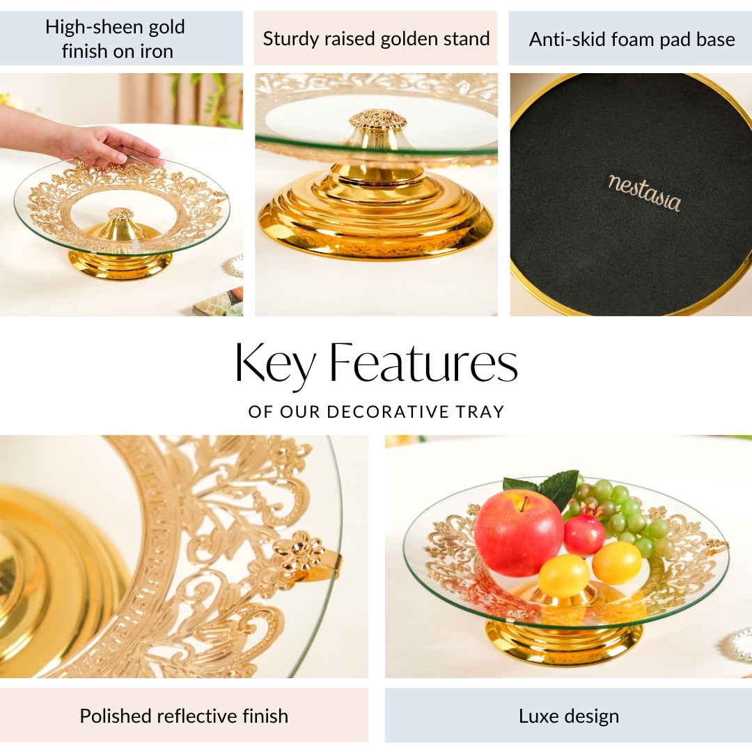 Benefits: The durable blend of glass and metal ensures long-lasting use, making it perfect for daily or occasional hosting. The raised round shape keeps desserts and food stable while adding a layered height to your table presentation. Its decorative gold finish makes it ideal for festive gatherings, gifting, or everyday use, while the easy-to-clean surface keeps maintenance simple. This tray brings both practicality and style, making it a versatile centrepiece for every home.