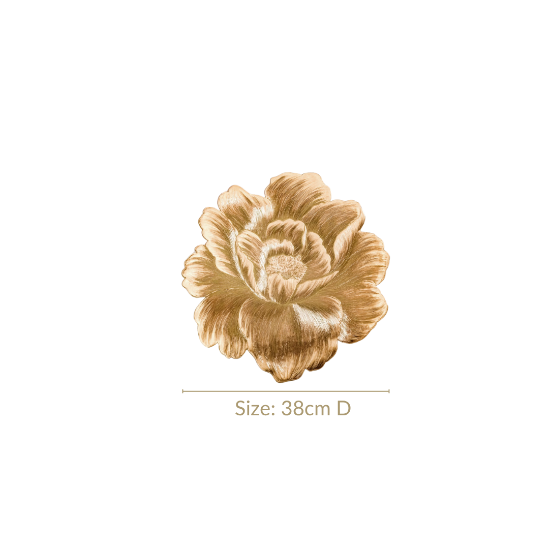 Design: The design features an oversized, sculpted bloom in rich metallic gold. Intricate embossing and textured strokes mimic real petal folds, creating a 3D-like visual impact. The petal edges are gracefully curved, giving the mat an organic, artistic silhouette that instantly catches the eye. Its textured finish adds depth and dimension, while the gleaming surface brings a radiant charm to any tablescape. A décor must-have that’s equal parts ornamental and functional.