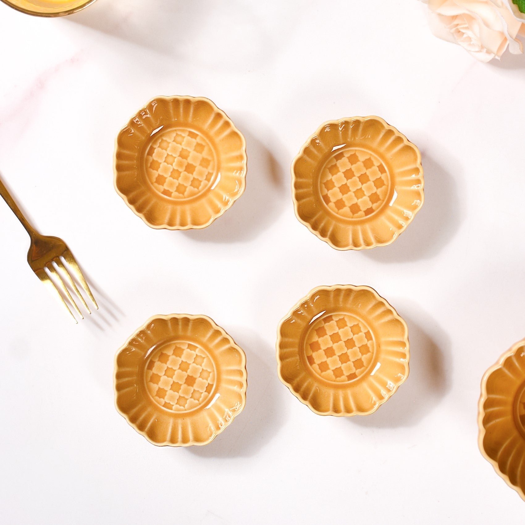 Who knew that serving dips could be so exciting? Introducing our new ceramic dip bowls, designed to adorn your table and gatherings with vibrant elegance and functionality. Crafted from premium-quality ceramic, these condiment bowls are extremely durable and stain-resistant, thus ensuring they maintain their pristine condition. Furthermore, these dip bowls are not only dishwasher and microwave-safe, making it easy to clean and reheat all your favourite condiments, but they are also non-toxic and BPA-free, meeting the highest international food-grade standards. The pièce de résistance of this set of 4 dip bowls is the chic and intricate Moroccan motif pattern and unique scallop rim paired with a vibrant, rich yellow ochre hue that adds an exotic flair to your table and instantly brightens up the ambience. These truly are a must-have Set of 4 dip bowls to include in your dinnerware collection.