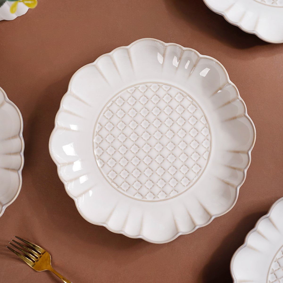 If you've been looking for a simple yet spectacularly elegant dinner plate to completely elevate your dining setup, then look no further! Say hello to our white-as-snow Moroccan dinner plate set, the ultimate combination of all things classy, stylish, and functional. Made from high-quality ceramic, these dinner plates are something you don't want to miss out on. Dishwasher and microwave-safe, these entree plates ensure that cleaning up after your dinner parties and reheating all your delicious meals feel like a breeze. Furthermore, because they are chip, stain, and odour-resistant, you can rest assured that these dinner plates can withstand the rigours of daily use and maintain their pristine condition. But wait, it gets better. These plates feature an intricate Moroccan-inspired motif on their surface as well as whimsy scallop rims, adding an exotic flair to the dining set-up, taking it from drab to completely fab. Add this to your cart and enjoy all your delicious meals on these beauties!