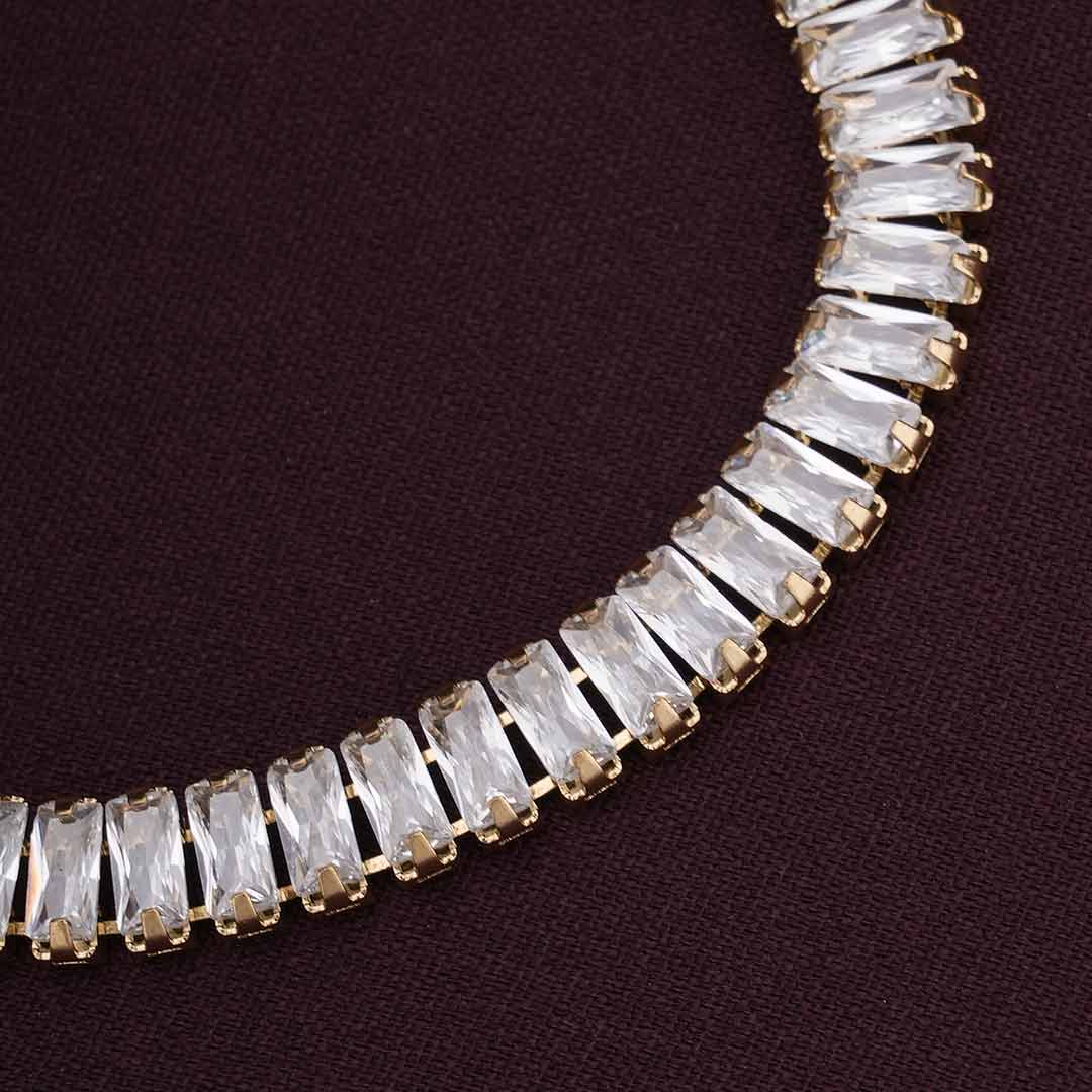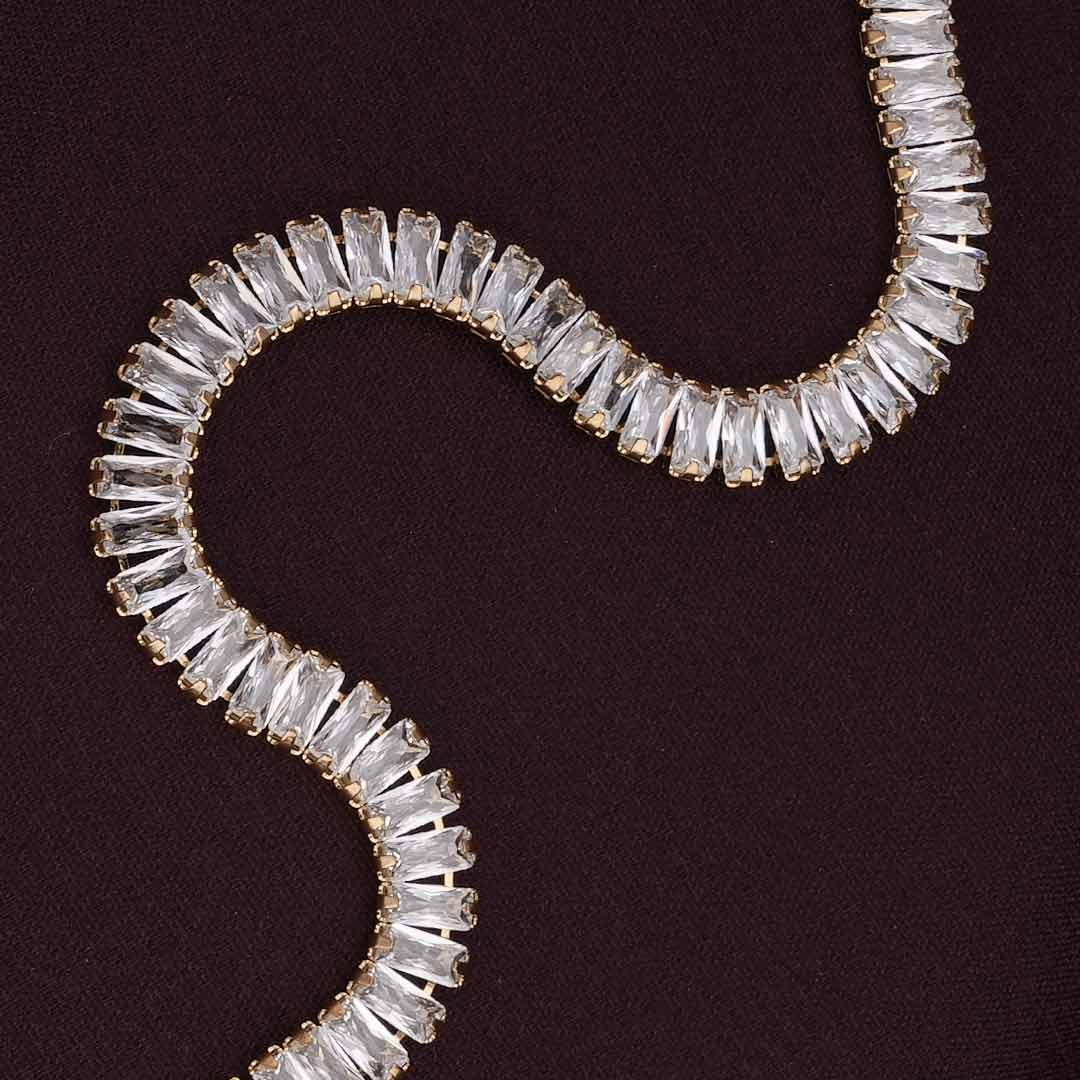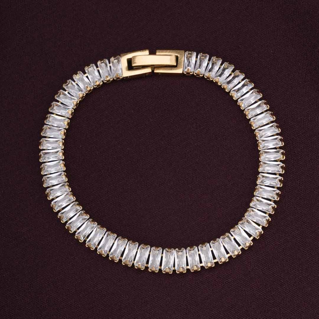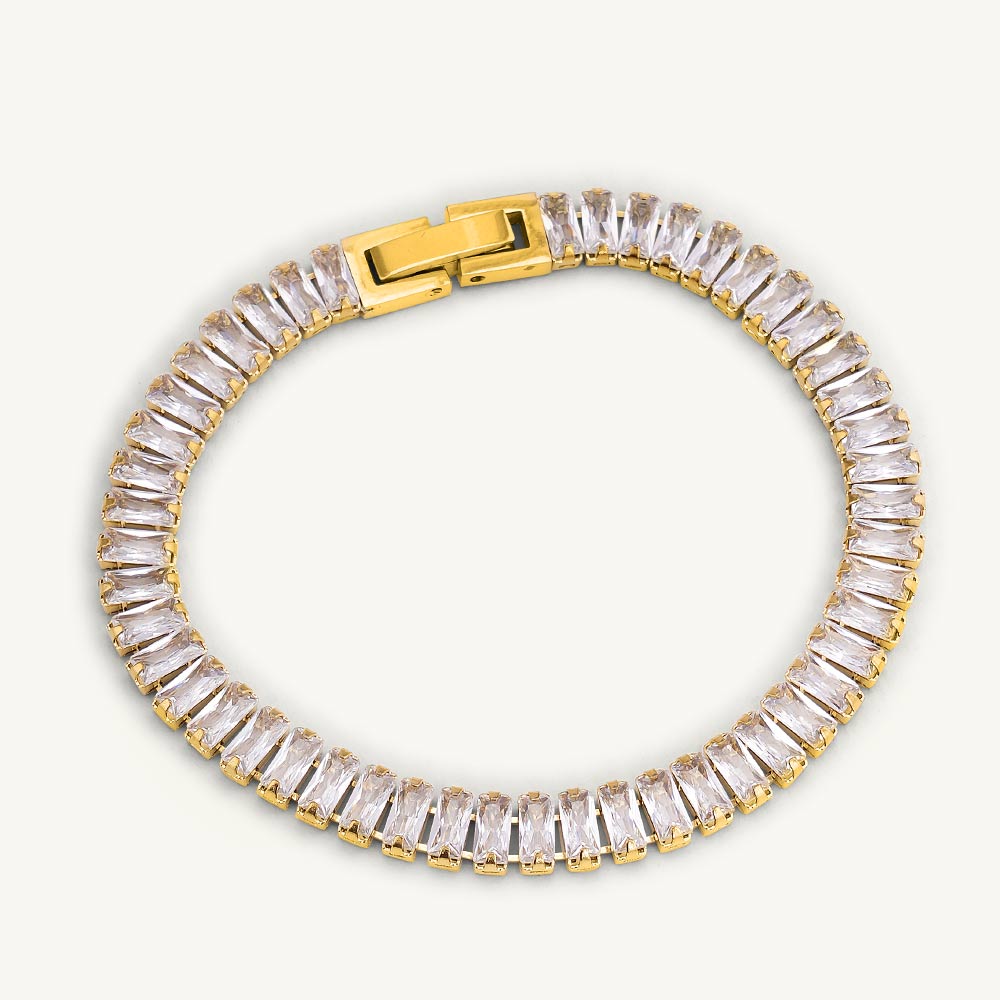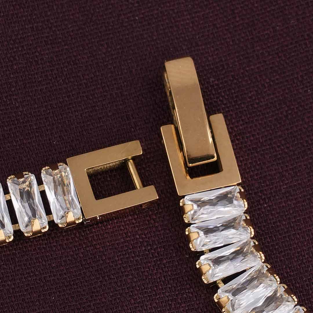 This Luxury Queen Baguette Gold Bracelet for women dazzles with a beautifully structured line of baguette-cut cubic zirconia stones, bringing refined sparkle to every occasion. Featuring a secure buckle closure and a lightweight feel, its elegant appeal seamlessly enhances both day and night outfits.