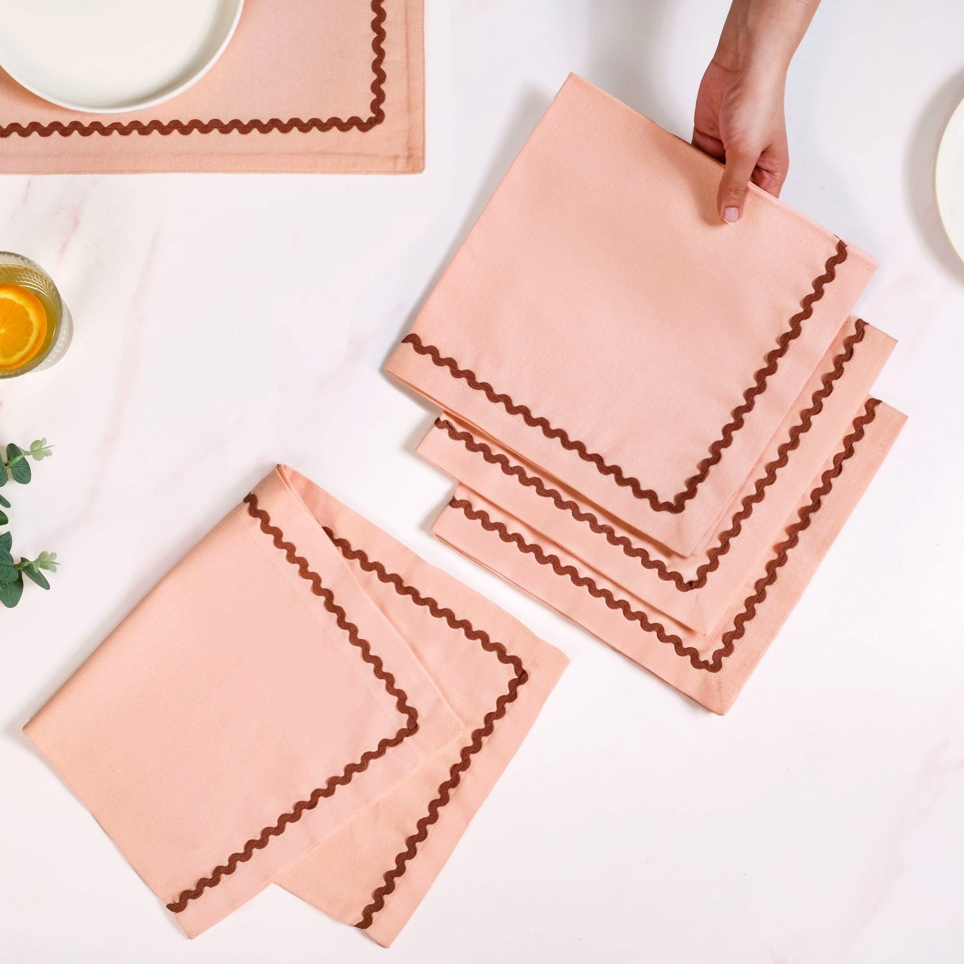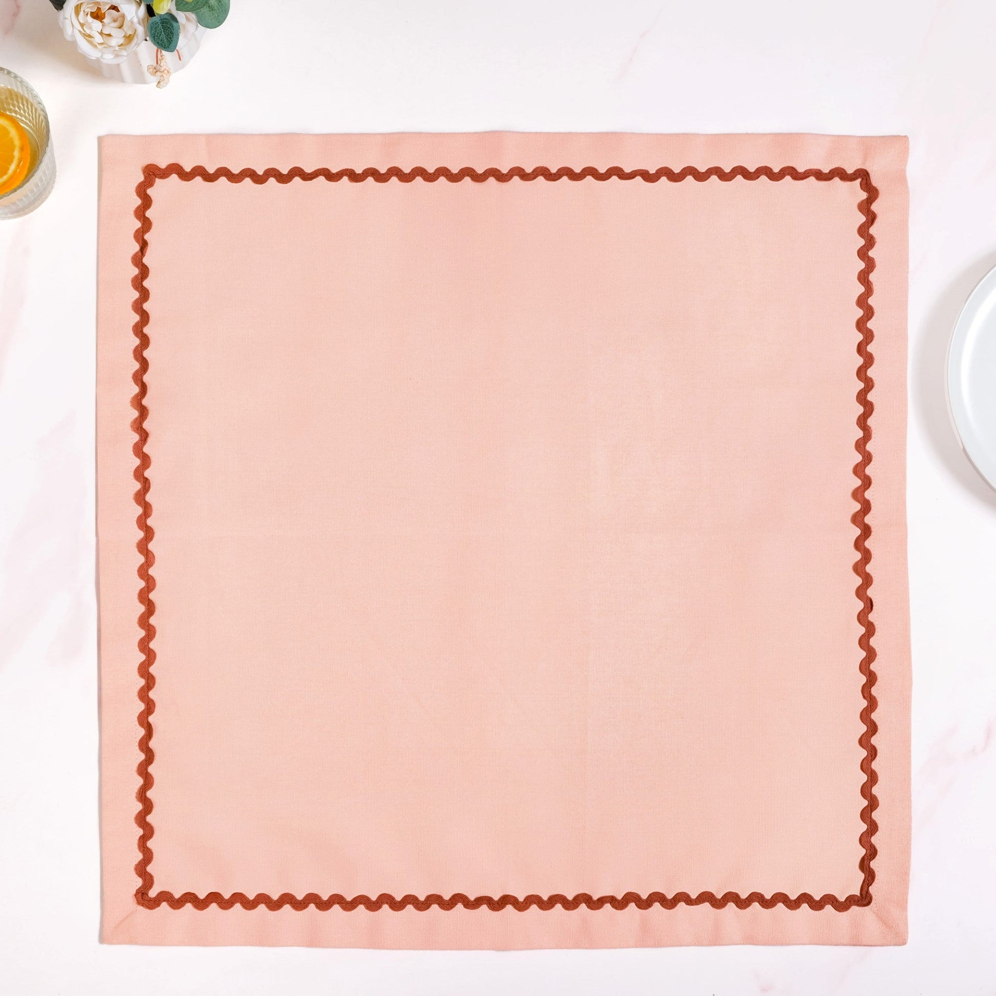 Design: Imagine these lovely napkins enhancing your table! This set of 4 napkins features a gentle peach colour, beautifully framed with a subtle maroon wavy stitching around the edges. This simple yet elegant design adds a touch of quiet charm to your place setting, perfectly matching a refined aesthetic. The delicate wavy pattern adds a unique and playful detail that truly stands out. This thoughtful design ensures your table looks inviting and beautifully dressed for any occasion.