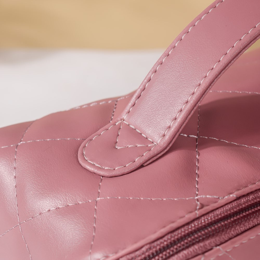This pink-coloured makeup pouch is a stylish and practical accessory for any makeup enthusiast. Made of high-quality vegan leather, it is both cruelty-free and durable. The quilted surface adds a touch of elegance to the design, while the wide-opening diagonal zipper enclosure provides easy access to the spacious interior. The makeup pouch also features 3 interior pockets, and a convenient zipper pouch, to keep your makeup organized and easily accessible. The top handle makes it easy to carry, and its compact size makes it travel-friendly, perfect for on-the-go touch-ups. Whether you're at home or on the road, this pink quilted makeup pouch is the perfect storage solution for all your makeup essentials, toiletries and jewellery.