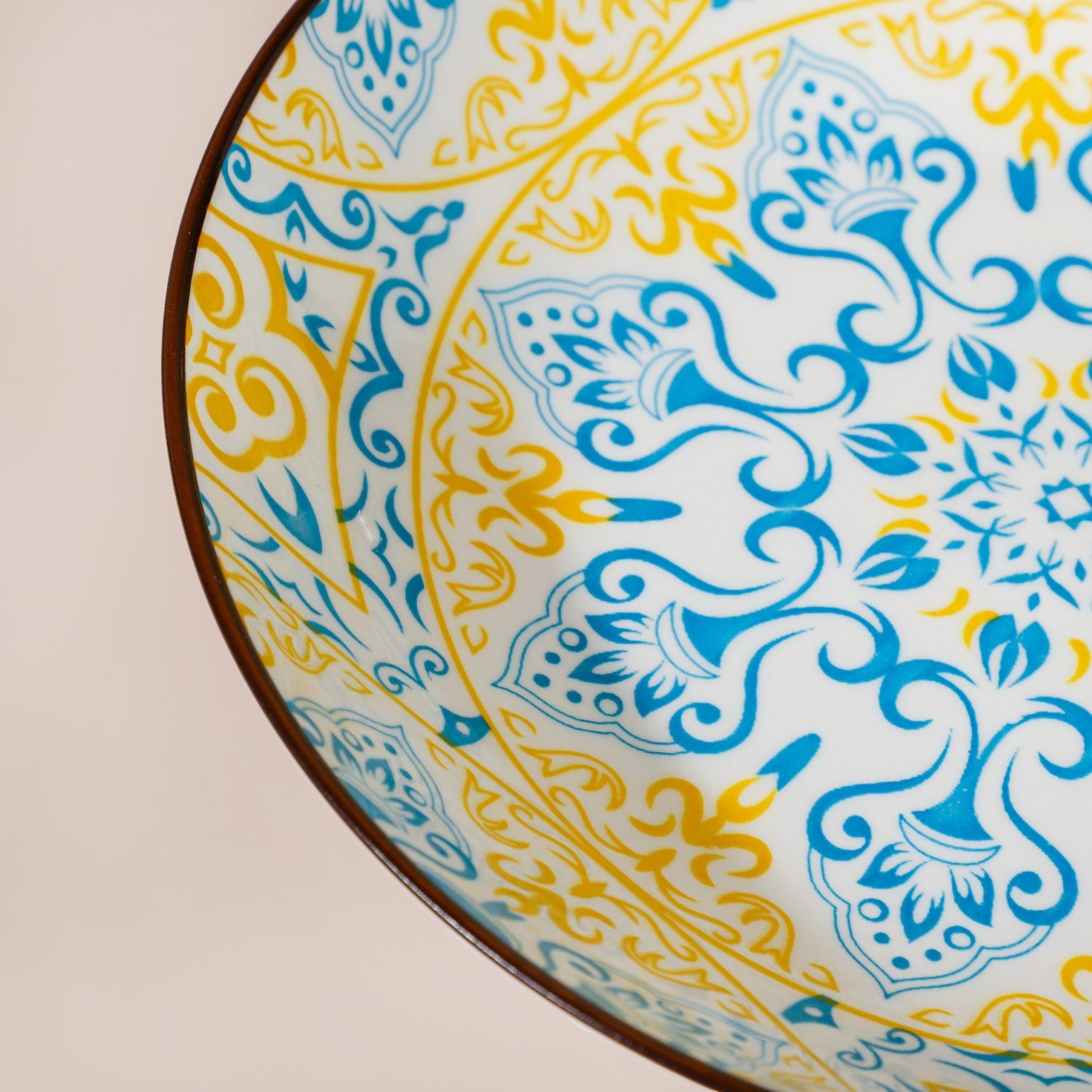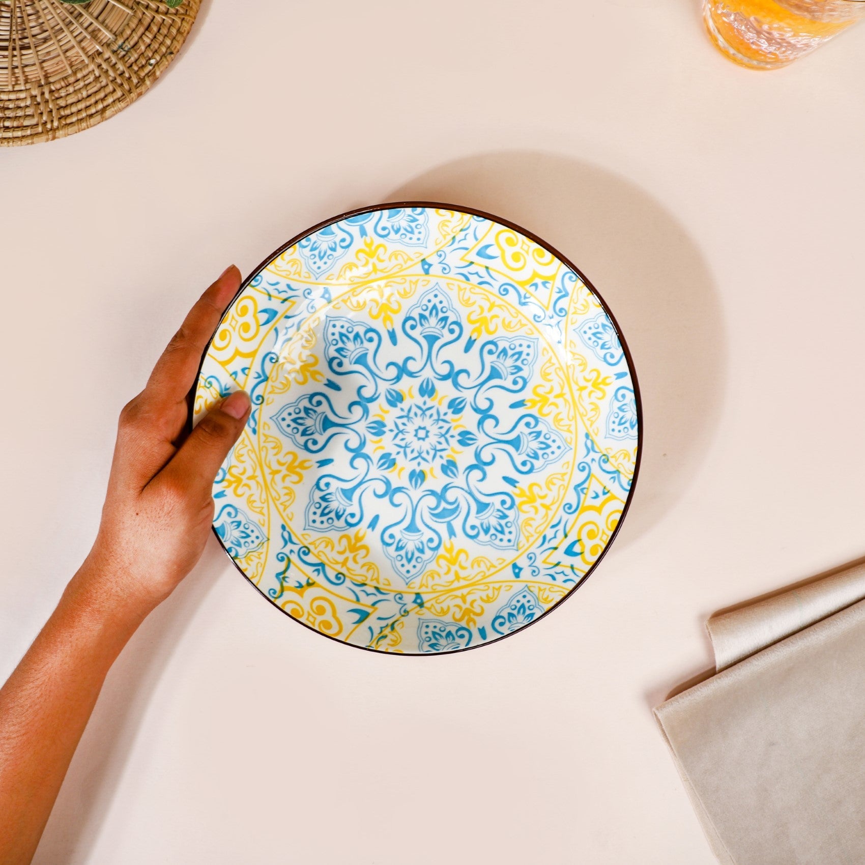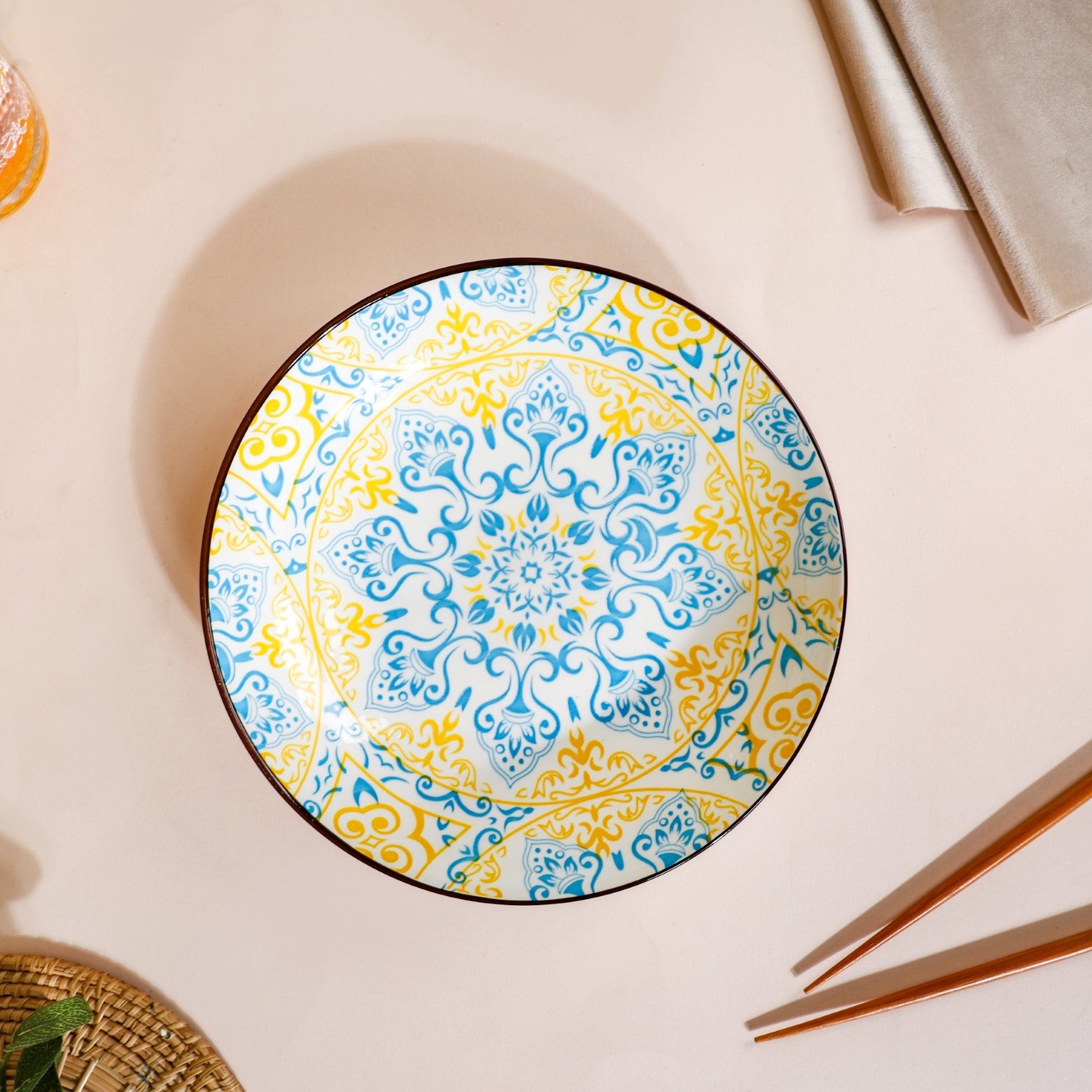 The exquisite ceramic snack plate comes in a set of 2 and features intricate blue and yellow patterns that resemble the beautiful and intricate Mandala designs. The patterns are delicately printed onto a pristine white surface, creating a stunning contrast that will make your snacks stand out. The plate is crafted from high-quality ceramic, ensuring that it's durable and long-lasting. The plate features a brown rim that adds a beautiful contrast against the plate's subtle colours, while the white exterior gives it a clean and modern look. This snack plate is perfect for serving your favourite snacks, whether it's a handful of nuts, a slice of cake, or a delicious cheese board. Its compact size makes it ideal for small gatherings, and the intricate patterns are sure to impress your guests.