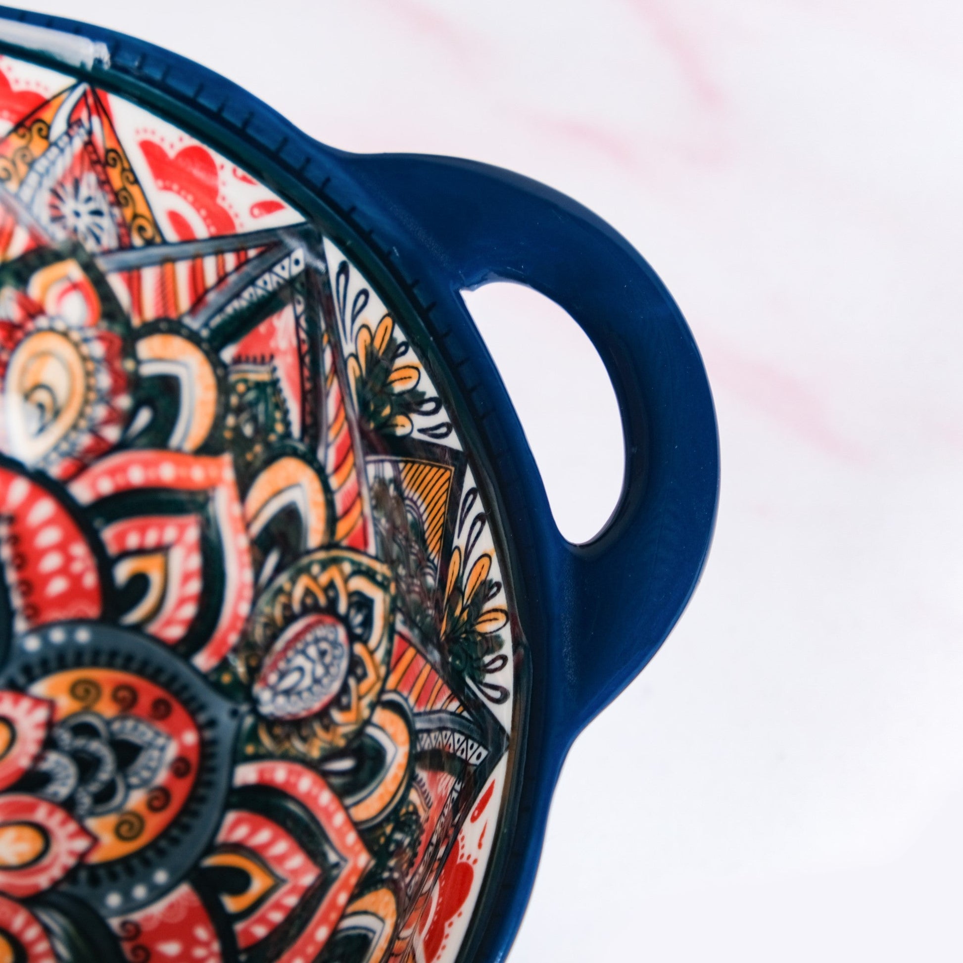 Design: This blue serving bowl creates an appealing contrast with the mandala pattern inside. The vivid floral patterns paired with triangular shapes painted in rich green, yellow, orange, and grey hues create a majestic touch. The slightly wavy rim and the ribbed texture on the outer surface add the illusion of movement, all while making the bowl look sophisticated. What truly stands out are the cute ear-like handles that offer a dash of whimsy while enhancing grip.