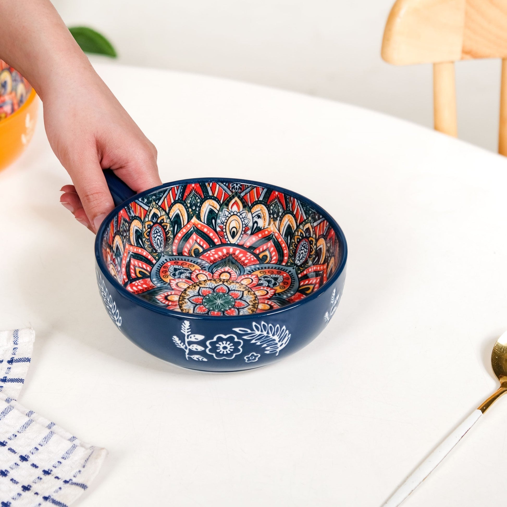 Design: Whether you're serving piping hot soup, cheesy pasta, or a side of sautéed veggies, this bowl adds the missing charm to your table. The interior features an intricate mandala-inspired pattern in hues of red, green, and yellow, contrasted with a deep navy blue base. The exterior is adorned with delicate white floral accents, adding to its bohemian charm and giving it a hand-painted, artisanal appeal. The deep structure and wide mouth make it suitable for both solo meals and sharing portions. Functional yet decorative, it’s a beautiful fusion of utility and design.