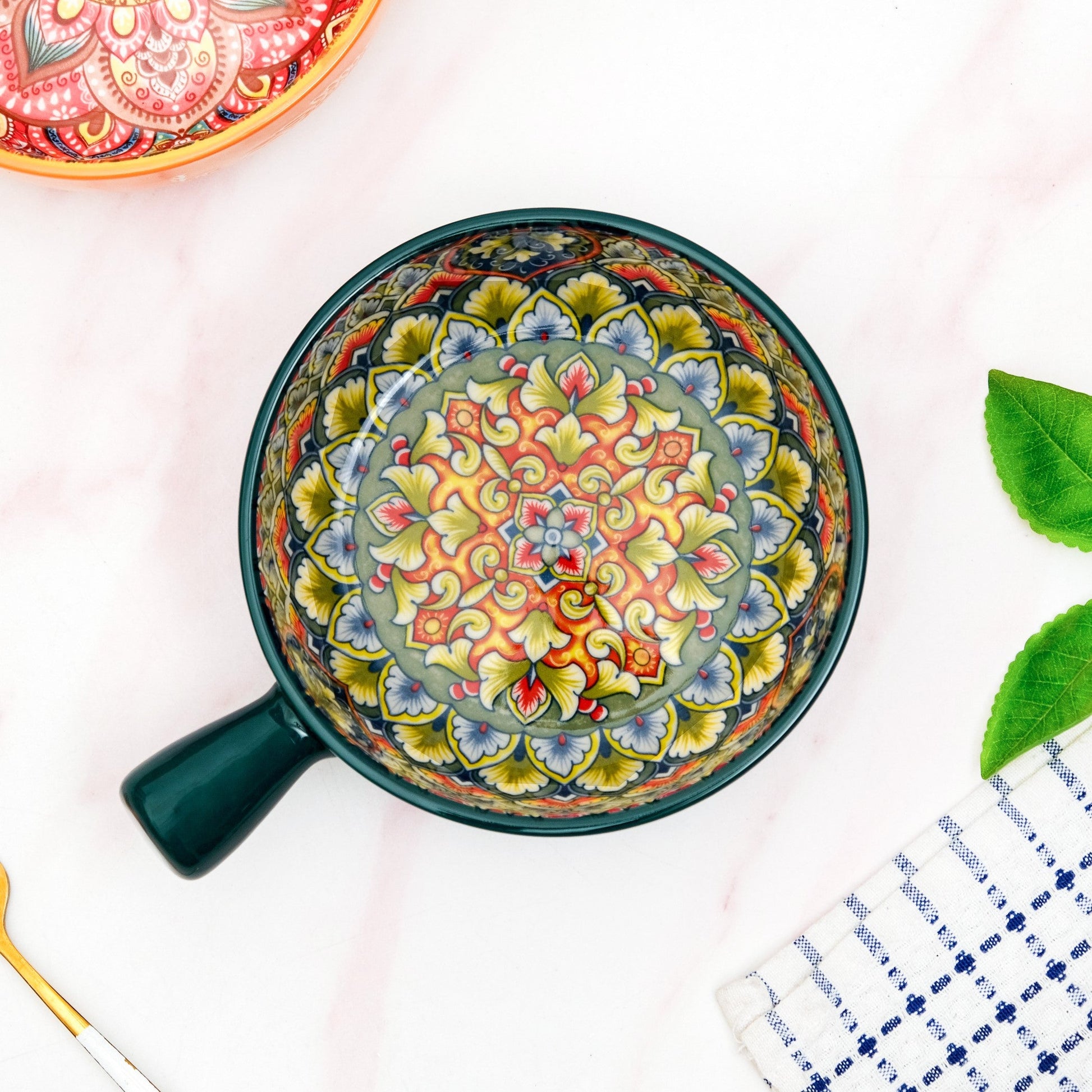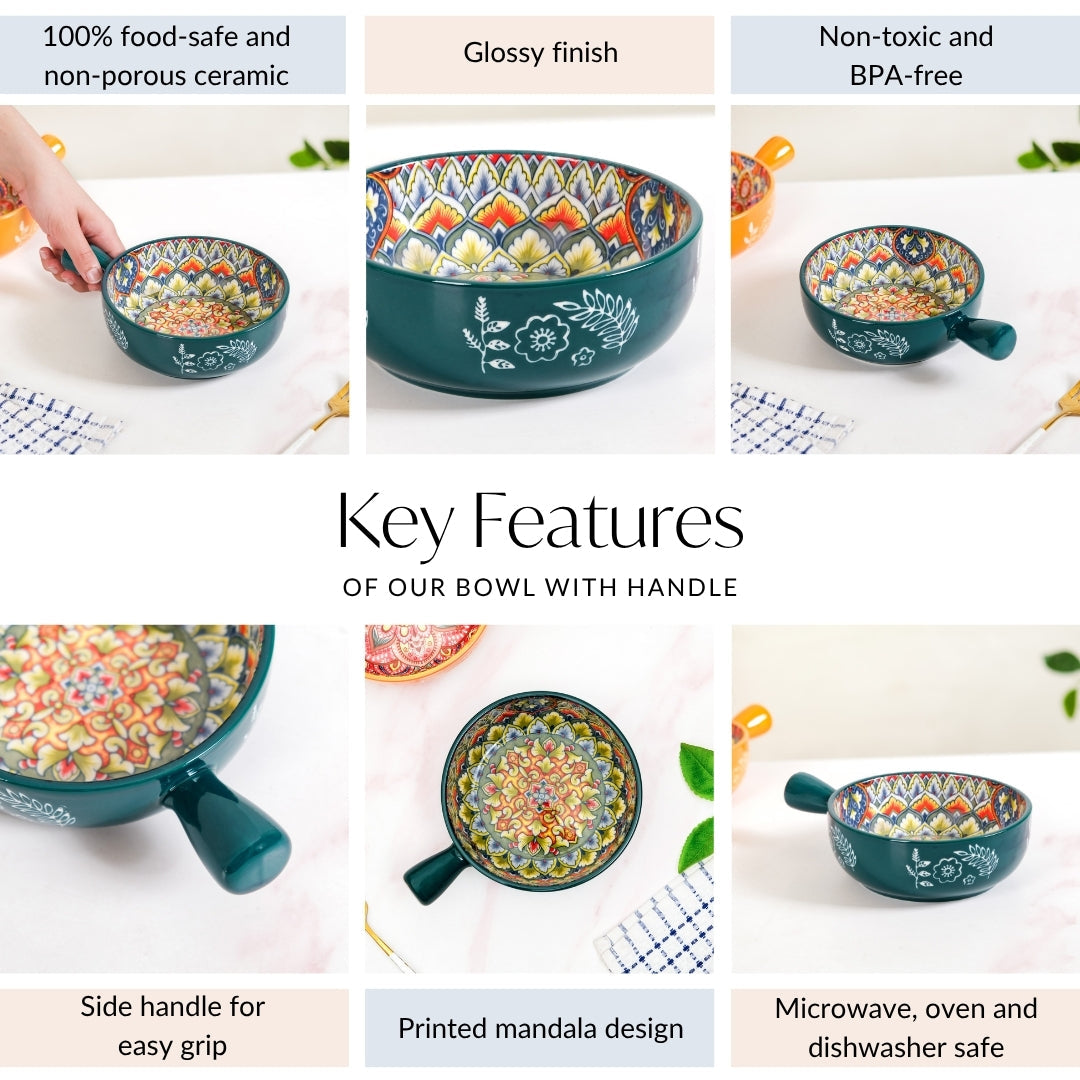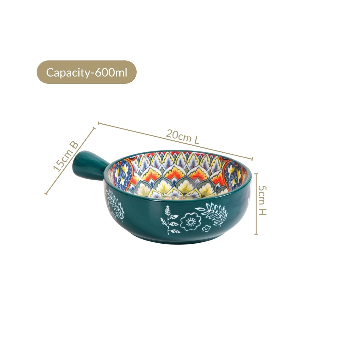 Design: Crafted for both beauty and comfort, this elegant mandala design bowl boasts a rich, deep green exterior, beautifully contrasted with delicate white botanical patterns that give it an artisanal, hand-painted charm. Peer inside to discover an intricate mandala, blooming with a symphony of blue, red, yellow, white, and orange hues. Each swirl and detail speaks of meticulous craftsmanship, making every meal a visual delight. Its ergonomic handle ensures a comfortable grip, while the generous capacity and wide mouth make it ideal for everything from hearty soups to individual pasta servings, or even a side dish for sharing.