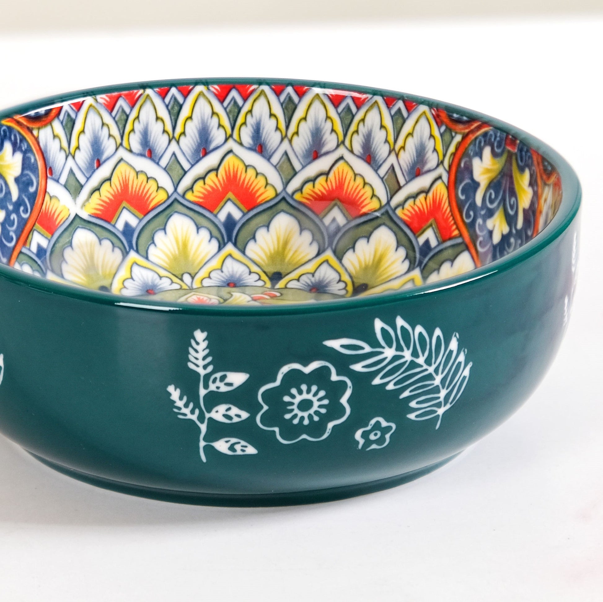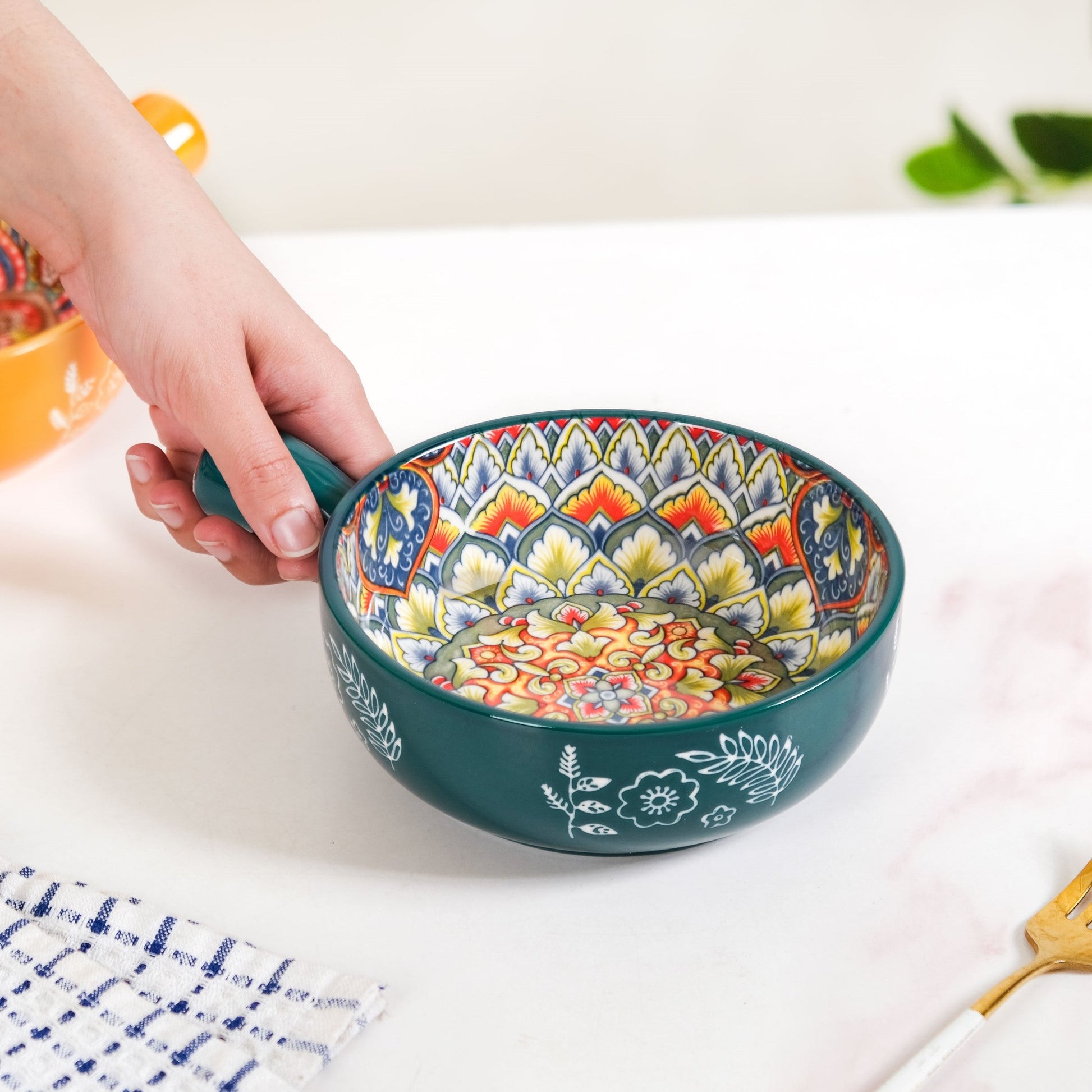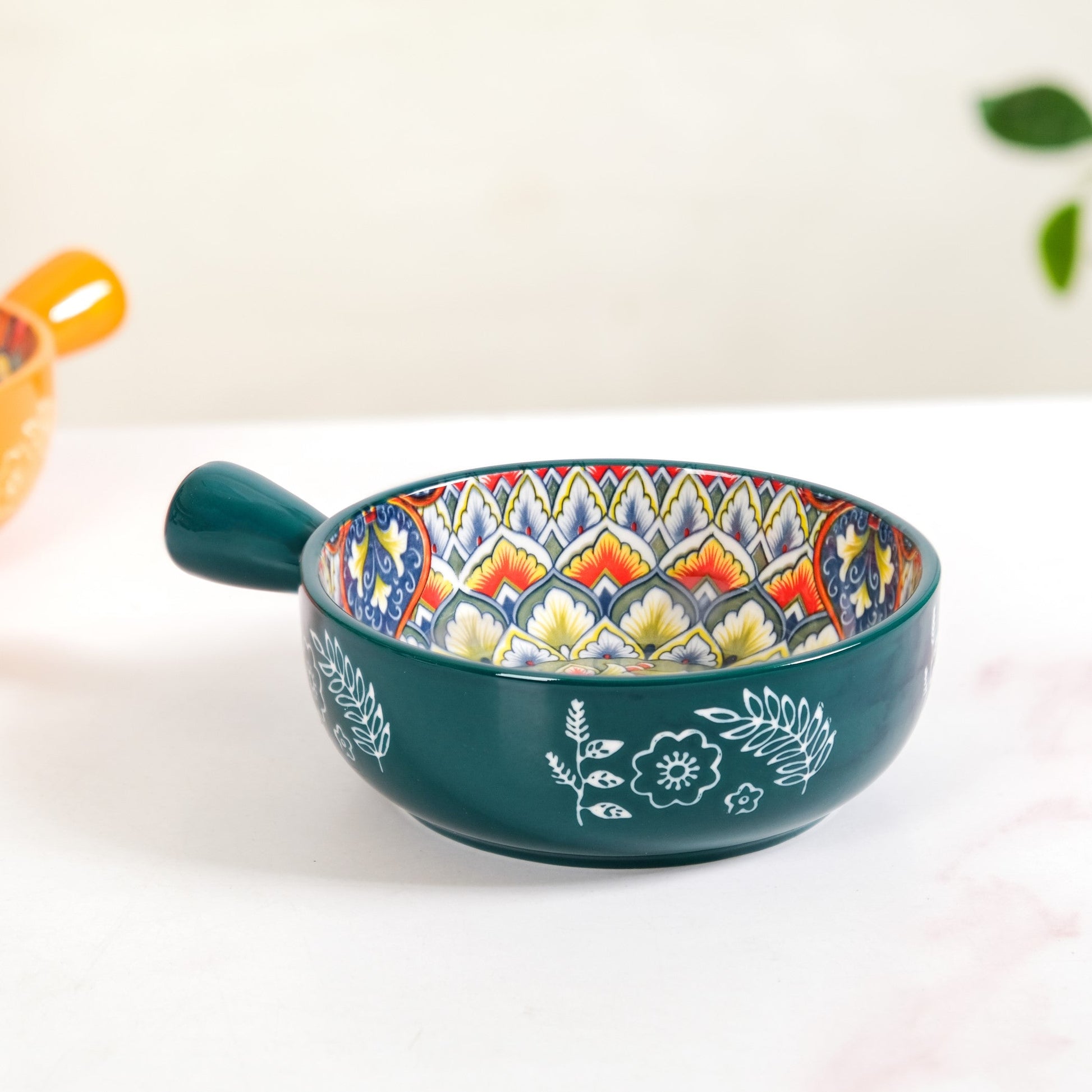 Design: Crafted for both beauty and comfort, this elegant mandala design bowl boasts a rich, deep green exterior, beautifully contrasted with delicate white botanical patterns that give it an artisanal, hand-painted charm. Peer inside to discover an intricate mandala, blooming with a symphony of blue, red, yellow, white, and orange hues. Each swirl and detail speaks of meticulous craftsmanship, making every meal a visual delight. Its ergonomic handle ensures a comfortable grip, while the generous capacity and wide mouth make it ideal for everything from hearty soups to individual pasta servings, or even a side dish for sharing.