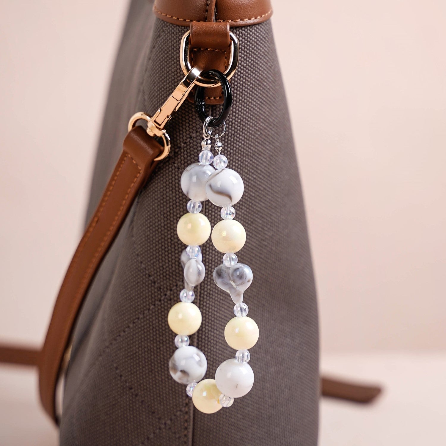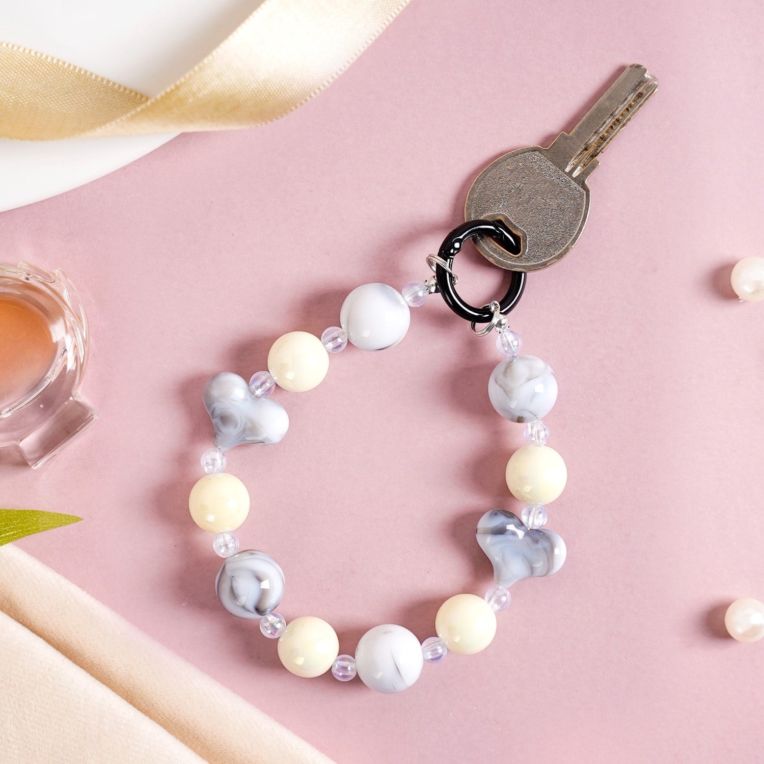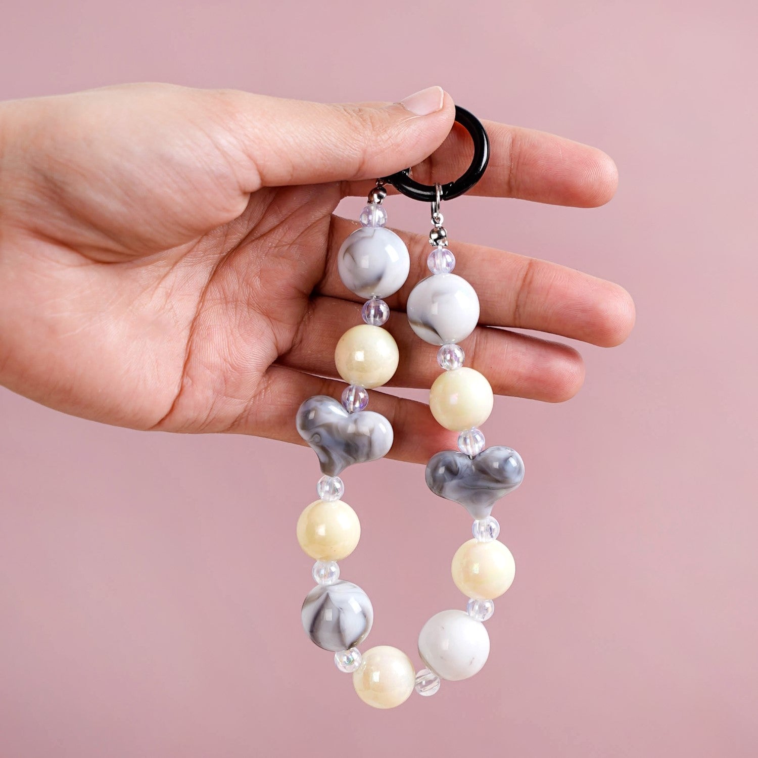 Add a touch of elegance to your accessories with this stunning keychain. Featuring a black metal lobster clasp hook at the top, the keychain is adorned with a sequence of beads in transparent, grey, and off-white hues combined with small grey hearts. The transparent beads exude an iridescent glow, adding a subtle sparkle, while the grey round and heart-shaped beads have a beautiful marbled appearance.